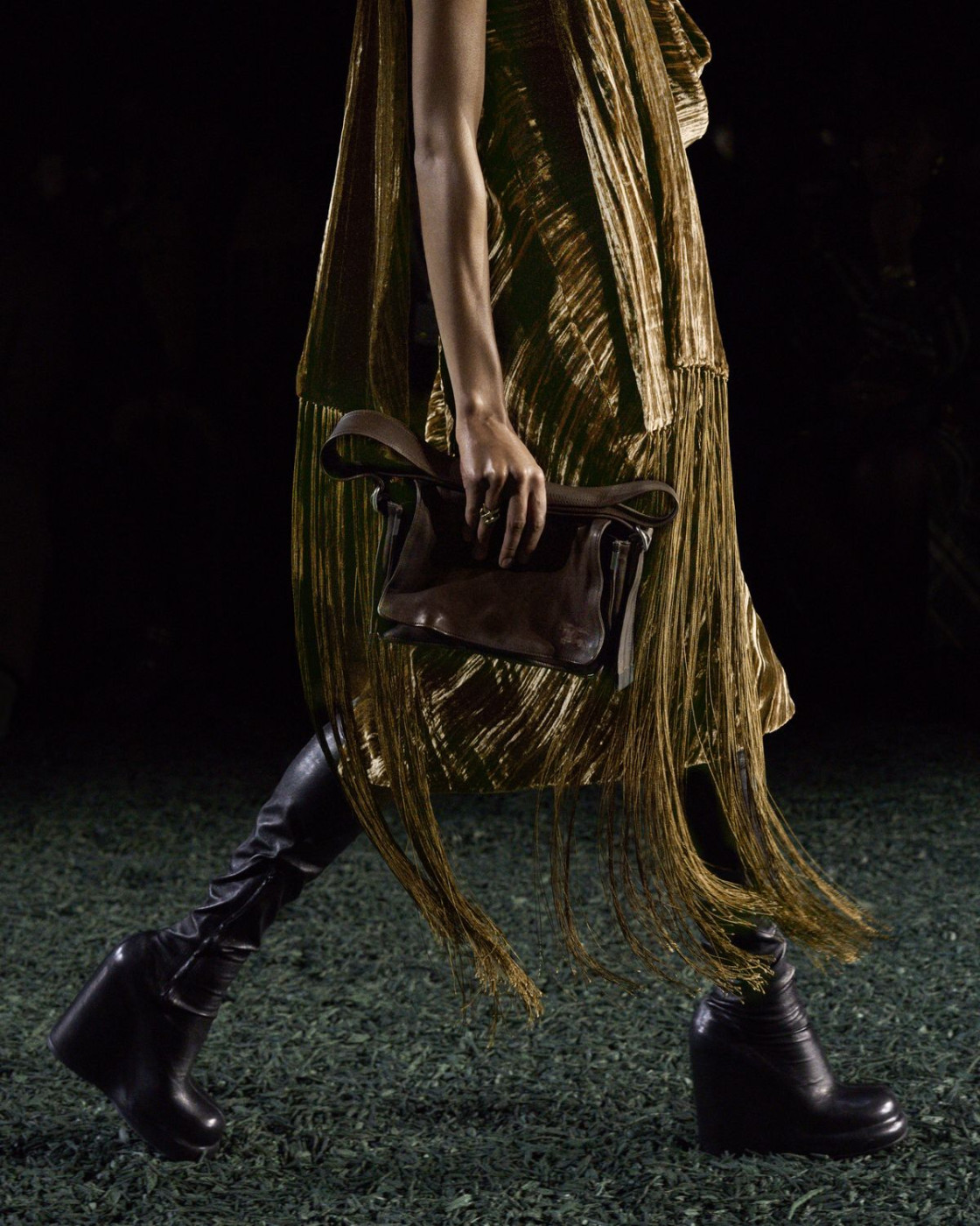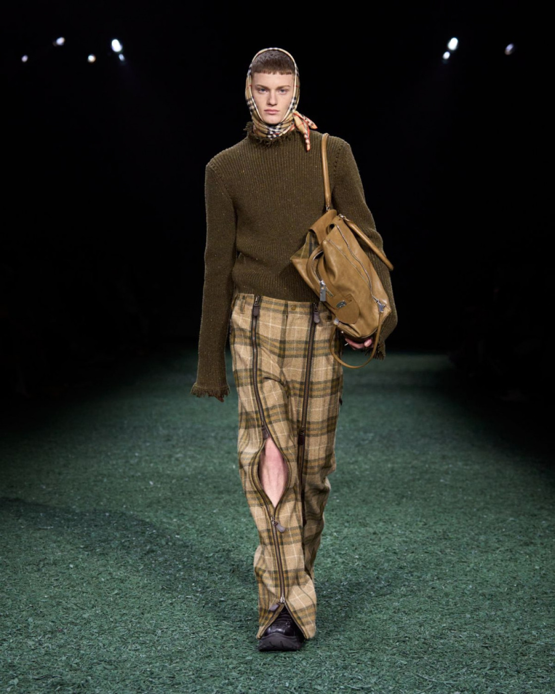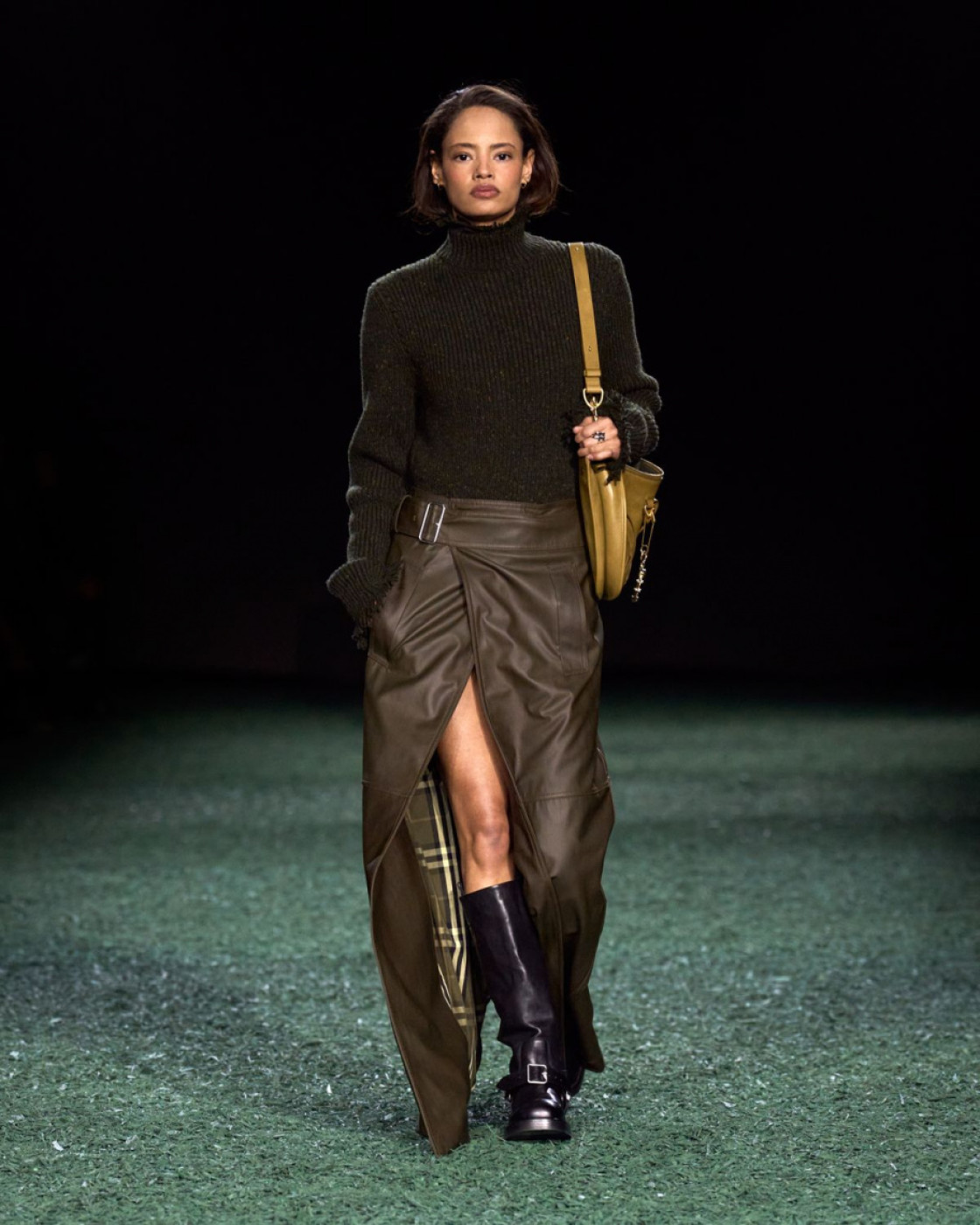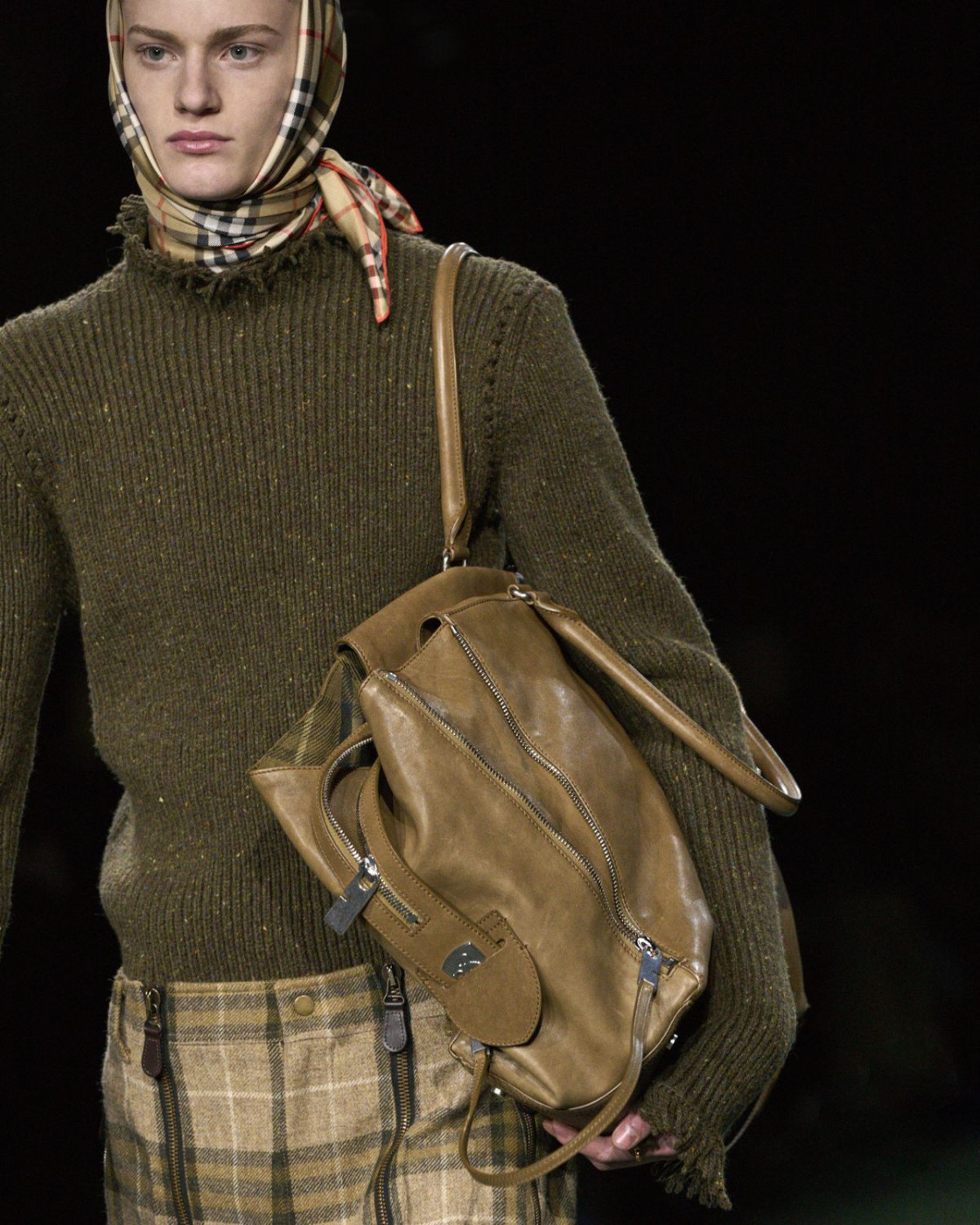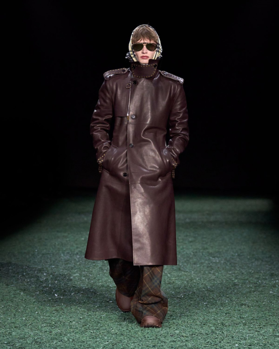 For next autumn, Daniel Lee prepared for us a wardrobe of cozy knits with fringes, long almost touching the floor leather, kilt and pleated skirts (with checked insides, of course), matched with coolest V-neck sweaters. A great styling trick, some of Lee’s models were wearing checked scarves on their heads, and did look like British football fans. Later, backstage Lee said that it’s also a nod to the late Queen Elisabeth II, who famously loved covering her hair with a scarf, when taking a walk with her corgis in her favourite Balmoral Castle in Scotland.