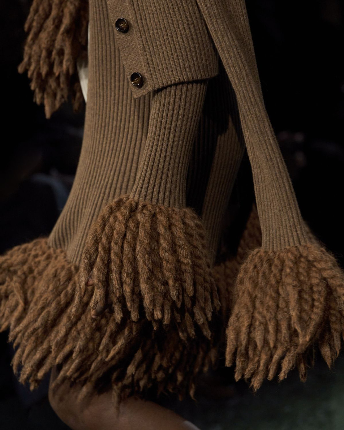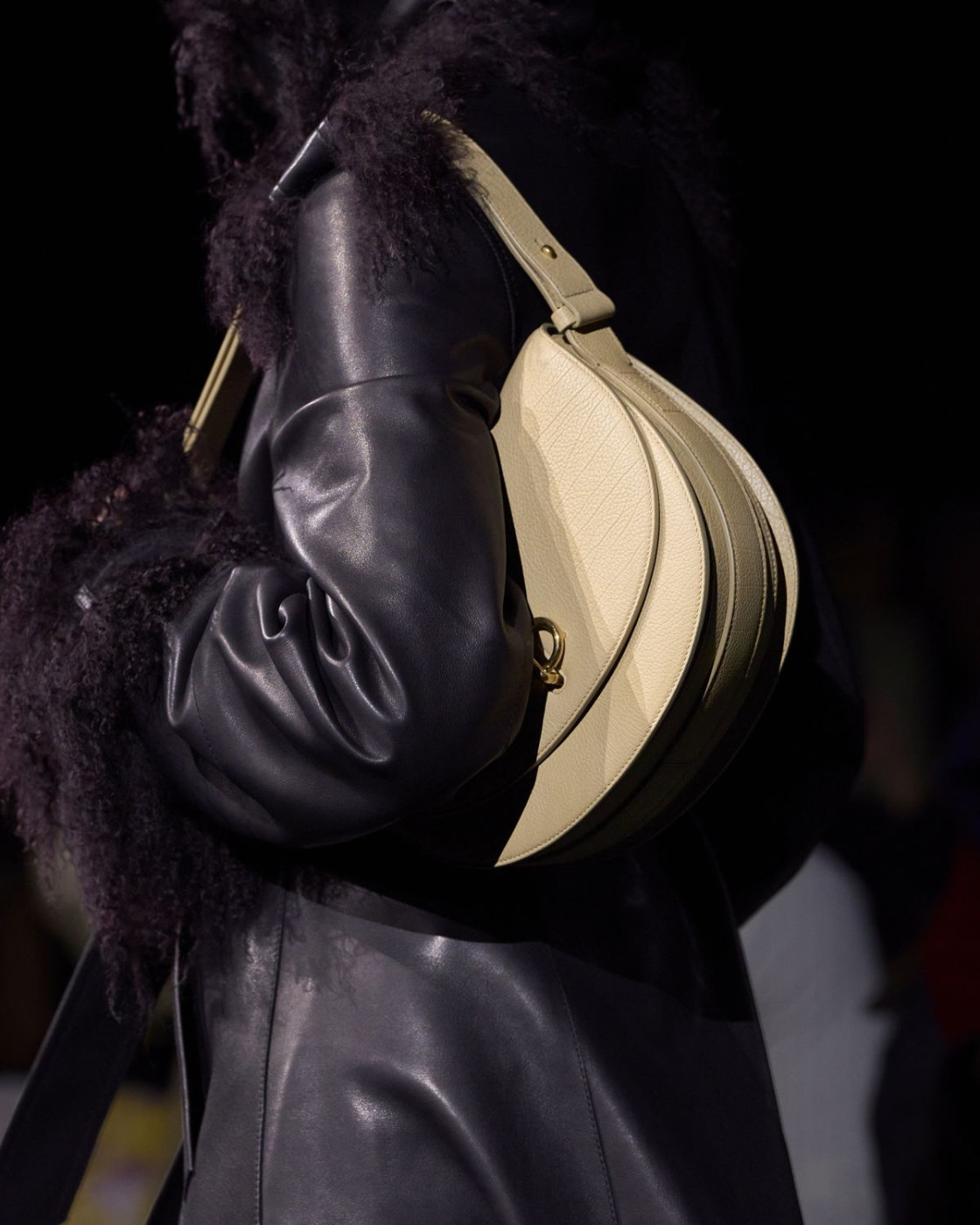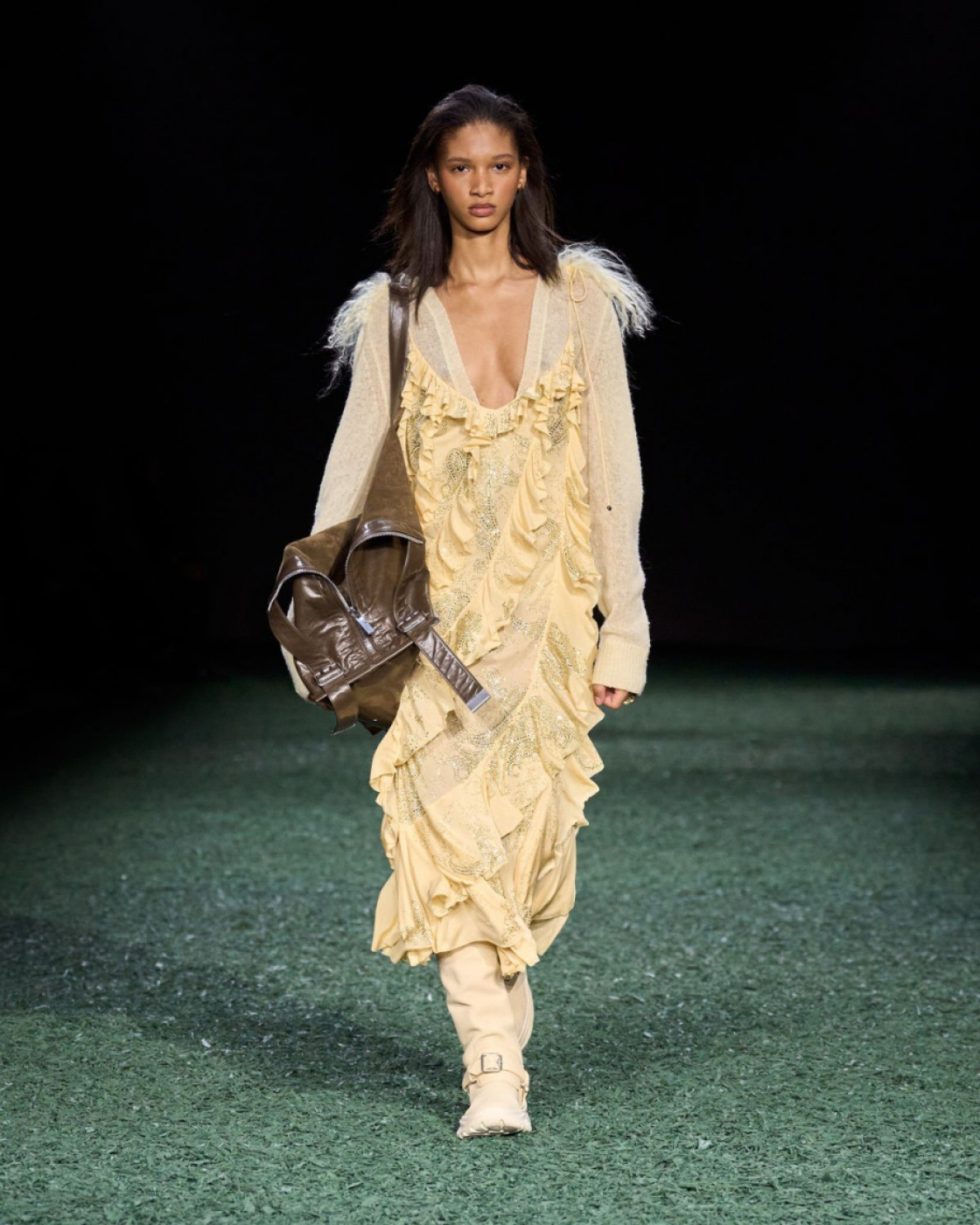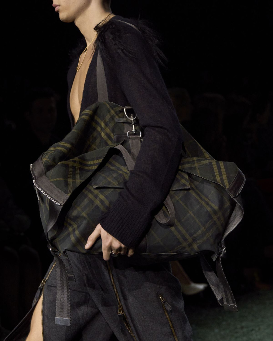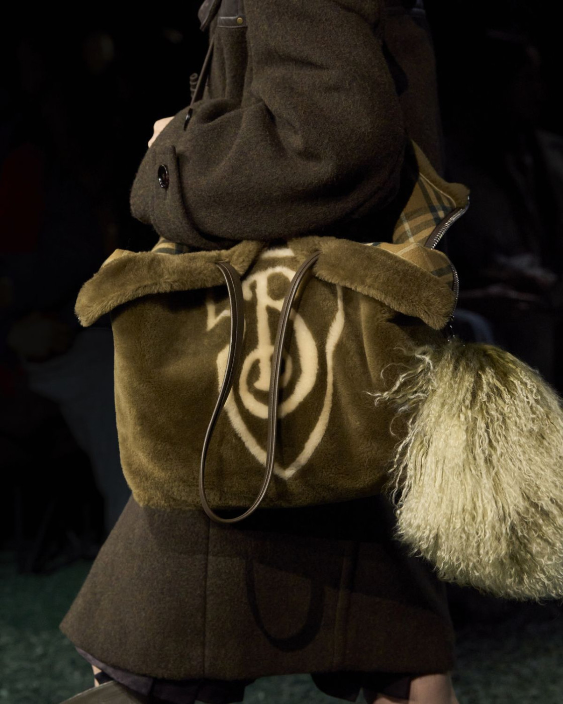 For next autumn, Daniel Lee prepared for us a wardrobe of cozy knits with fringes, long almost touching the floor leather, kilt and pleated skirts (with checked insides, of course), matched with coolest V-neck sweaters. A great styling trick, some of Lee’s models were wearing checked scarves on their heads, and did look like British football fans. Later, backstage Lee said that it’s also a nod to the late Queen Elisabeth II, who famously loved covering her hair with a scarf, when taking a walk with her corgis in her favourite Balmoral Castle in Scotland.