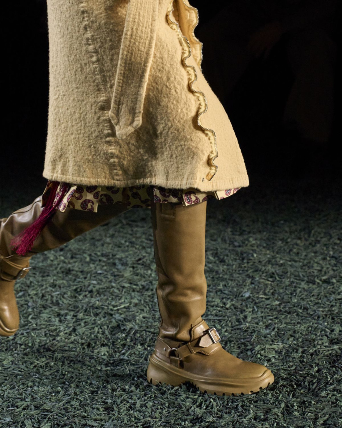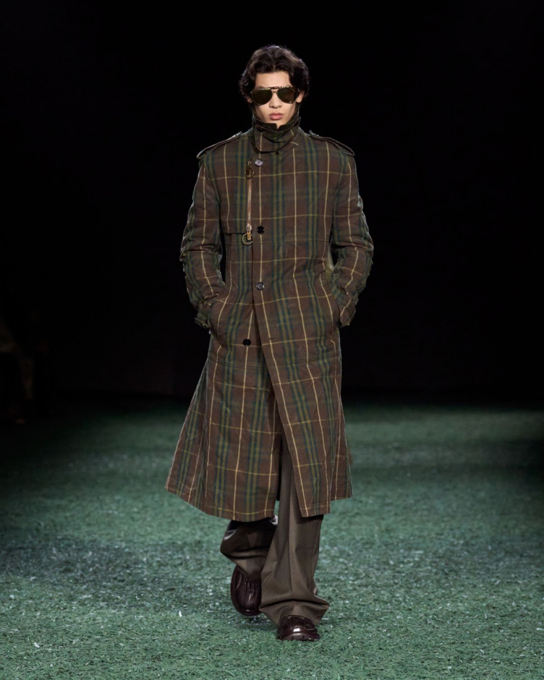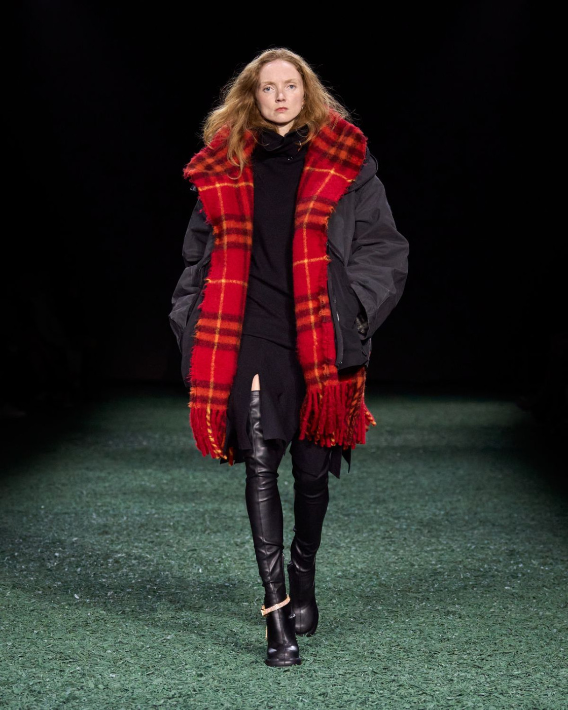 True to his tradition of showing outdoors and touring around London’s greatest parks, Daniel Lee staged his third show for the iconic British house in a giant tent, installed in East London’s Victoria Park. “We wanted to create a sense of the outdoors within the show space itself. I wanted it to feel like a forest at night”, the designer explained in his show notes. Well, with models walking on the green carpet, it did look like the outdoors.