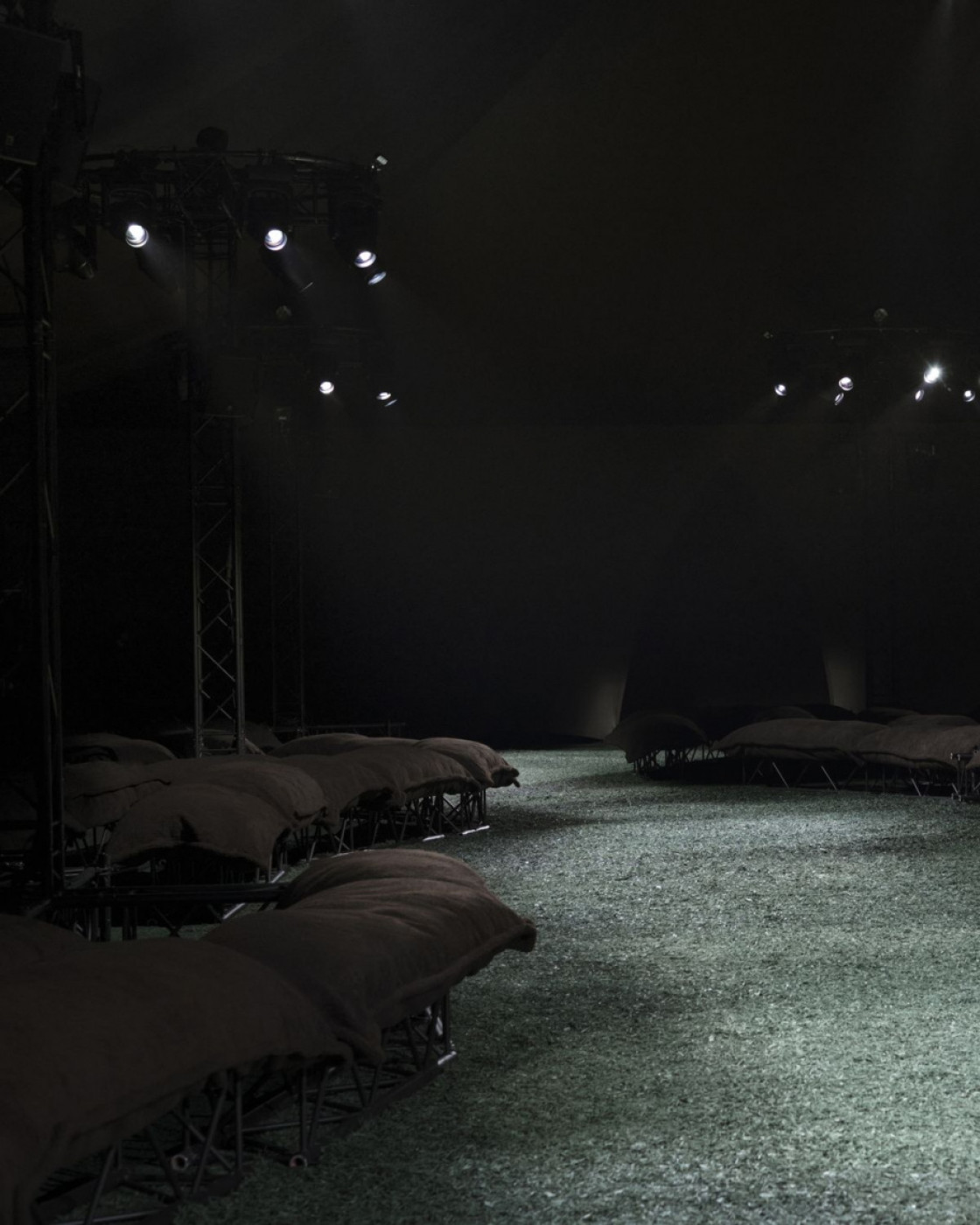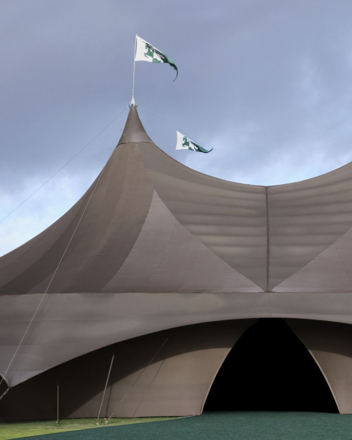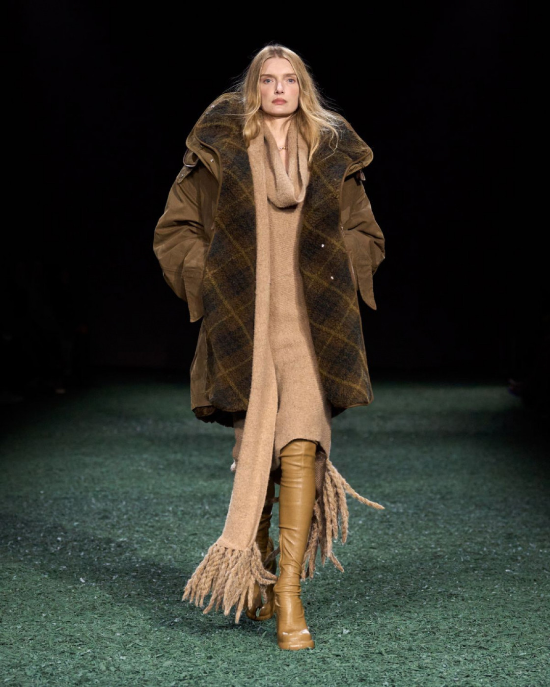 True to his tradition of showing outdoors and touring around London’s greatest parks, Daniel Lee staged his third show for the iconic British house in a giant tent, installed in East London’s Victoria Park. “We wanted to create a sense of the outdoors within the show space itself. I wanted it to feel like a forest at night”, the designer explained in his show notes. Well, with models walking on the green carpet, it did look like the outdoors.