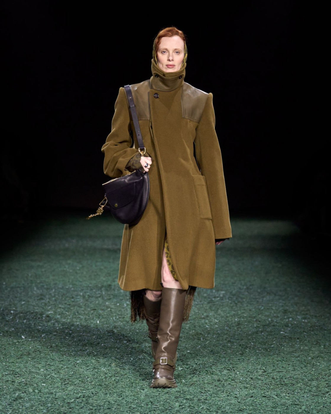 Another British icon was on the soundtrack: Daniel Lee chose his favorite hits from Amy Winehouse (think, “You Know I'm No Good”, “Back to Black” and “Half Time”). His cast was quintessentially British, as well. Veteran model Agyness Deyn opened the show in a gray wool trench, followed by Lily Cole (her look with the red scarf and cuissard high boots was a show-stopper), Lily Donaldson, Karen Elson and Naomi Campbell, who gorgeously marched in a sparkling crochet evening gown in the hue of moss that would cost a fortune. What other surprises did Daniel Lee have in stock for us? No one could have expected that Maya Wigram, Phoebe Philo’s daughter, would close the show in a leather jacket and a kilt, clutching a black umbrella in her hands.