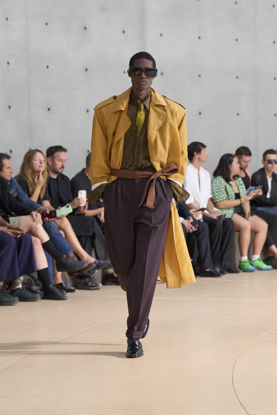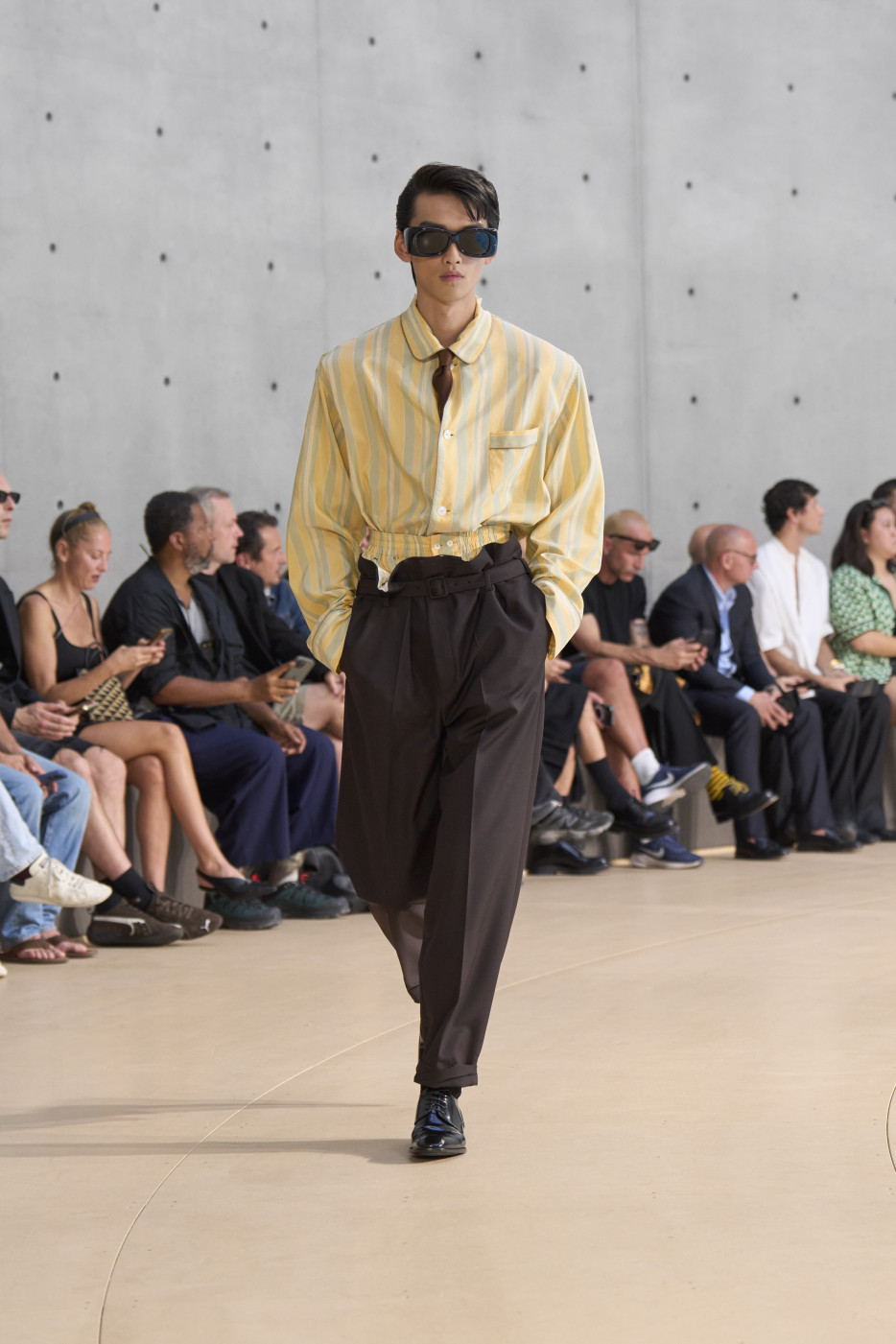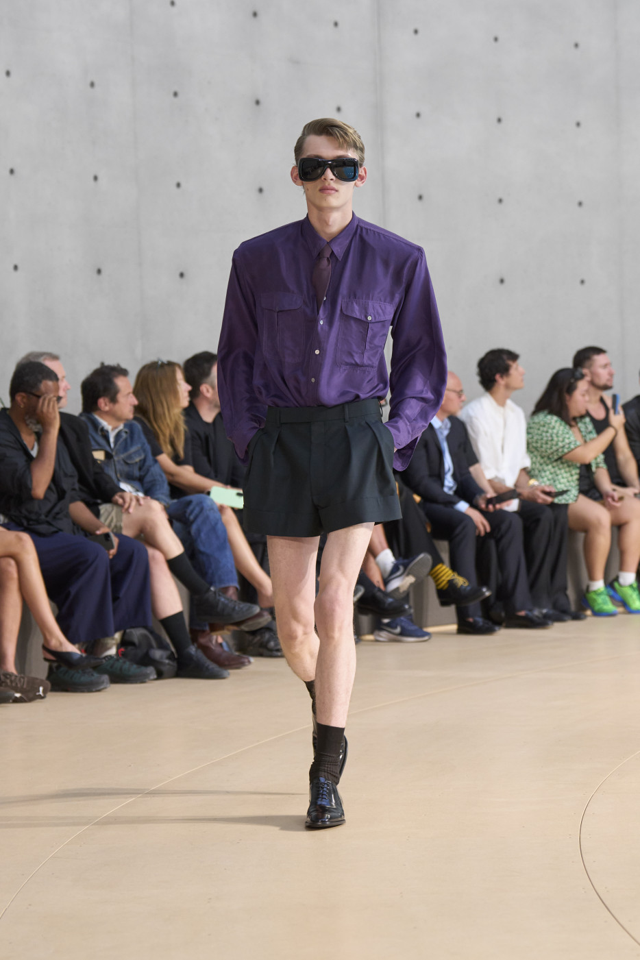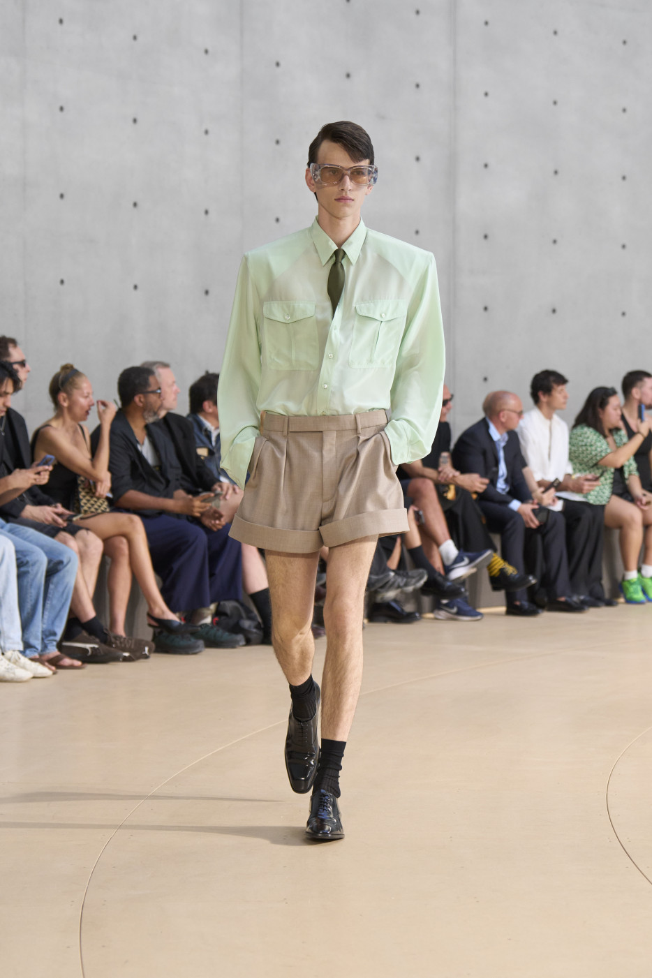 But if we mention shorts, we must also highlight the waistline—accentuated by a belt pulled tight to reveal the white tailoring inside the waistband. Many of the trousers followed this design. And regarding shirts, it’s worth noting that this time, Vaccarello’s signature broad shoulders could be softened: if the shoulder pads are removed, the silhouette becomes more soft and flowing. Still, a certain formality remained, thanks to the ties that accompanied nearly every look—tight, twisted, and tucked precisely at the third button from the top. The ties could be tone-on-tone or, conversely, contrasting—but the styling remained consistent.