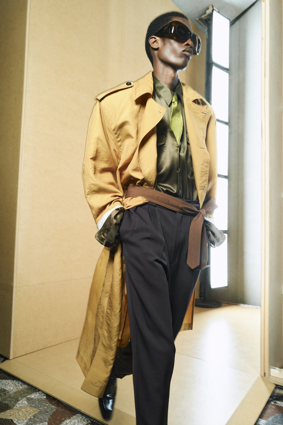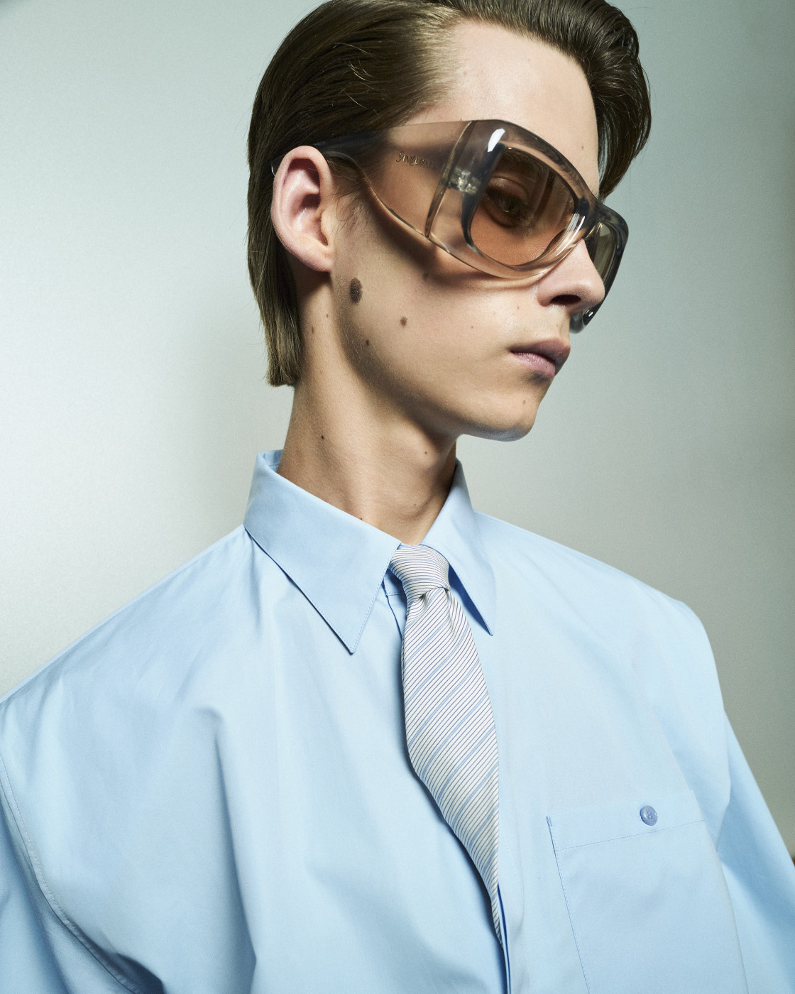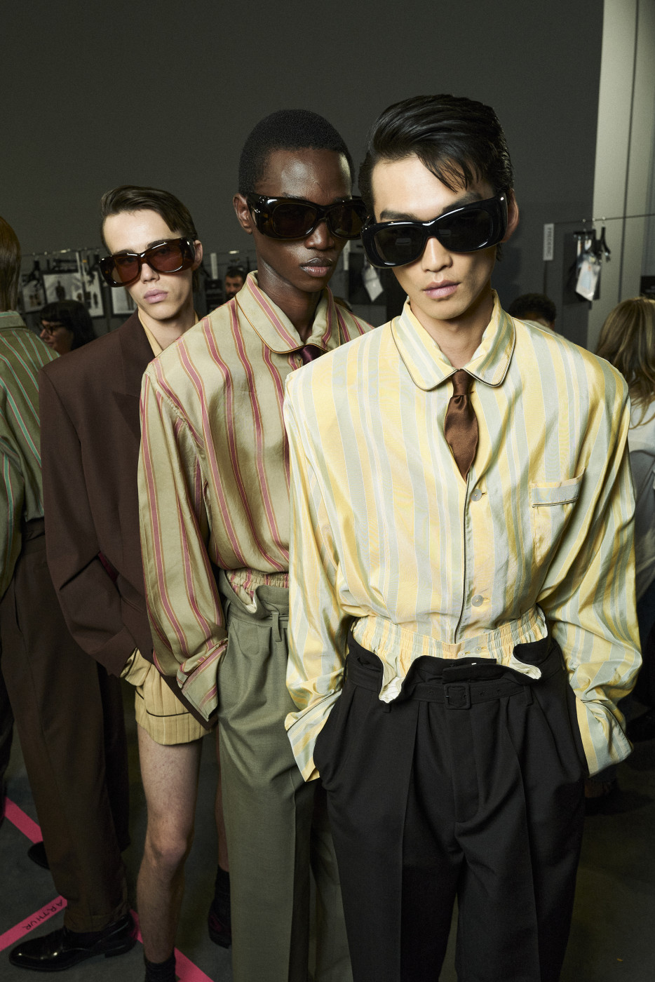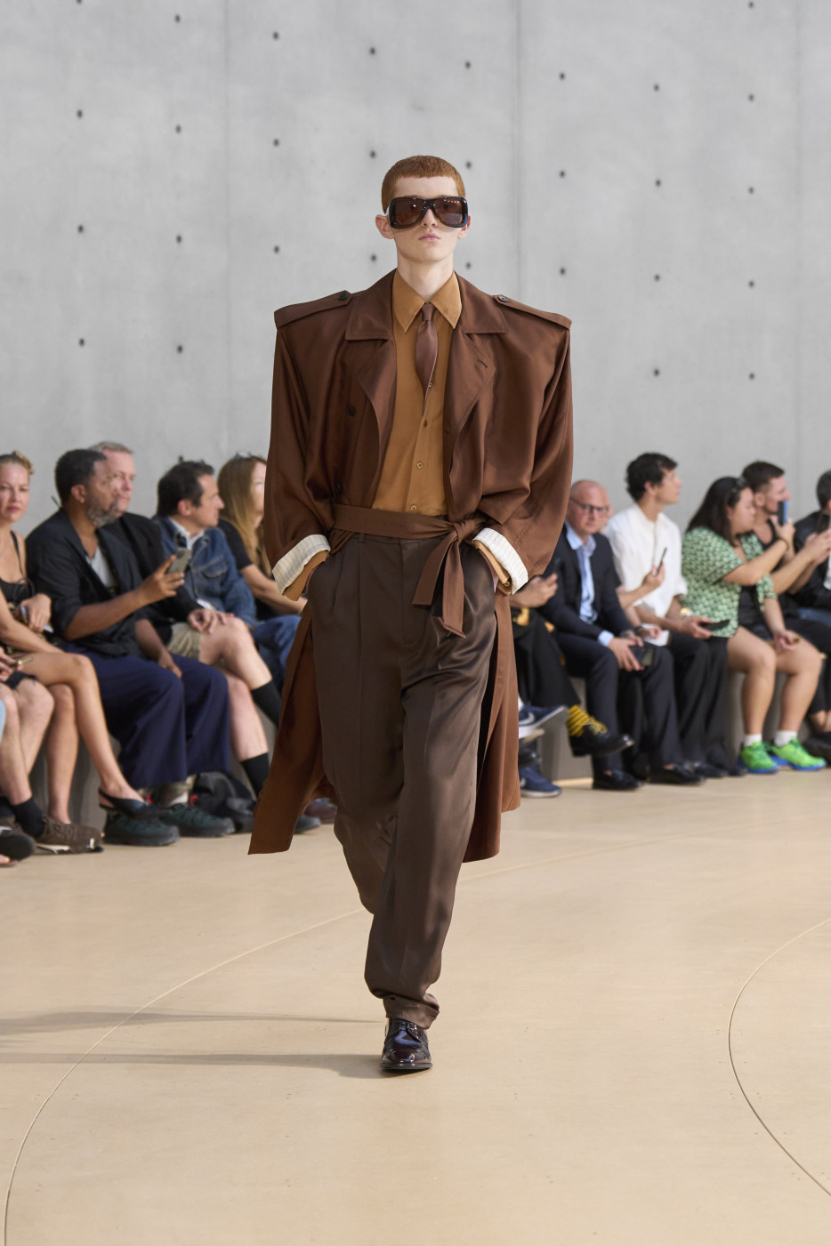 But if we mention shorts, we must also highlight the waistline—accentuated by a belt pulled tight to reveal the white tailoring inside the waistband. Many of the trousers followed this design. And regarding shirts, it’s worth noting that this time, Vaccarello’s signature broad shoulders could be softened: if the shoulder pads are removed, the silhouette becomes more soft and flowing. Still, a certain formality remained, thanks to the ties that accompanied nearly every look—tight, twisted, and tucked precisely at the third button from the top. The ties could be tone-on-tone or, conversely, contrasting—but the styling remained consistent.