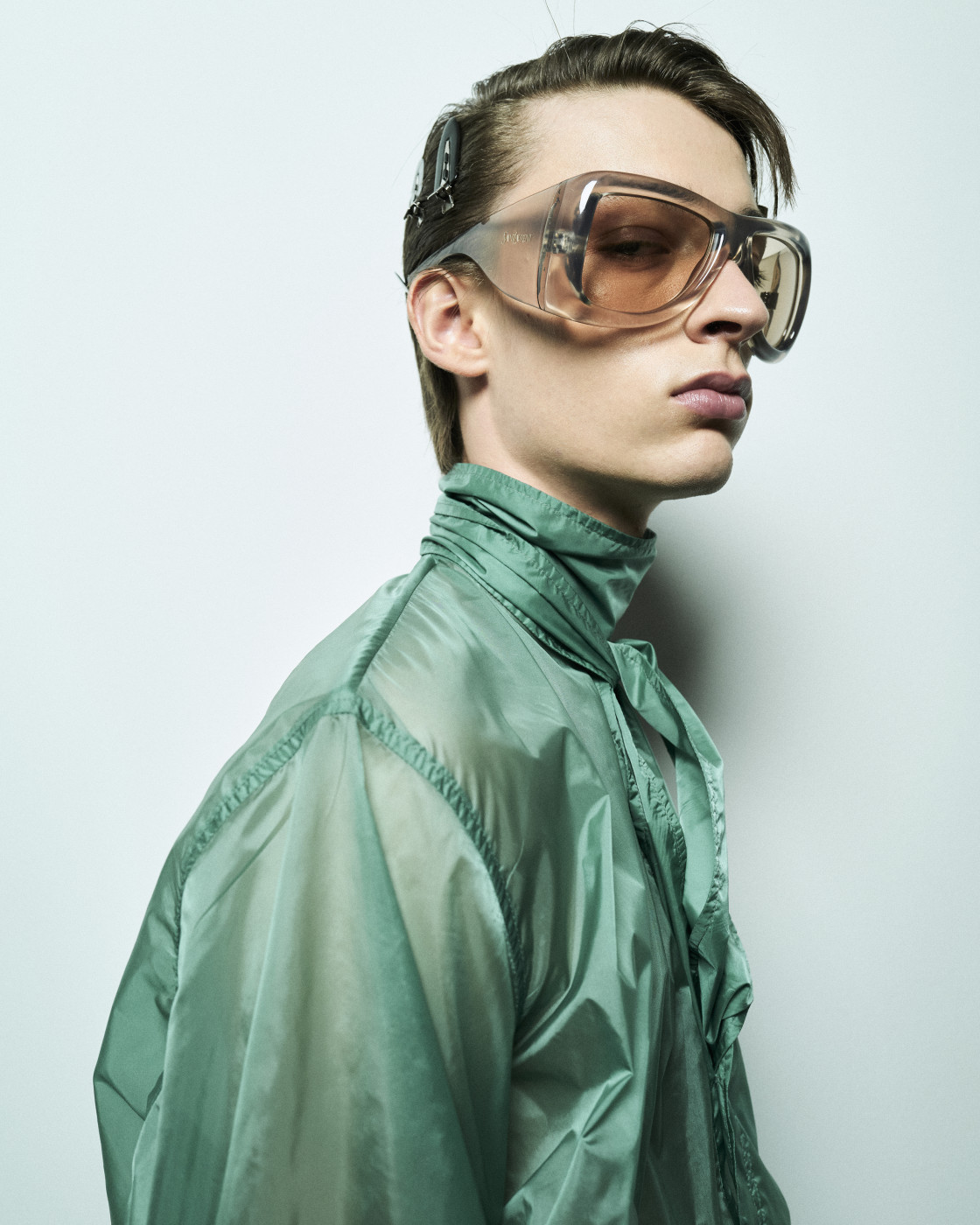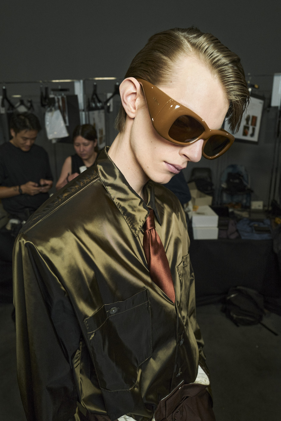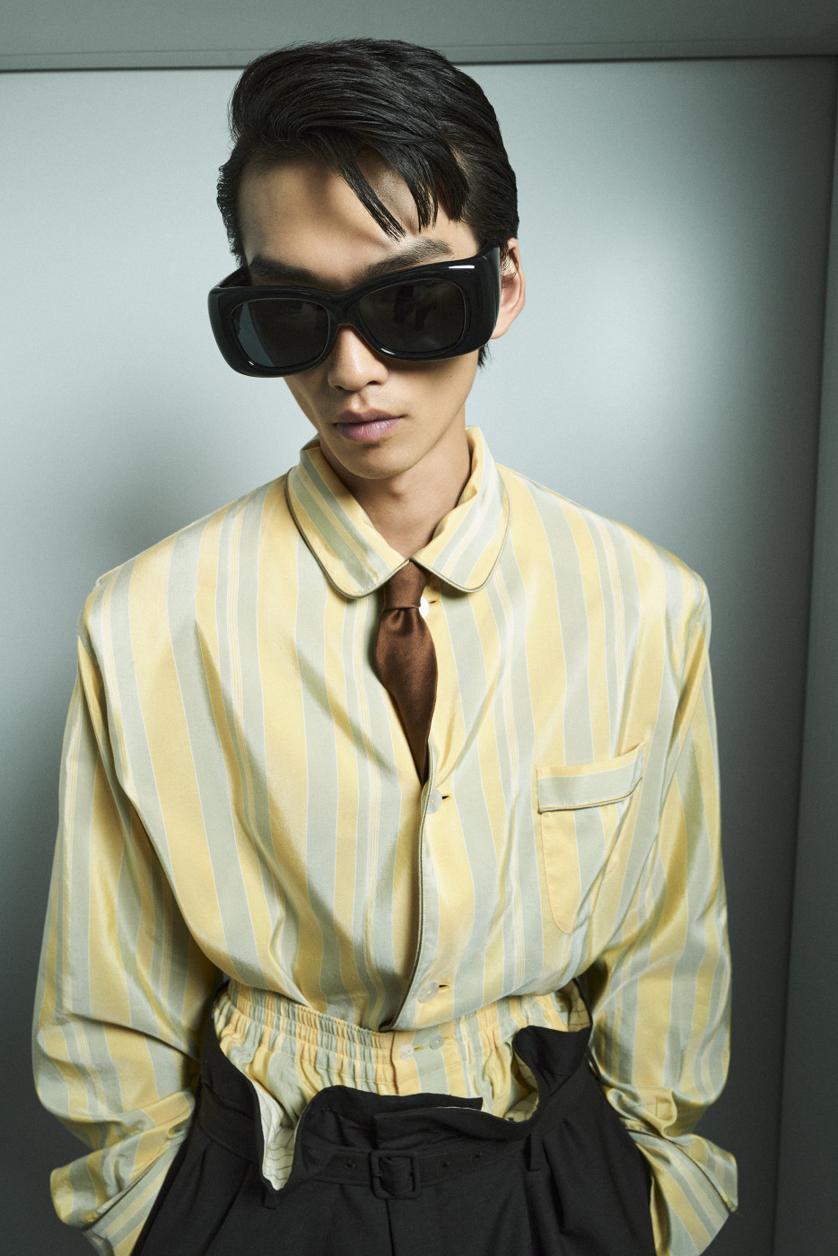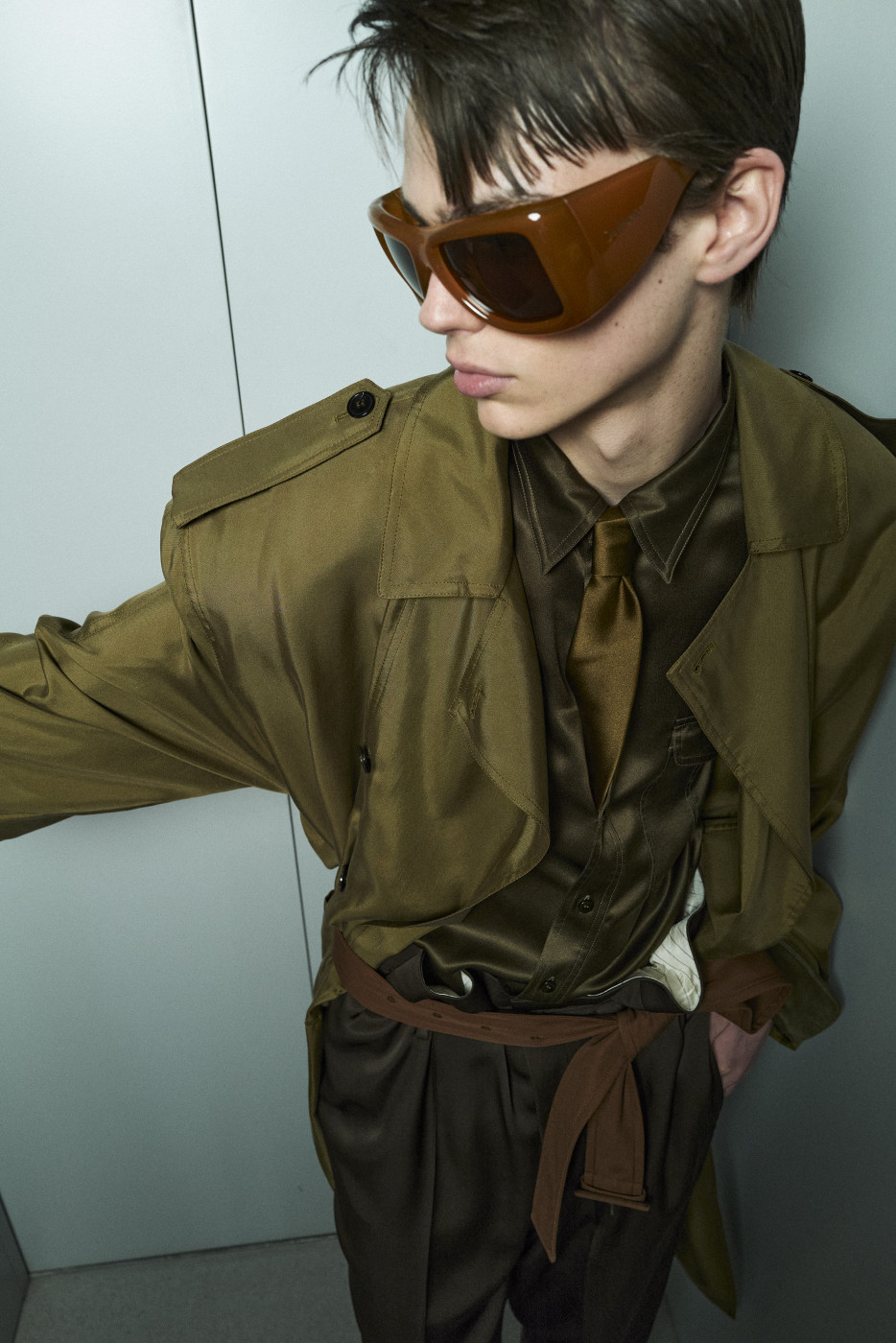 But if we mention shorts, we must also highlight the waistline—accentuated by a belt pulled tight to reveal the white tailoring inside the waistband. Many of the trousers followed this design. And regarding shirts, it’s worth noting that this time, Vaccarello’s signature broad shoulders could be softened: if the shoulder pads are removed, the silhouette becomes more soft and flowing. Still, a certain formality remained, thanks to the ties that accompanied nearly every look—tight, twisted, and tucked precisely at the third button from the top. The ties could be tone-on-tone or, conversely, contrasting—but the styling remained consistent.