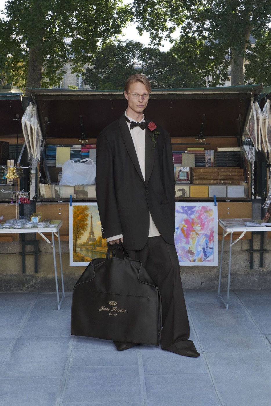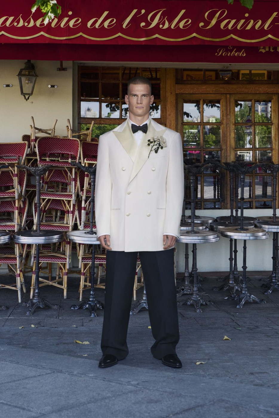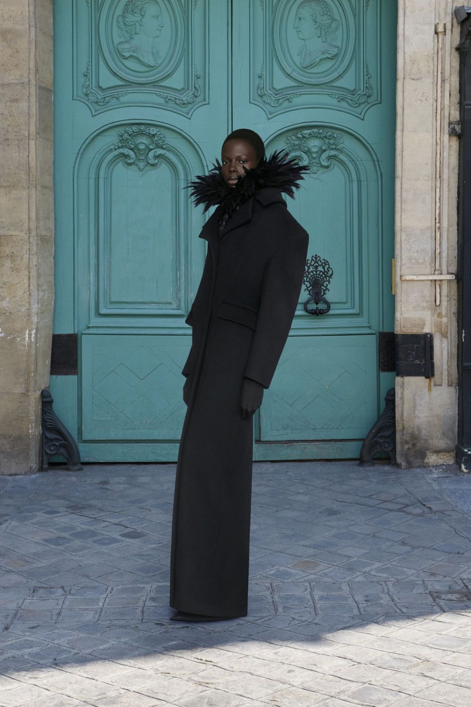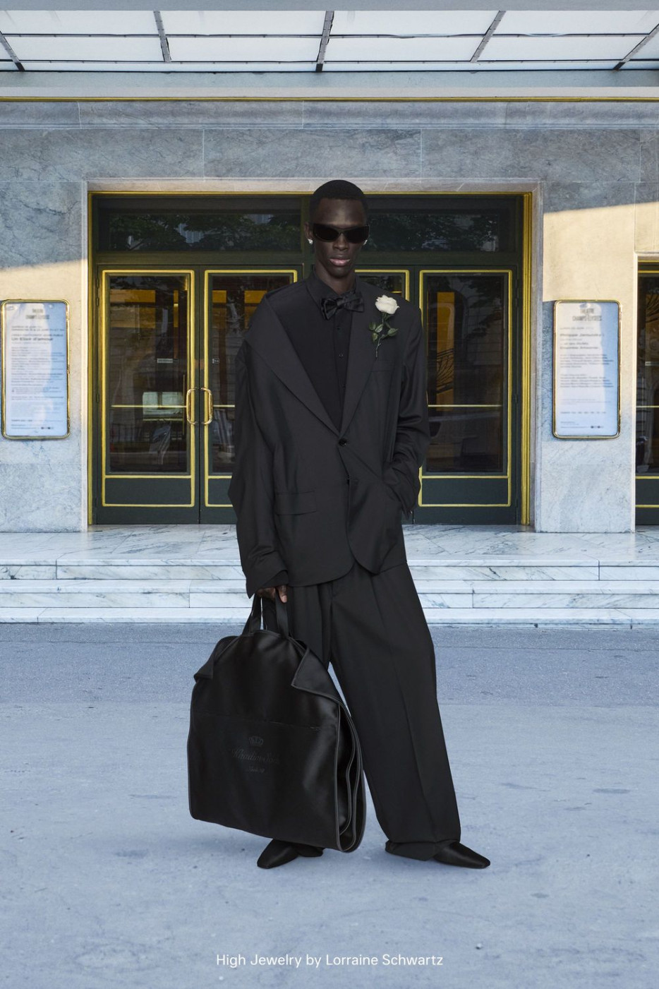 In an unexpected twist for couture, the collection included a series of tailored suits — nine in total — developed in collaboration with four family-run ateliers from Naples. Designed as “one-size-fits-all” and originally cut for a bodybuilder, the suits were then styled on models of all shapes and sizes. “It is not the garment that defines the body, but the body that defines the garment,” Demna stated in his notes.
