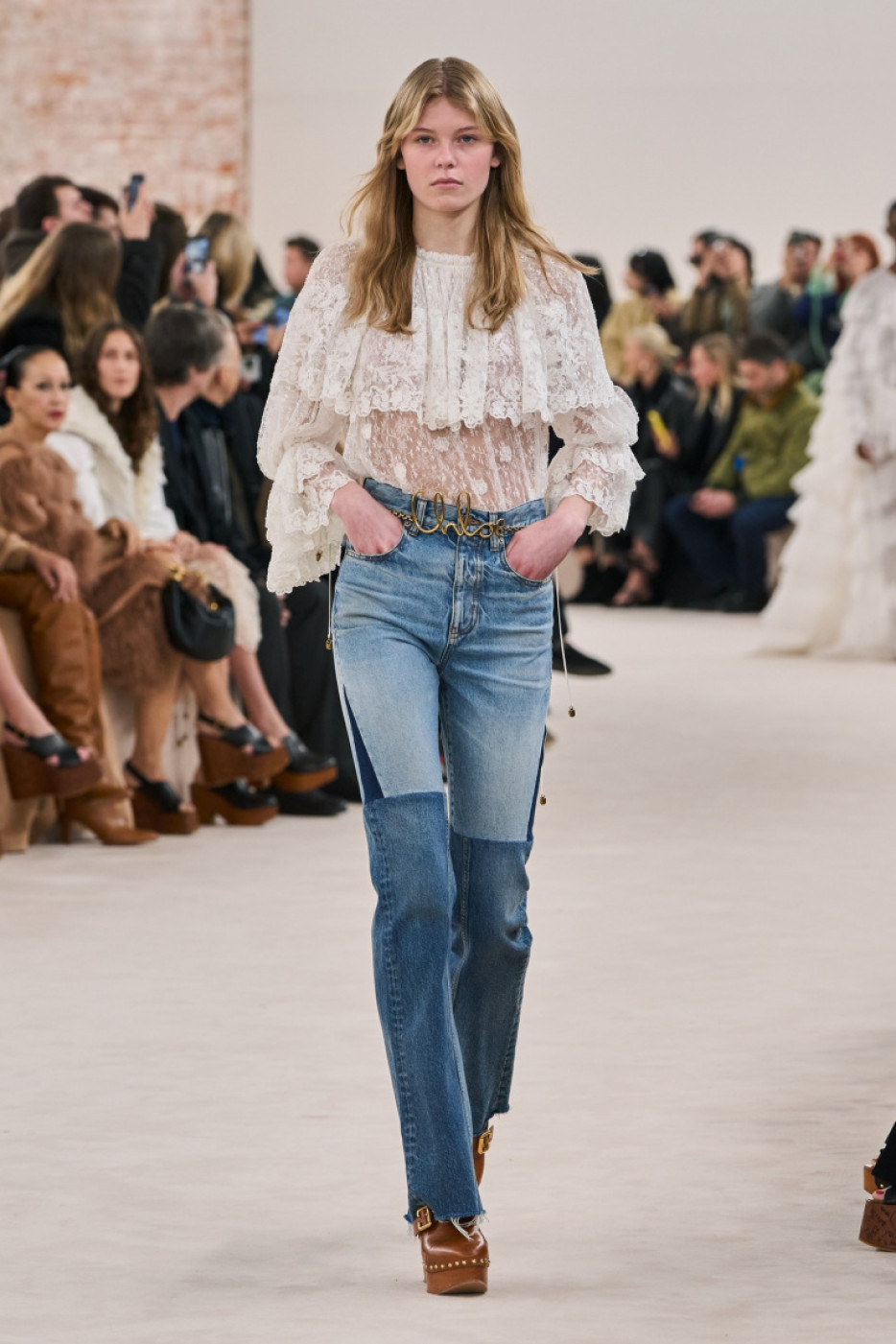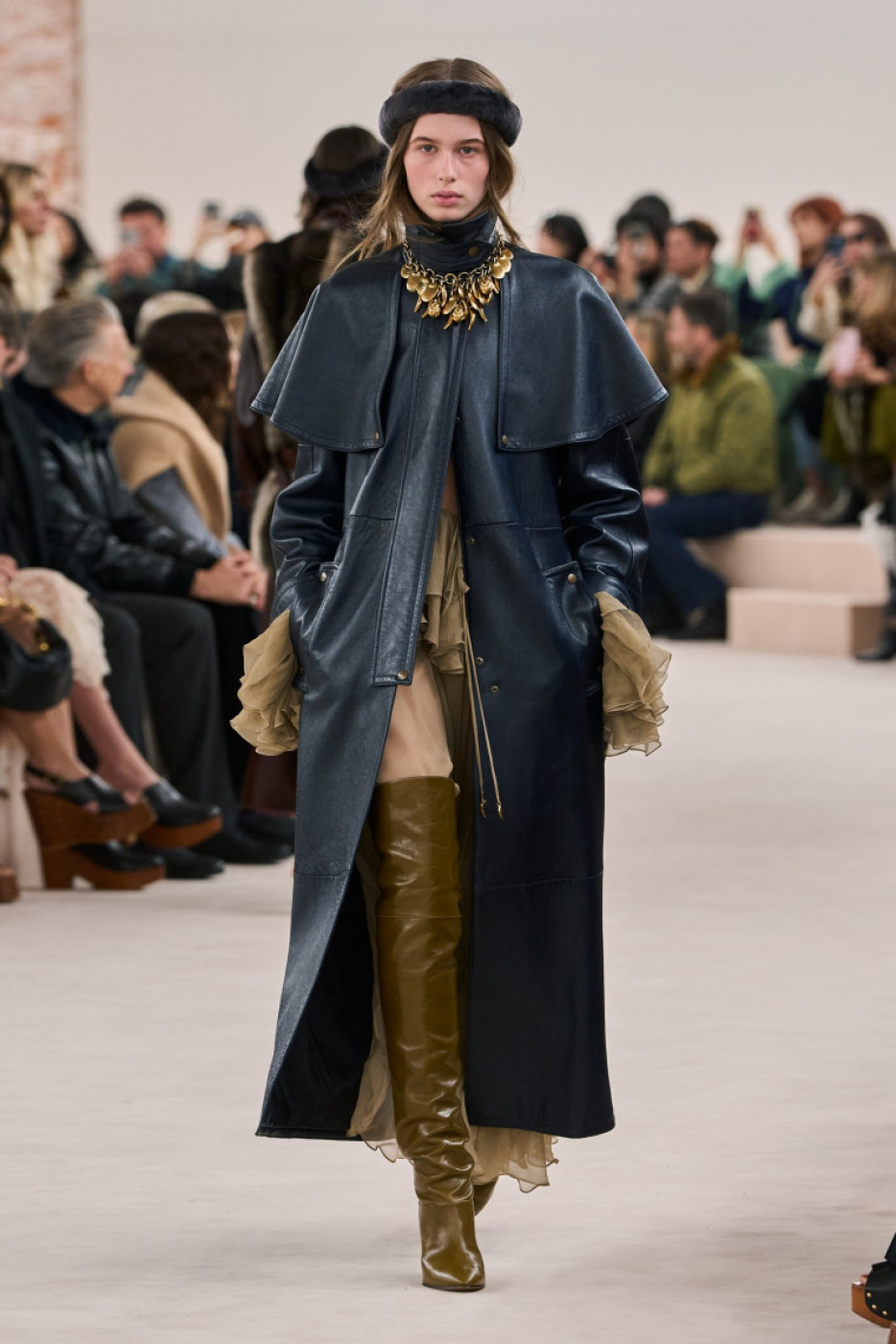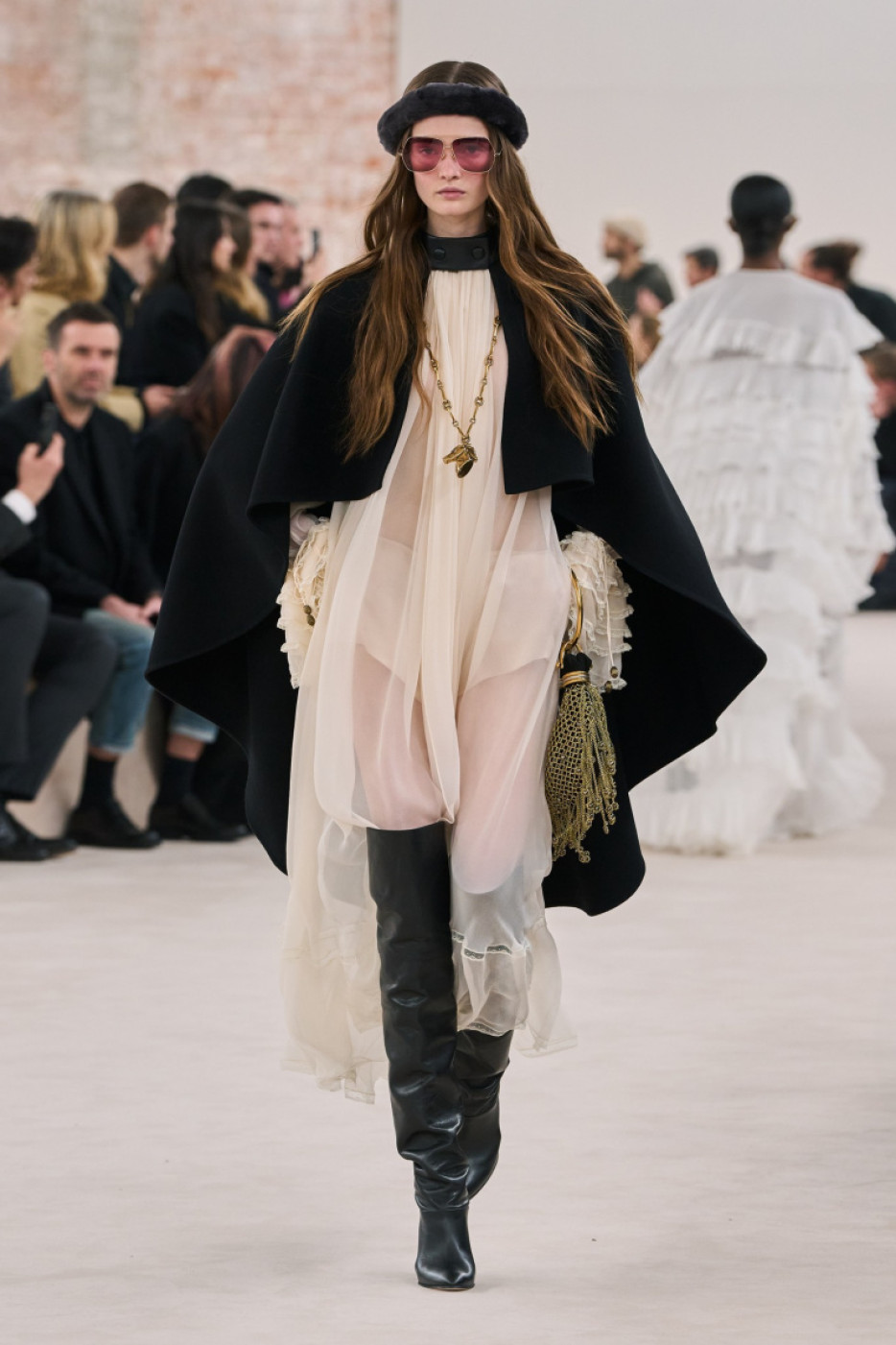“I want to bring back the feeling I had when I first stepped through the doors here 20 years ago and fell in love with the Chloé woman’s spirit. I want to feel her presence again; her beat, her natural beauty, her sense of freedom and undone-ness. The glow, the radiance and the energy of that girl. She is real. She is herself”, Chemena mused in her show notes, sent to the editors by email a few minutes after the show. On the runway, models walked to the piercing sounds of Kate Bush’s “Cloudbusting” and Mono’s “Life in Mono”. Kamali made a special focus on the capes, and presented several cropped versions in leather, and longer ones on vinyl and gabardine. She also played with the notion of transparency, thus a bunch of airy evening gowns in crepe: model veteran Doutzen Kroes closed the show in one of them, what a moment! Another highlight: silhouettes in white and black lace paired with blue jeans or glossy thigh-high boots. The collection was filled with boho chic references to the 70s: think blanket coats, huggable fluffy overcoats, leather moto jackets and trousers with fringes and cozy catsuits in cachemire.