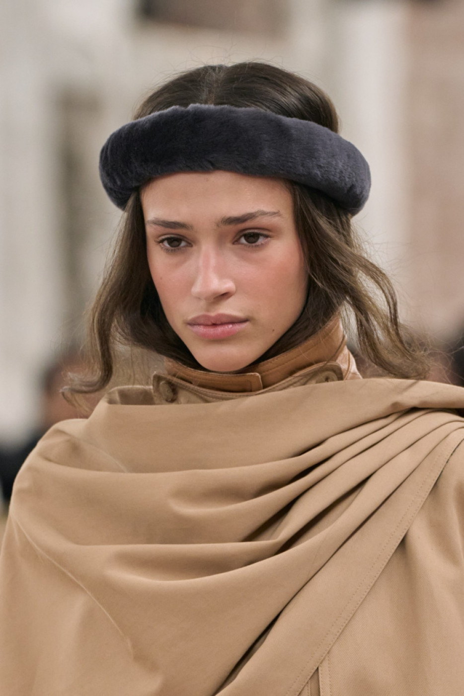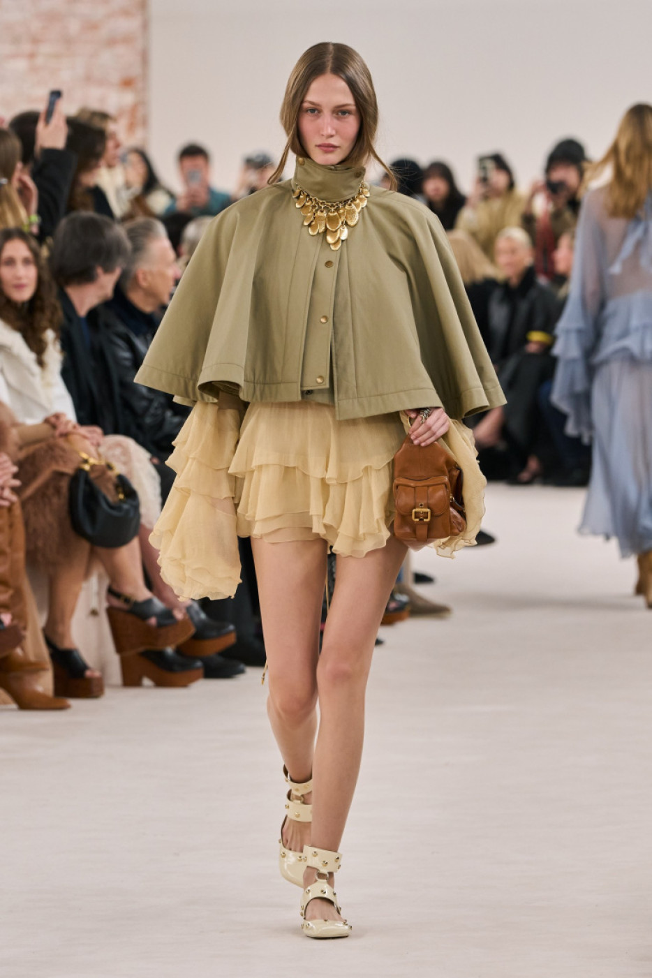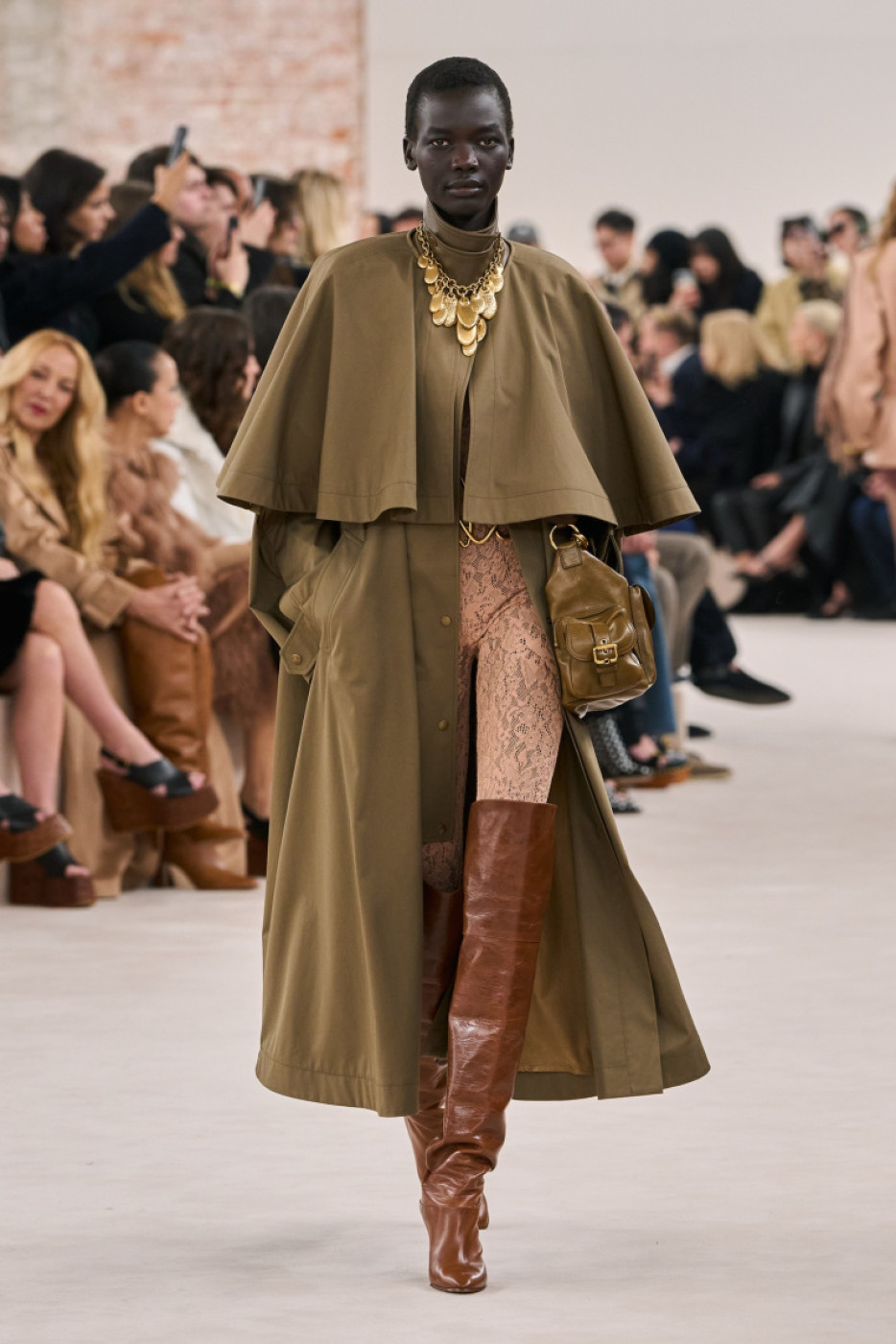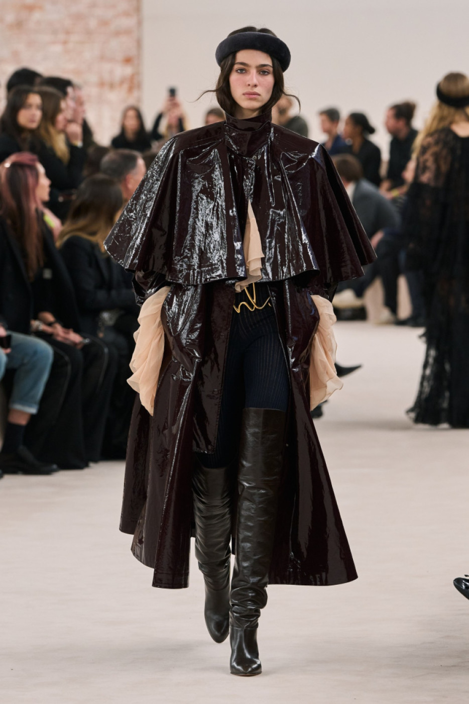 “I want to bring back the feeling I had when I first stepped through the doors here 20 years ago and fell in love with the Chloé woman’s spirit. I want to feel her presence again; her beat, her natural beauty, her sense of freedom and undone-ness. The glow, the radiance and the energy of that girl. She is real. She is herself”, Chemena mused in her show notes, sent to the editors by email a few minutes after the show. On the runway, models walked to the piercing sounds of Kate Bush’s “Cloudbusting” and Mono’s “Life in Mono”. Kamali made a special focus on the capes, and presented several cropped versions in leather, and longer ones on vinyl and gabardine. She also played with the notion of transparency, thus a bunch of airy evening gowns in crepe: model veteran Doutzen Kroes closed the show in one of them, what a moment! Another highlight: silhouettes in white and black lace paired with blue jeans or glossy thigh-high boots. The collection was filled with boho chic references to the 70s: think blanket coats, huggable fluffy overcoats, leather moto jackets and trousers with fringes and cozy catsuits in cachemire.