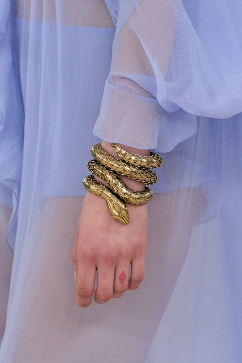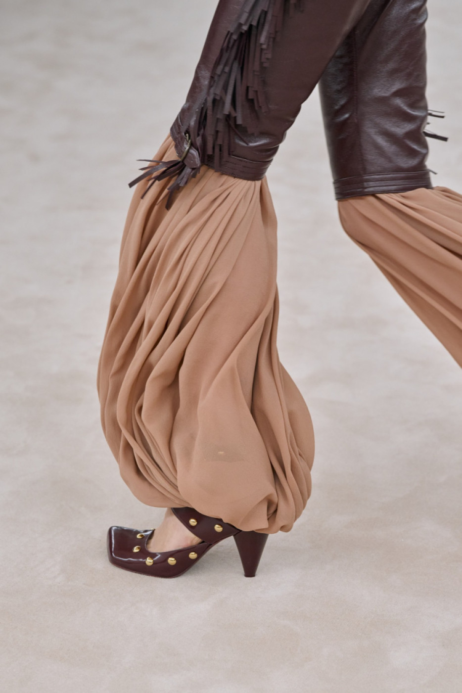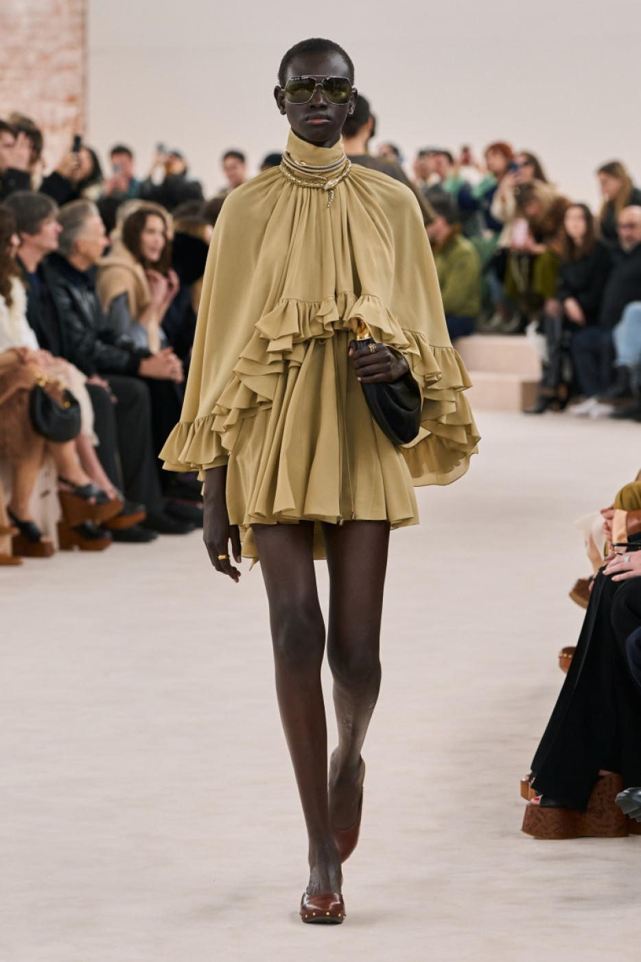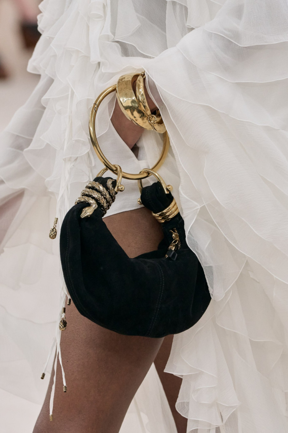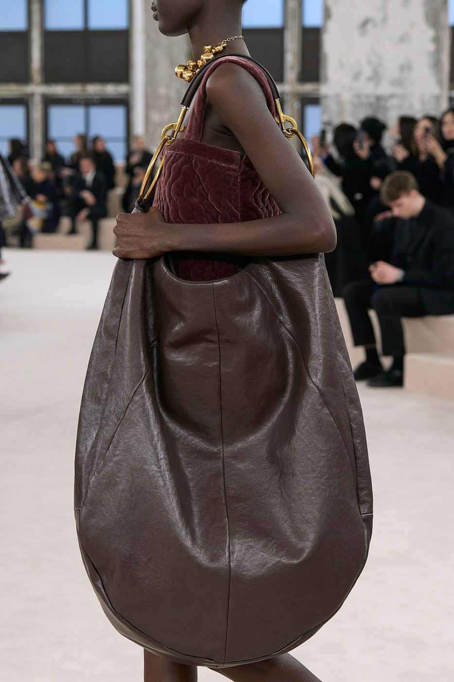 There was also a new take on accessories: Kamali presented statement jewelry in gold, flat or sky-high clogs, extra large satchels and moon-shaped bags with banana hardware that will not go unnoticed. The XXL belts with “Chloé” spelled on them in a loopy writing will definitely become a favorite for Parisian Gen-Zs: they love it when a fashion accessory screams: “I am a Chloé girl!”.