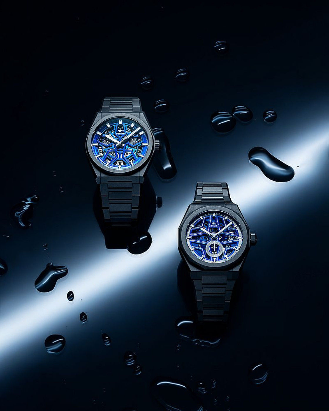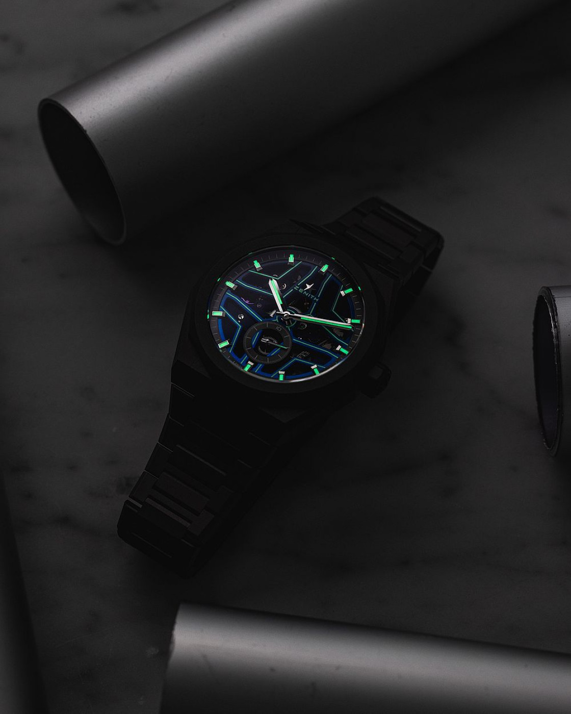 An evolution of the DEFY Classic Skeleton, the DEFY Skyline Skeleton takes both the design and performance to new heights. Bolder, bluer, more geometric lines and the latest generation of the high-frequency automatic El Primero calibre, the DEFY Skyline Skeleton Night Surfer El Primero is both a sequel and evolution of the original. For Time+Tide, the objective was to retain all the elements that made the original Night Surfer so outstanding while incorporating all the improvements that the DEFY Skyline Skeleton offers.