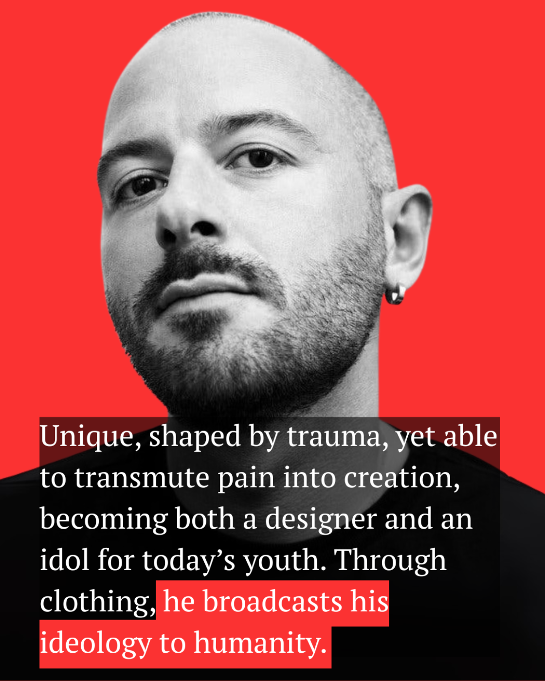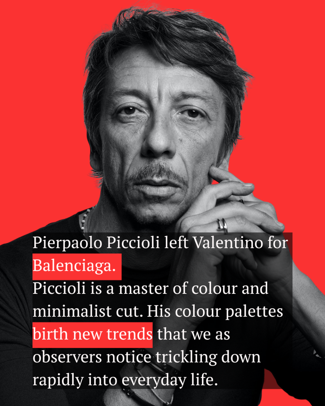 Michele is a god of antique and vintage — literally, his ability to evoke the atmosphere of a bygone era is like no other. Piccioli is a master of colour and minimalist cut. His colour palettes birth new trends that we as observers notice trickling down rapidly into everyday life. And then, of course, there is Demna. Unique, shaped by trauma, yet able to transmute pain into creation, becoming both a designer and an idol for today’s youth. Through clothing, he broadcasts his ideology to humanity.