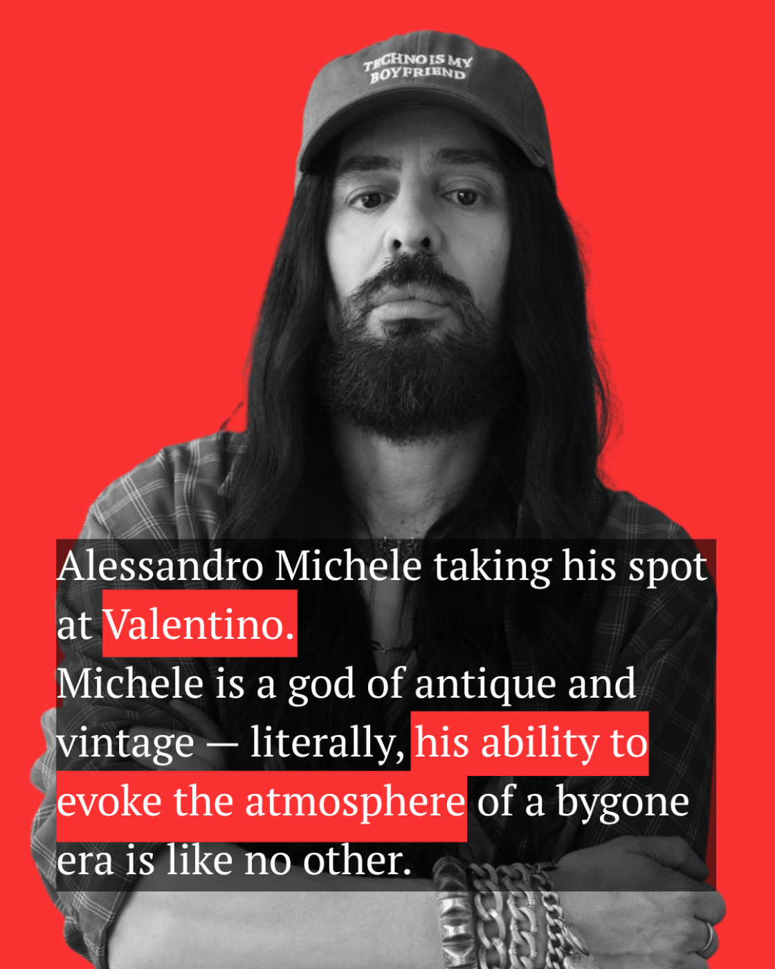 *Inevitably, the designer carousel has its drama. The controversy boils down to this: Valentino has been “Gucci-fied,” Gucci has been “Balenciaga-fied,” and now we expect Balenciaga to be “Valentino-ized.”*