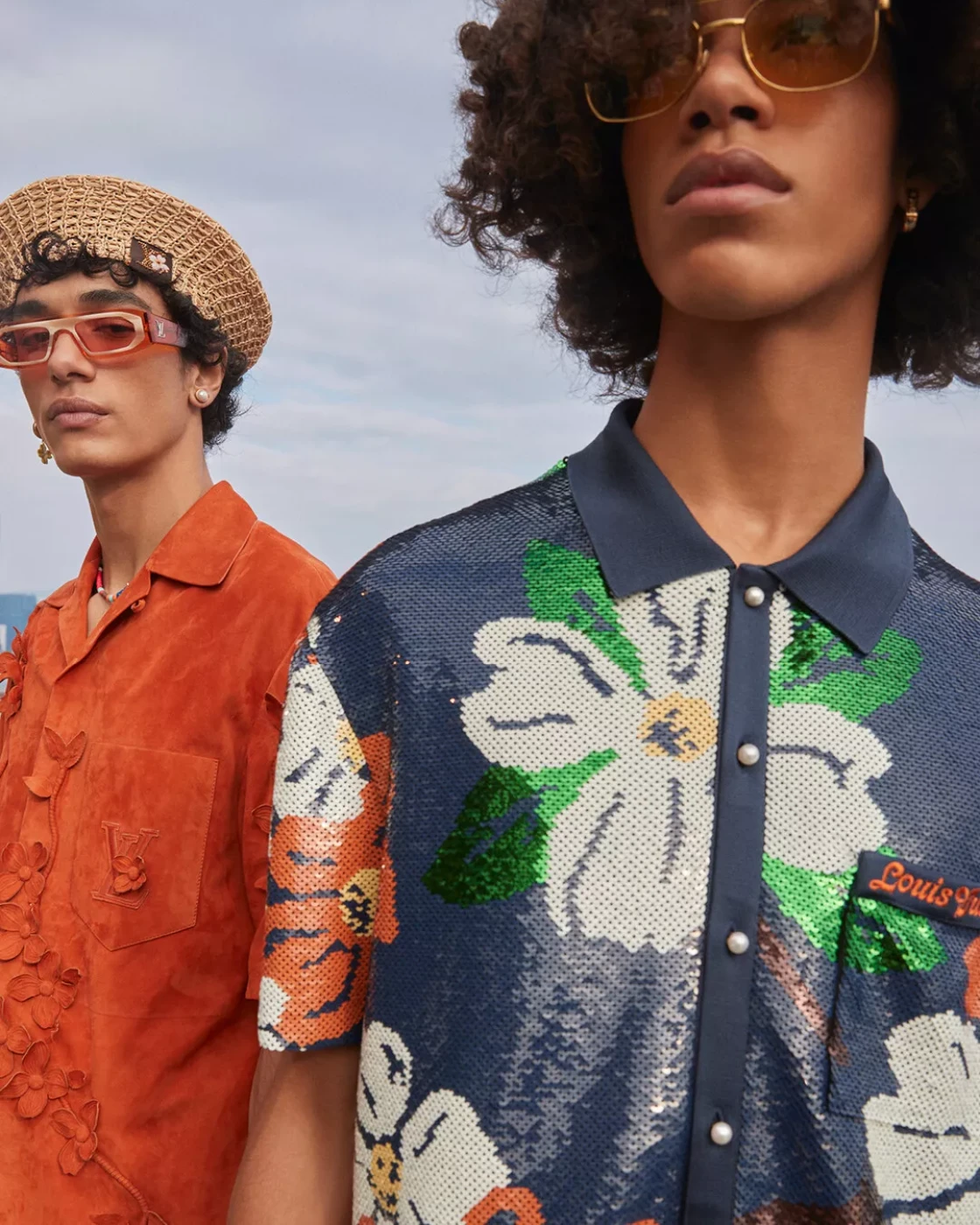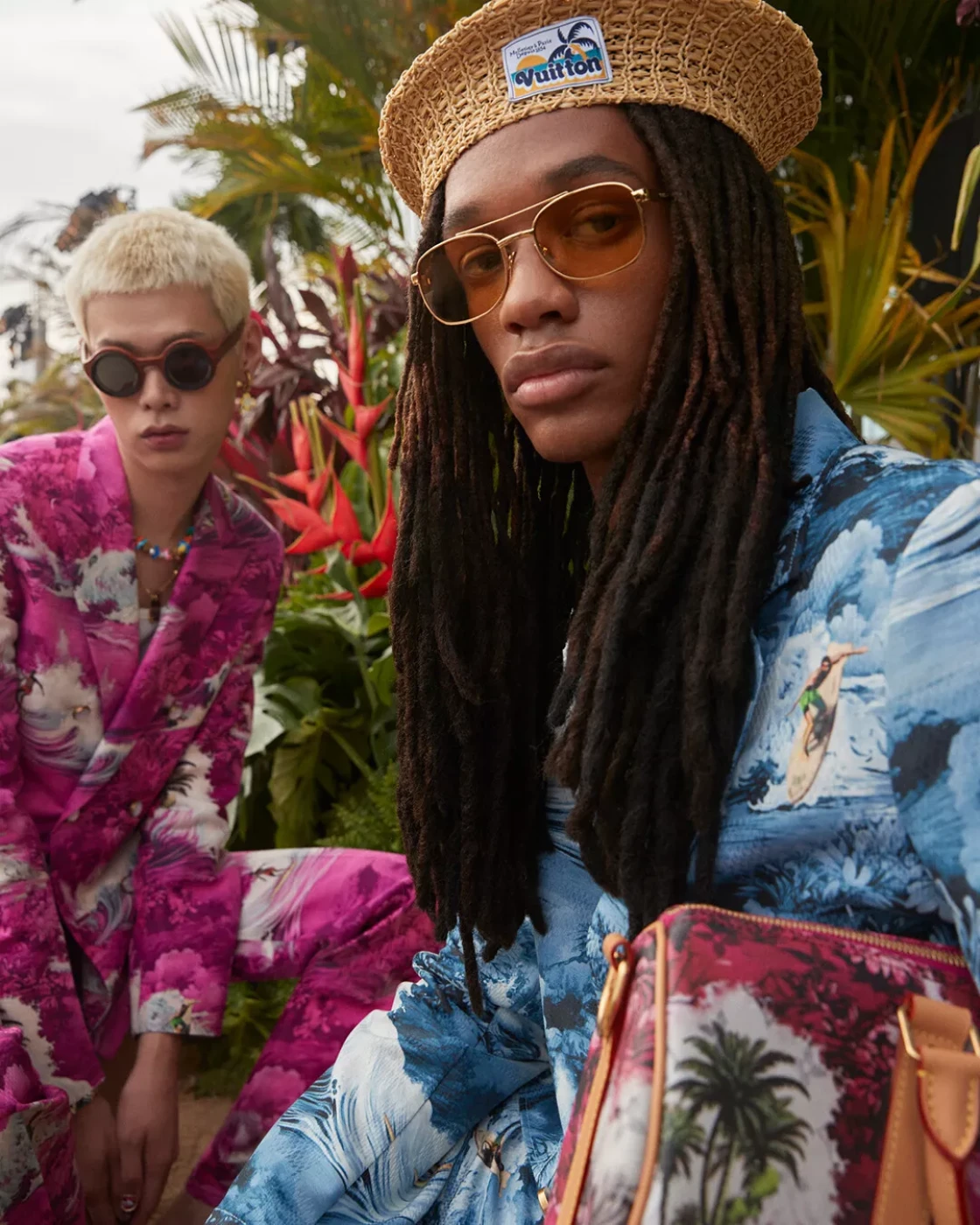 How does Pharrell Williams tackle his objectives? Precisely with the help of decor and materials that were the focus of the designer’s work on LV menswear collection, work that was executed with great care and not without ingenuity. Pearl-topped buttons on sailor suits and tipped denim rivets on jeans, a variety of appliques, including a red suede short and shirt set garlanded with wire-edged flowers, which can be shaped according to your own taste. There was the jacquard jacket embroidered with pearls that closed the show, the beaded shorts, wetsuits and ponchos in neoprene, a rattan coat and a sailor's hat as well as the new shoes model named Cobra, 3D-printed in TPU. And, of course, it was a real fiesta of accessories: new versions of the Speedy and a new chest bag, an ukulele strap, many different charms, bi-color checkerboard archive versions of the Damier design that retained its first hand-brushed traces, as well as a new scuba-effect version of the same checkerboard. To summarize, Pharrell Williams makes LV menswear, where a surfboard meets an ukelele, and a wetsuit meets a tailored one, and all this is embroidered with pearls, whose goal is to attract and reconcile everyone.