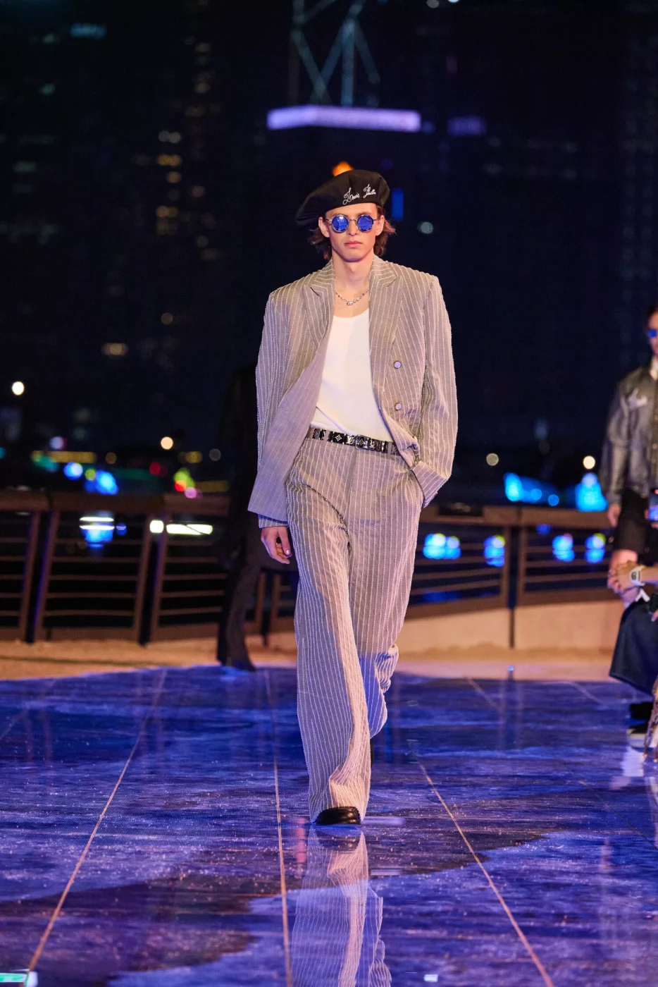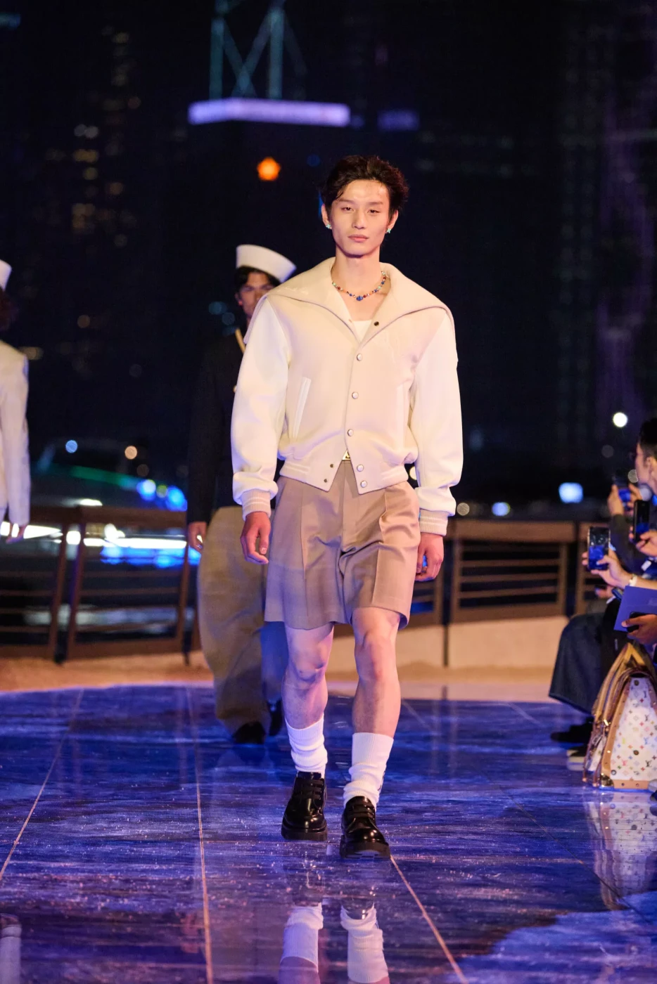 The collection shown at Hong Kong's Victoria Harbour was most obviously dedicated to the sea — the sandy beach piled on the runway ended in the blue waves below it. But there was no strictly curated marine references, there was a mixture of everything related to the sea, from ships to beaches. The white uniform of American sailors (Williams himself wore a spin-off costume) with round sailor-hats, the pea jackets, trousers, and berets of the French sailors, the sailor collars, of course, but also the Hawaiian shirts and surfboards, the raincoats and fishermen rubber boots (made from leather, of course) and the blazers of yachtsmen — all the mainstream imagery is obviously suitable for Williams with his goals and objectives.
