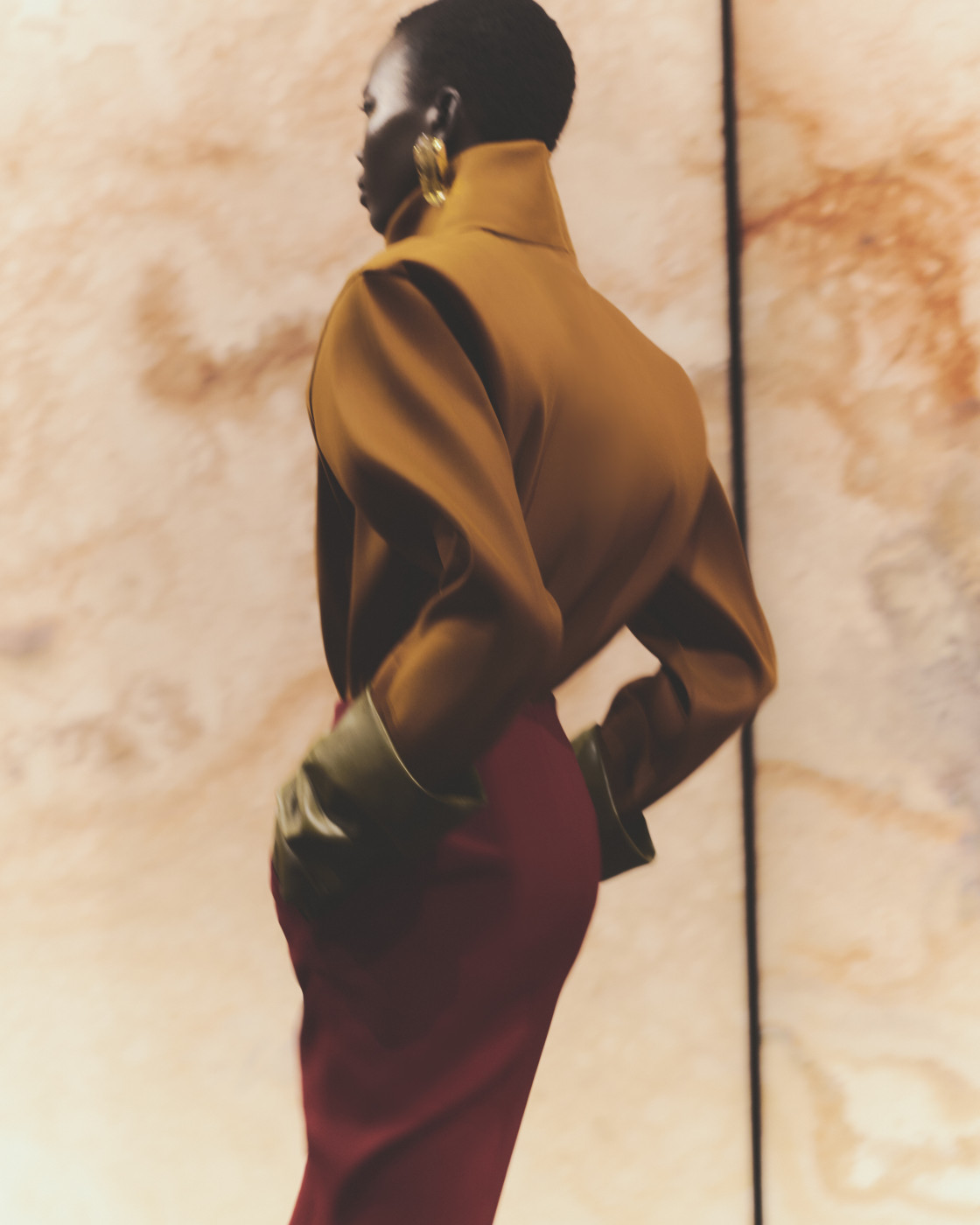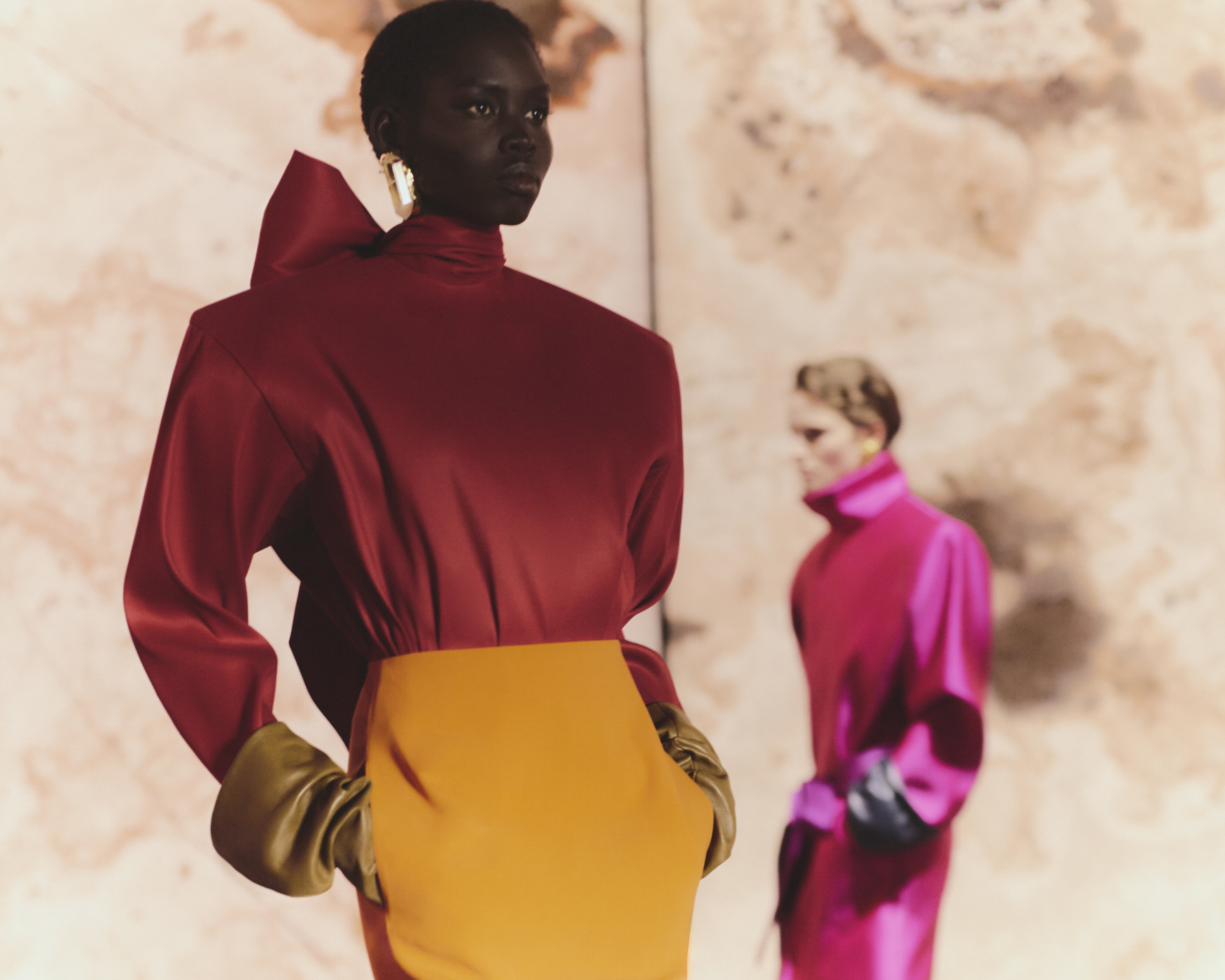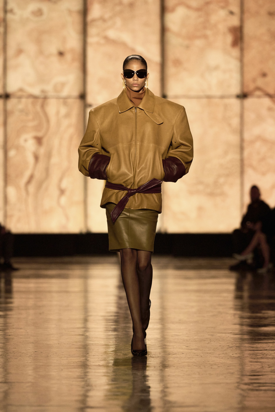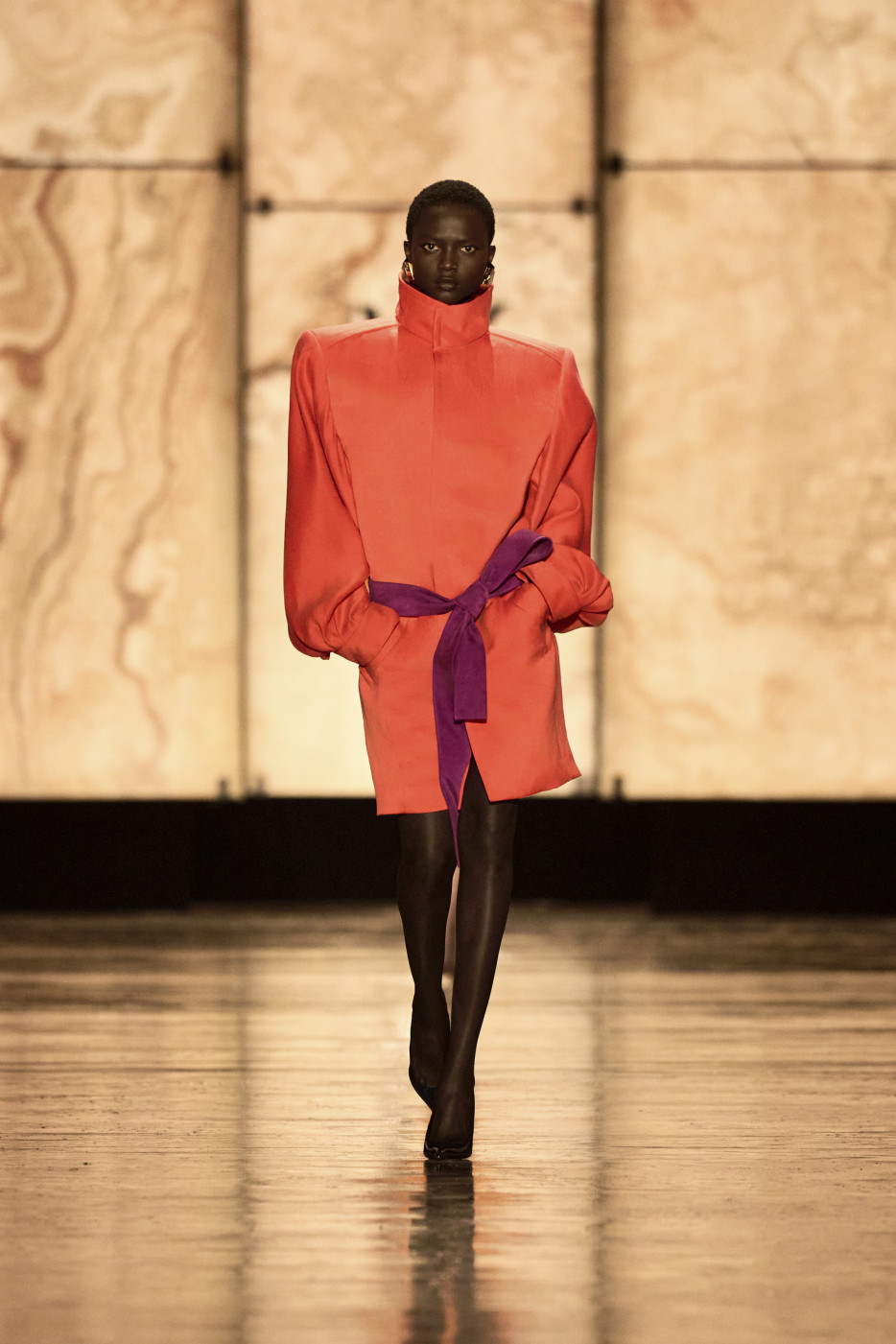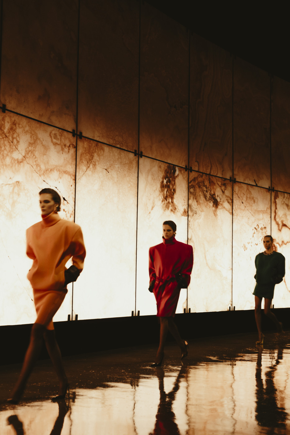 The silhouettes gradually softened from the shoulders to the hem, forming an inverted triangular shape that seemed almost on the verge of flipping over. This pyramid-like structure was intentionally disrupted in every look through colorful leather belts, tucked-in shirts, and skirts that accentuated the waist.