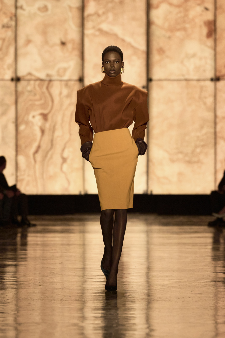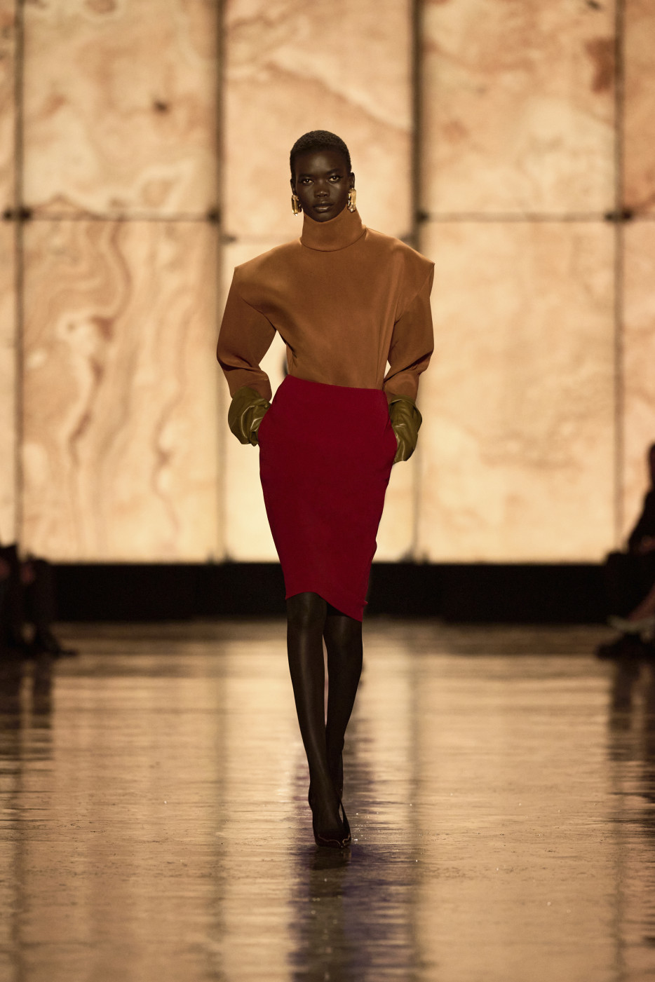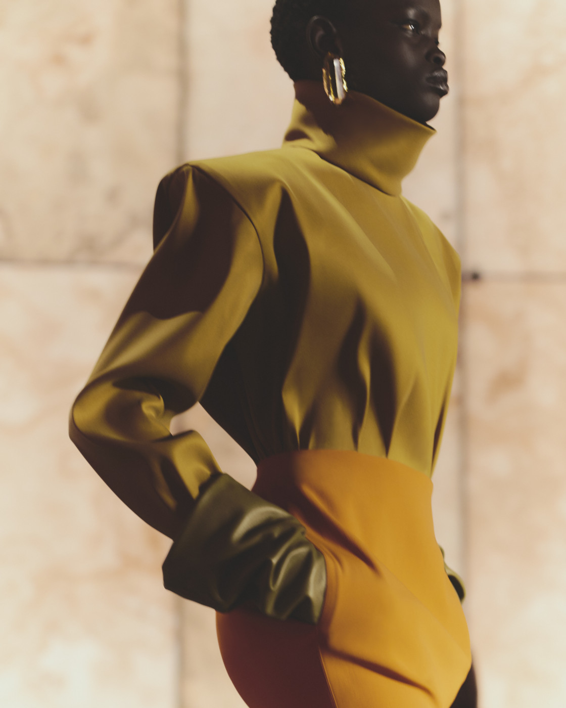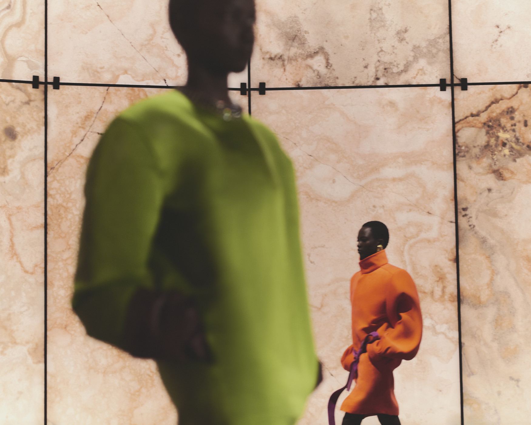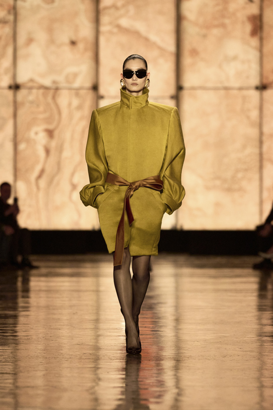 The silhouettes gradually softened from the shoulders to the hem, forming an inverted triangular shape that seemed almost on the verge of flipping over. This pyramid-like structure was intentionally disrupted in every look through colorful leather belts, tucked-in shirts, and skirts that accentuated the waist.