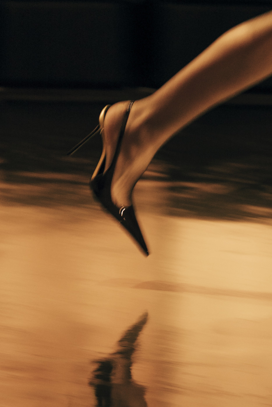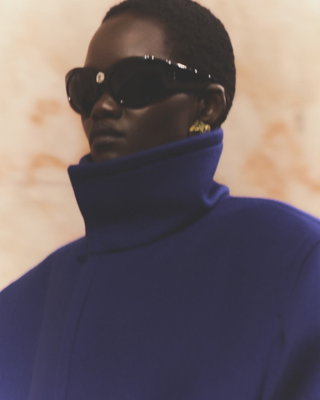 Pointed stiletto heels adorned with satin square roses, jewelry crafted from rock crystal, and oversized sunglasses added a luxurious touch to the minimalist ensembles, seamlessly integrating into the collection’s narrative.