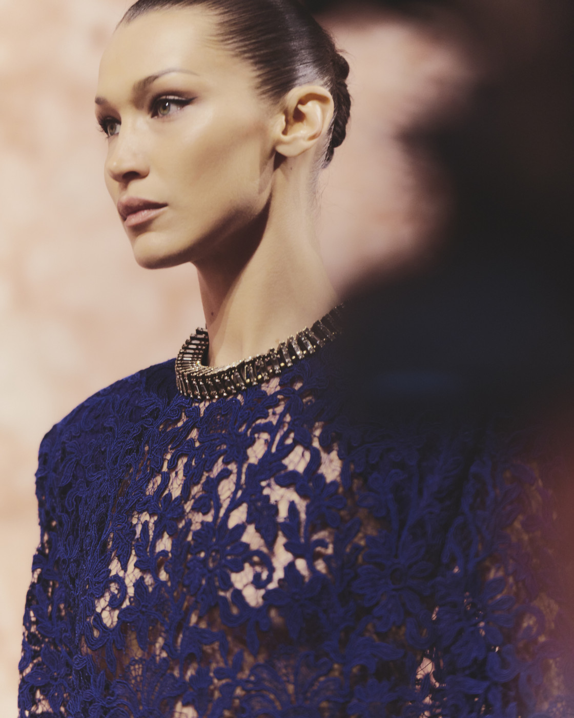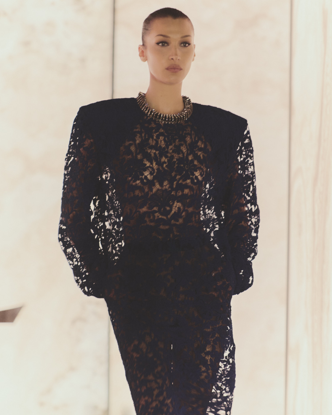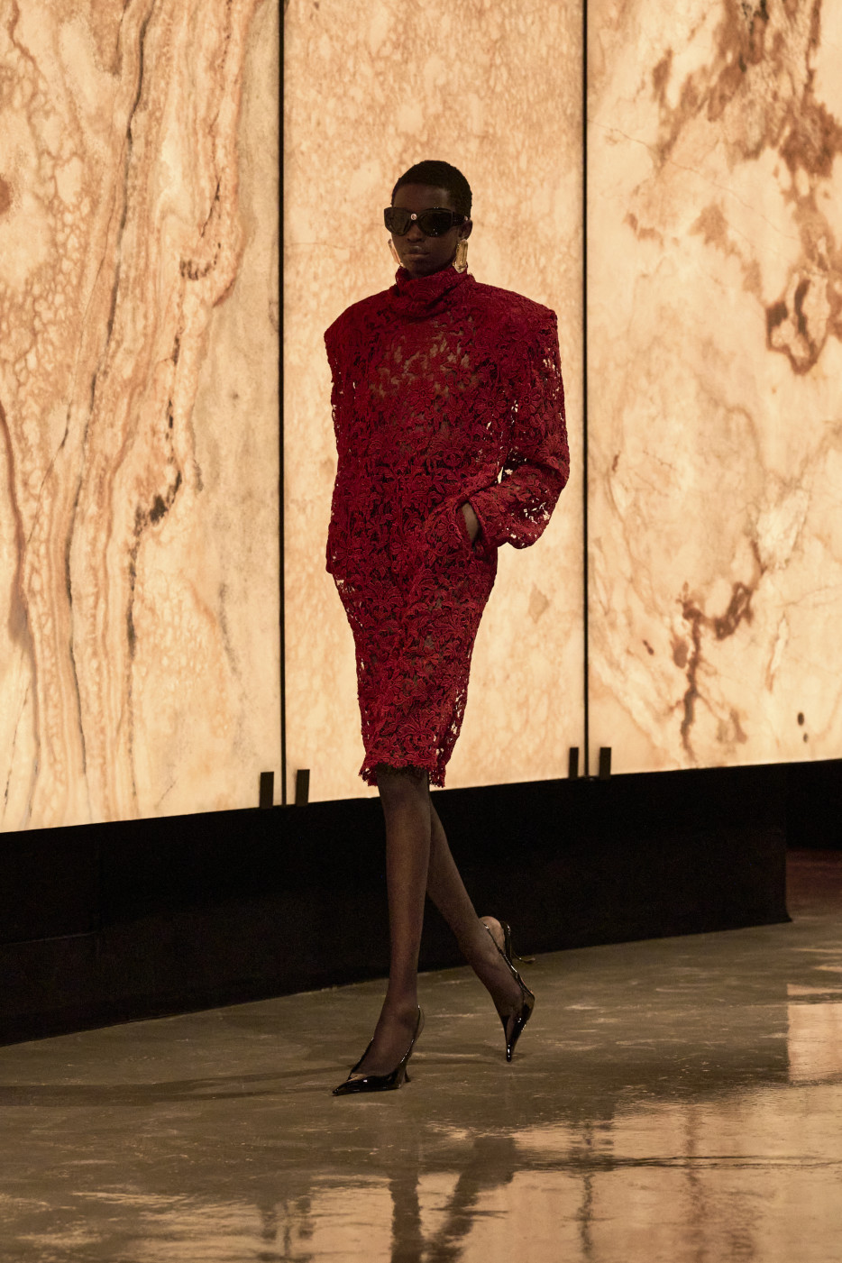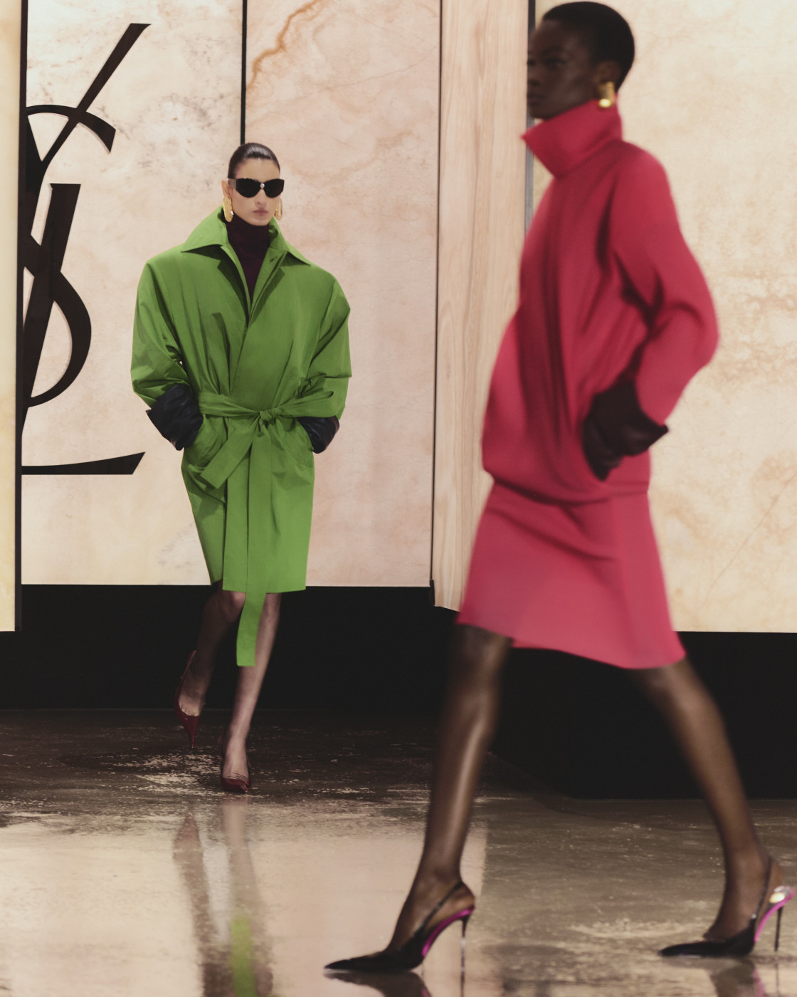 The rhythmic color palette―shifting from coral orange to fuchsia pink, fir green to emerald blue, and electric blue to amethyst purple―evoked the signature Yves Saint Laurent aesthetic of the 1980s and 90s. A striking trio of looks worn by Bella Hadid―a delicate deep blue dress, a yellow leather dress, and a red lace dress―inevitably called to mind the iconic colors of Mondrian.