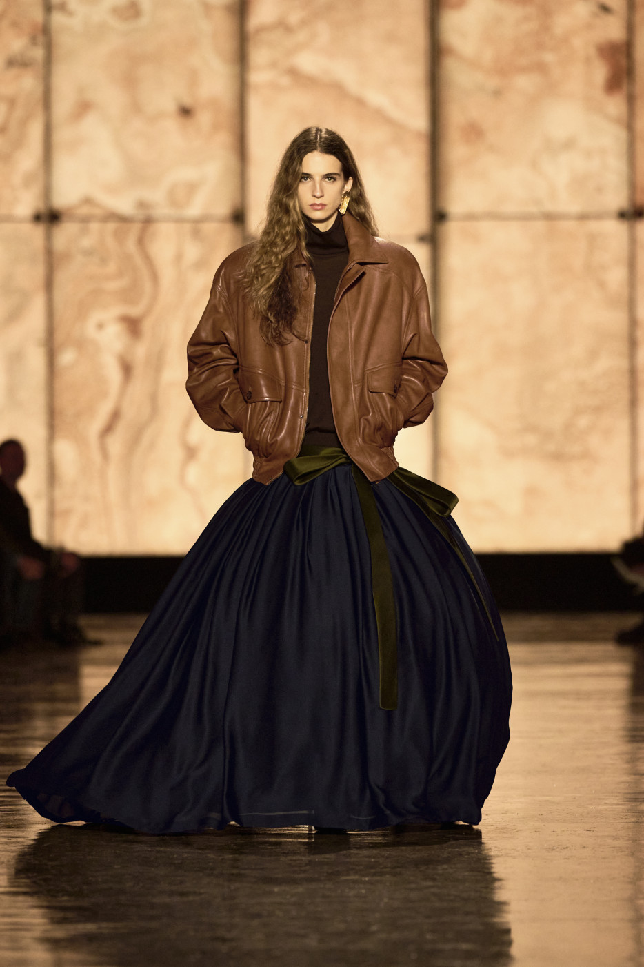 In the final chapter, a new silhouette emerged with floor-length ball gowns grazing the ground. The balloon skirts featured a drop-waist design, expanding from the hips rather than the waist, while the tops varied from lace-trimmed babydoll styles to casual turtlenecks, blurring the lines between the everyday and the extraordinary. With a cool gesture―hands tucked into the pockets of Saint Laurent’s signature oversized leather blouson―she effortlessly balanced the sweetness of the gowns, embodying a vision of femininity that only Saint Laurent can create. She is bold, confident, dynamic, and modern―a woman who commands attention in everything she wears.