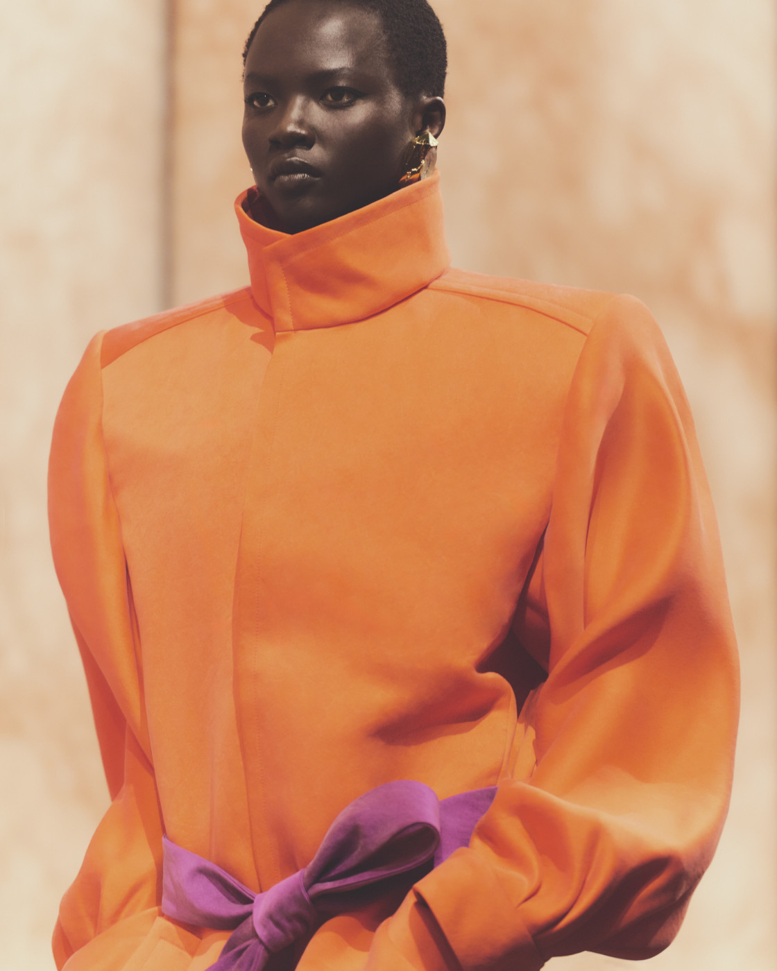 The show opened with an orange turtleneck dress cinched at the waist with a purple ribbon, setting the stage with vibrant summer hues. As the second chapter unfolded, the palette transitioned into autumnal shades―ranging from beige to mustard yellow and hazel brown―centered around monochrome silhouettes. Amidst a rebellious attitude, the collection conveyed warmth and comfort.