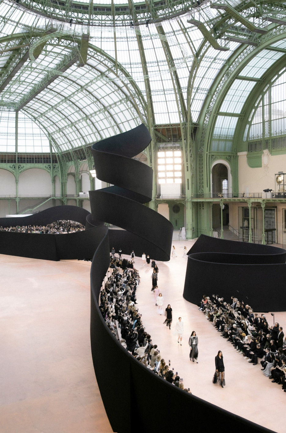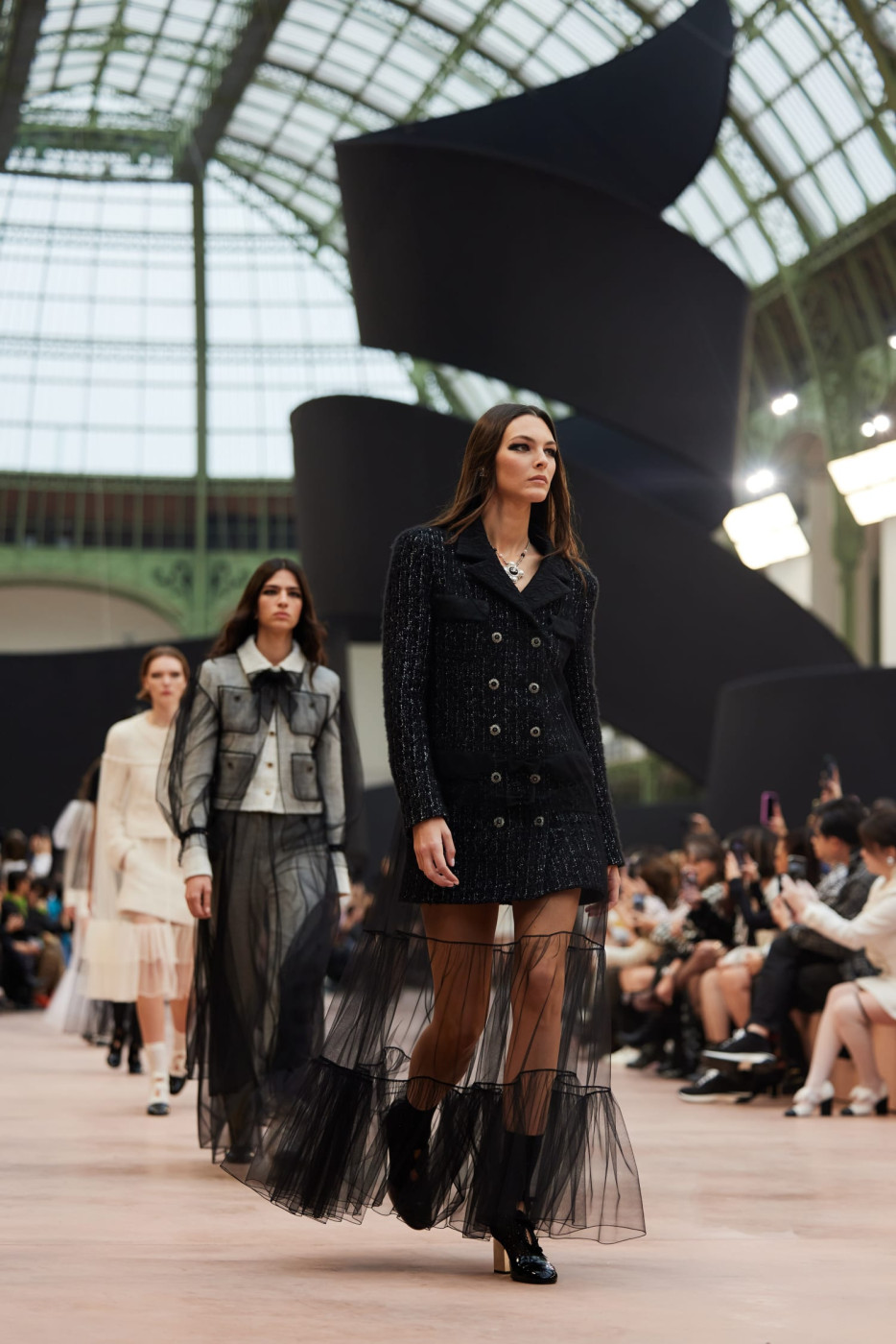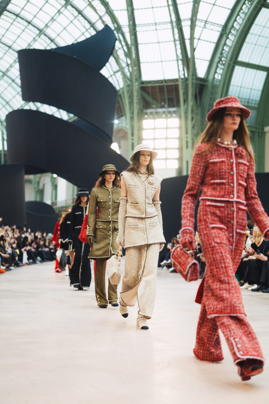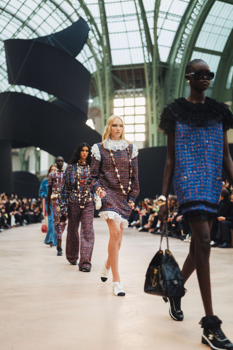 Like a theatre of dreamlike illusions, the CHANEL Fall-Winter 2025/26 Ready-to-Wear collection, presented by the Creation Studio, plays with size, length, and proportion. Beneath the glass roof of the Grand Palais, scenographer Willo Perron's installation dances over the floor and soars into the air. His monumental black ribbon, 368 meters long and approximately 20 meters high, serves as a striking backdrop.