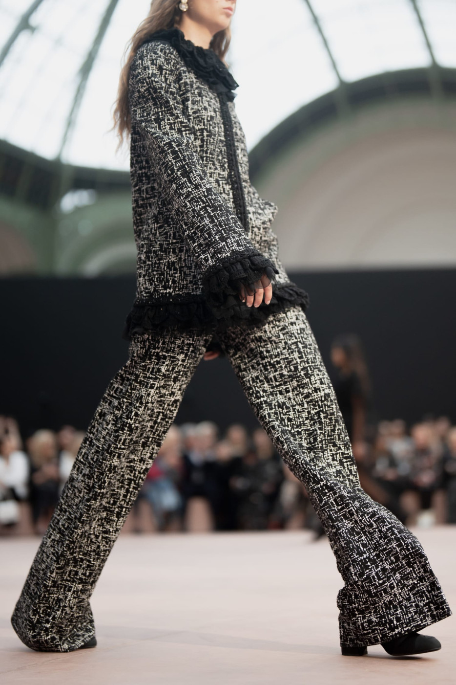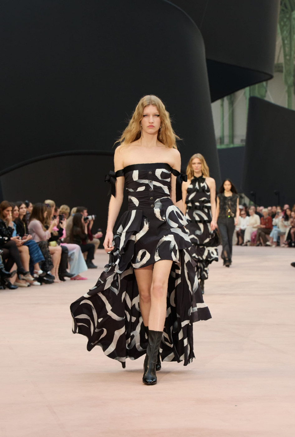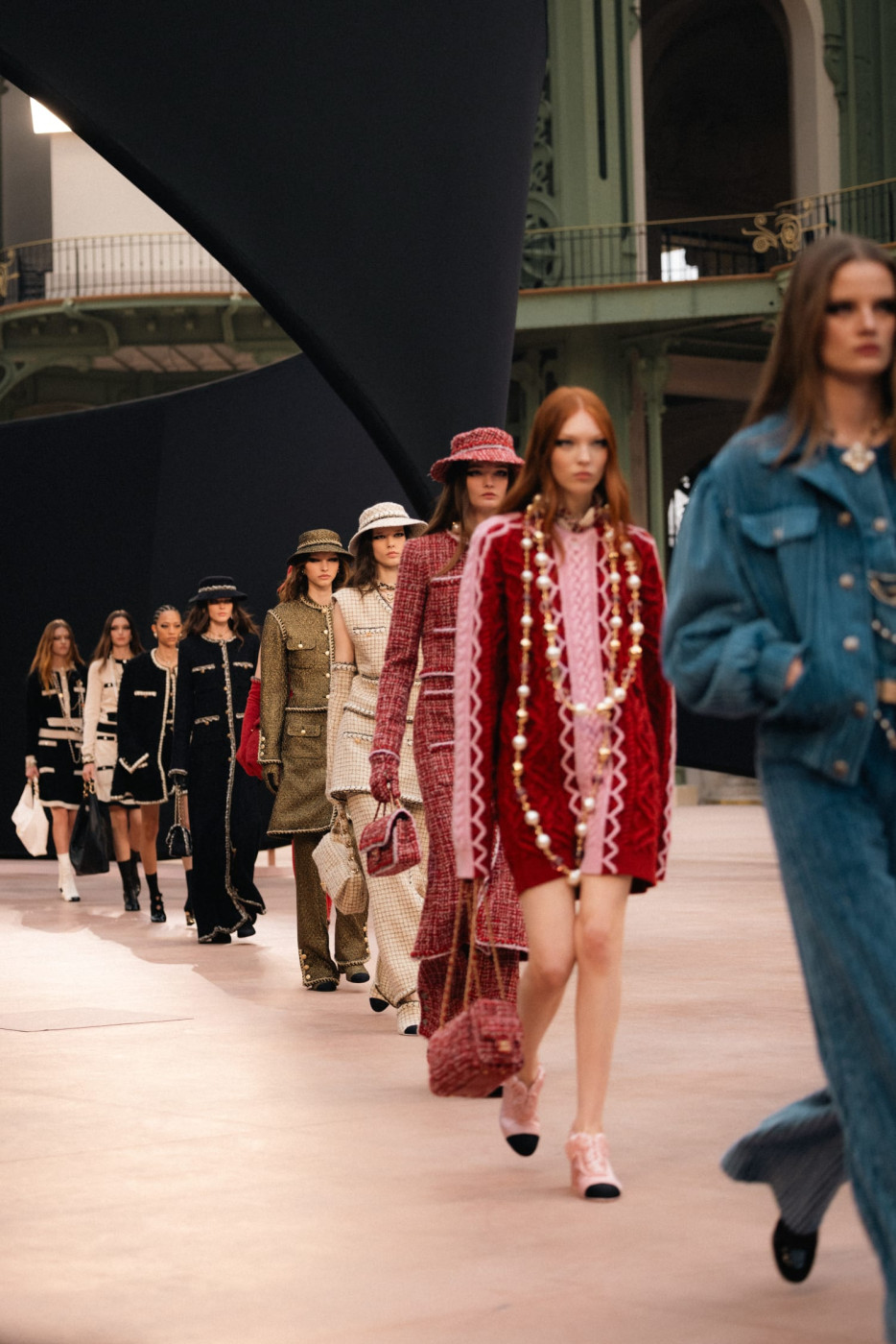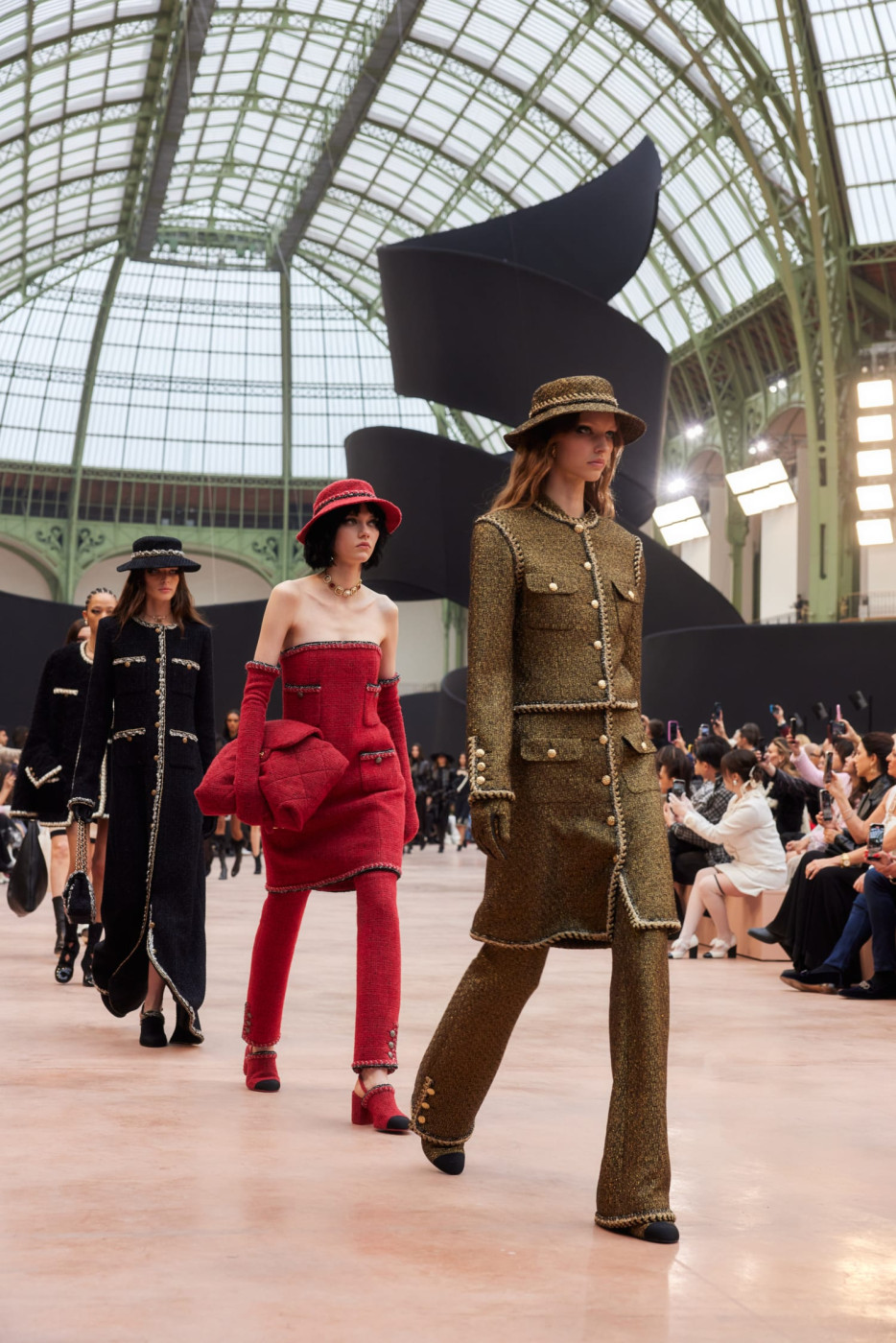 Like a theatre of dreamlike illusions, the CHANEL Fall-Winter 2025/26 Ready-to-Wear collection, presented by the Creation Studio, plays with size, length, and proportion. Beneath the glass roof of the Grand Palais, scenographer Willo Perron's installation dances over the floor and soars into the air. His monumental black ribbon, 368 meters long and approximately 20 meters high, serves as a striking backdrop.
