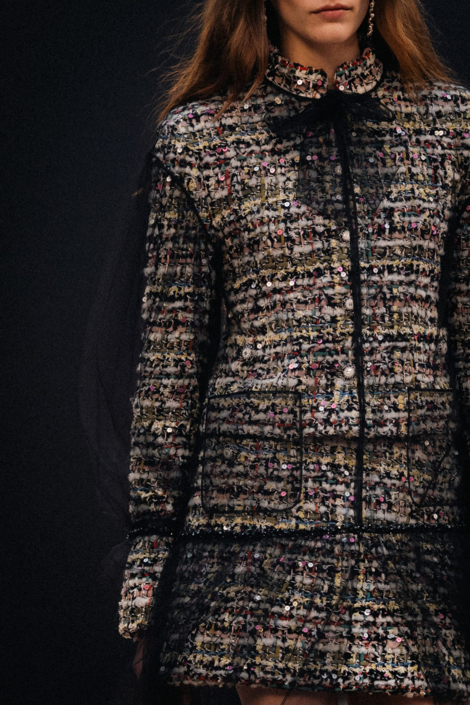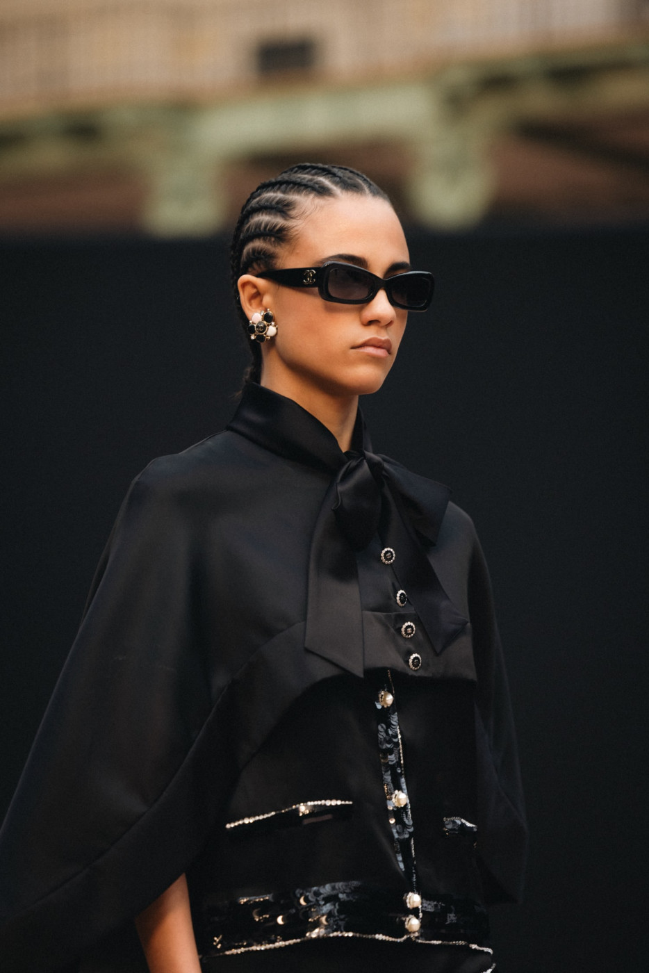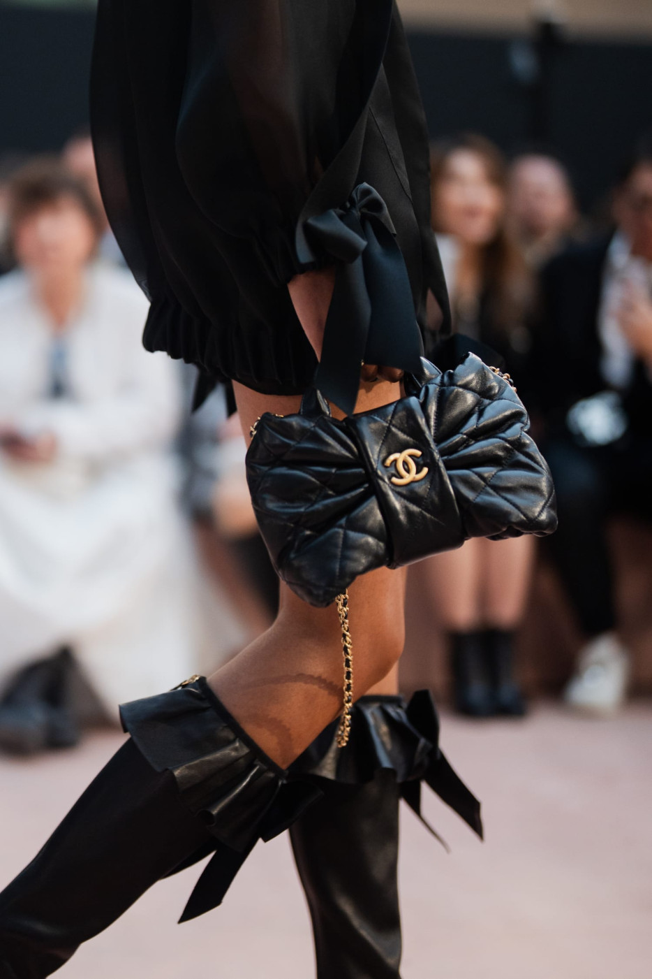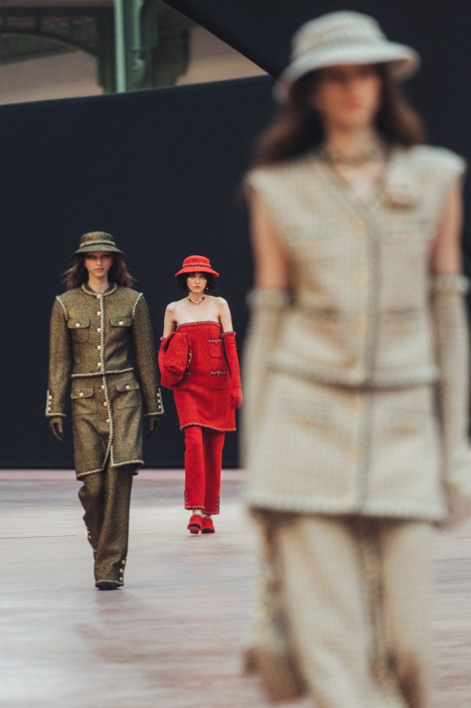 Like a theatre of dreamlike illusions, the CHANEL Fall-Winter 2025/26 Ready-to-Wear collection, presented by the Creation Studio, plays with size, length, and proportion. Beneath the glass roof of the Grand Palais, scenographer Willo Perron's installation dances over the floor and soars into the air. His monumental black ribbon, 368 meters long and approximately 20 meters high, serves as a striking backdrop.