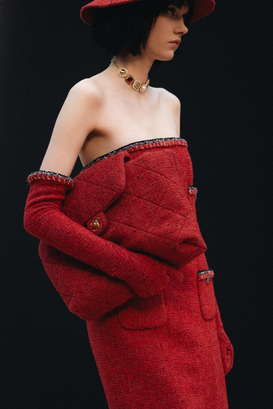 The collection incorporates layering to enhance trompe l’oeil effects. One set in grenadine tweed includes a micro-jacket lined with bright red silk, a wrap skirt, and flared trousers. Another set in bronze hues features a tunic and trousers with a buttoned-over skirt. A third set consists of a sleeveless blouson gilet and a long ivory slit skirt topped with a miniskirt.