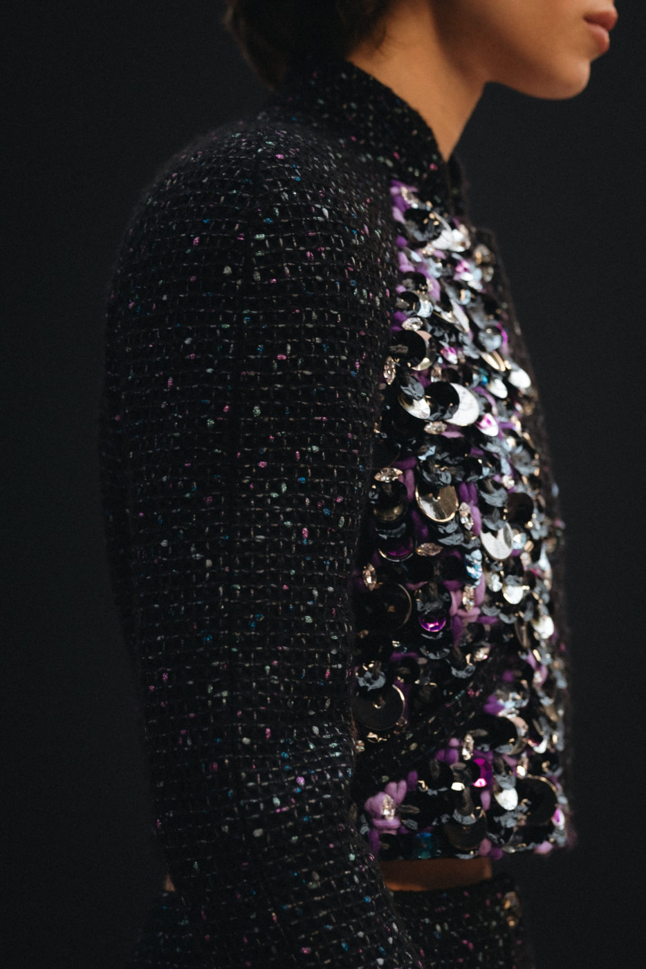 A mini jacket in blue, white, and pink tweed is paired with long trousers. A large poplin shirt extends to the ankles, a short black tweed jacket with braid trim resembles a long coatdress with jewelled buttons, and a cape finishes with jacket cuffs.