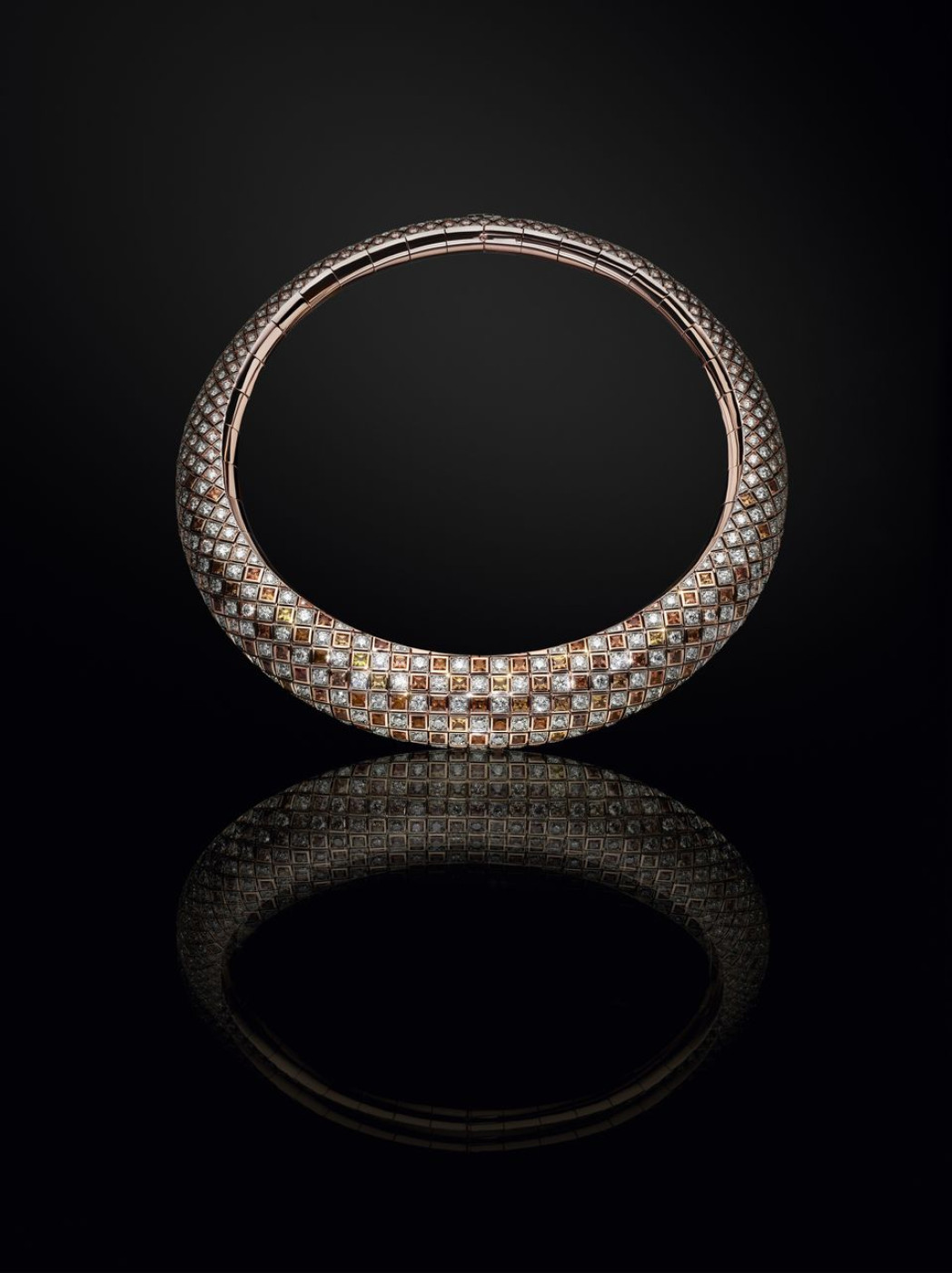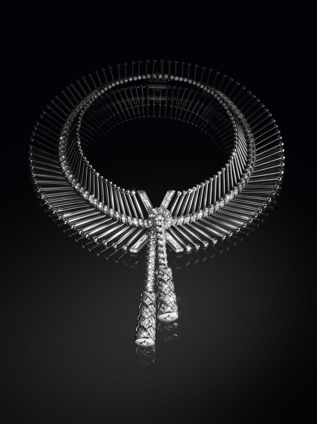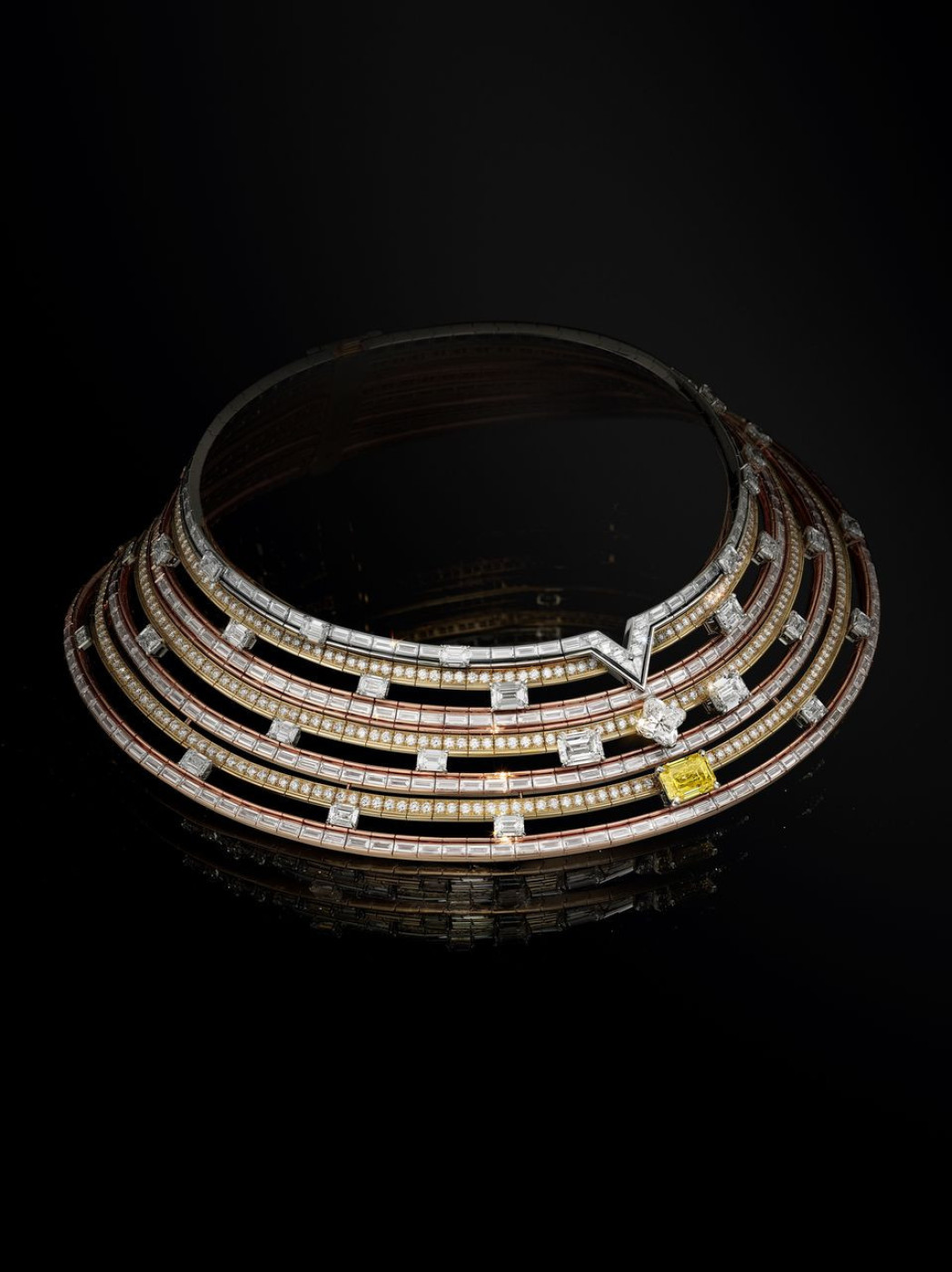 The second and final chapter of the “Deep Time” collection, dedicated to geology and the natural wonders that brought life to Earth, is composed of fifty pieces. Francesca Amfitheatrof, creative director of Louis Vuitton's jewellery and watches division, explains that this constant work in progress allows her studio to dive deeper in the theme, amplifying the rich tale of geological legacy and interconnectedness of life. This time, Amfitheatrof took a trip back thousands of years and presented a jewellery version of sinuous DNA helix - a massive cuff bracelet and a matching necklace in white gold and diamonds, that she called “Myriad”. Another creation of hers “Skin” is a nod to snake scales (they say that the first serpents appeared on Earth more than 128 million years ago): ultra modern and graphic, this necklace in yellow gold also recalls the Maison’s Damier's signature pattern and contains nearly 300 Umbra sapphires from Tanzania, in various shades of brown from cognac to rich chocolate. Among other masterpieces, a high-collar “Laurasia” necklace that required 2,465 hours to create. Named after one of the oldest supercontinents, it is crafted from a blend of platinum, yellow and rose gold, and is embellished with a central rare 5.02-carat emerald-cut yellow diamond.