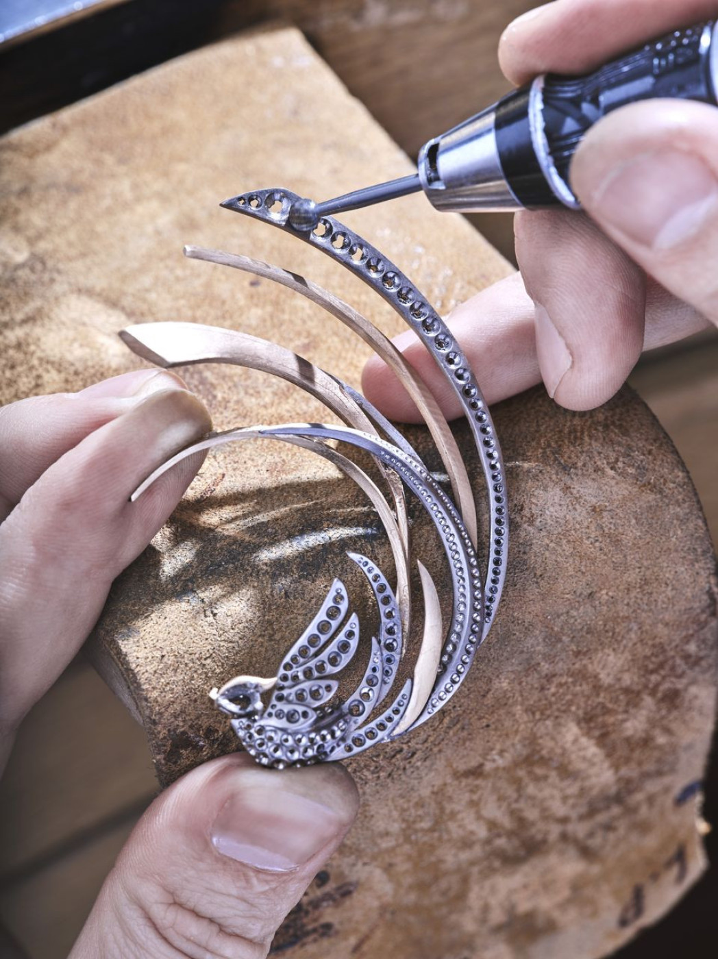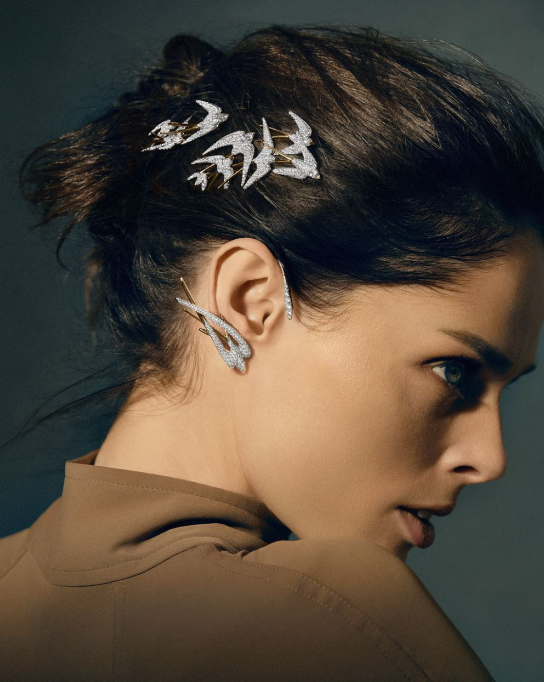 This miniature collection of high jewellery, composed of nine delicate pieces, is an ode to graceful birds, a constant theme of inspiration for grand jewellers. Empress Josephine herself, Chaumet's most devoted and famed client, believed that all kinds of birds should frequent her gardens. The starting point? Hairpins, bandeaux and other curious precious hair ornaments from the archives of the house, created by Joseph Chaumet at the beginning of the twentieth century and by his followers in the 60s and 70s. In the “Plumes d'or” set, all eyes are on brushed gold feathers set with diamonds - when feathers are separated, the tiara turns into hairpins and brooches. In the “Ballet” set, hair ornaments and earrings cuffs take the form of poetic swallows, universal symbol of happiness; while the “Parade” set plays with the concept of magical birds of paradise in white and pink gold, adorned with diamonds. Last but not least, the “Envol” set in white gold and diamonds is composed of earcuffs and hairpins, which can also be worn as brooches by both men and women.