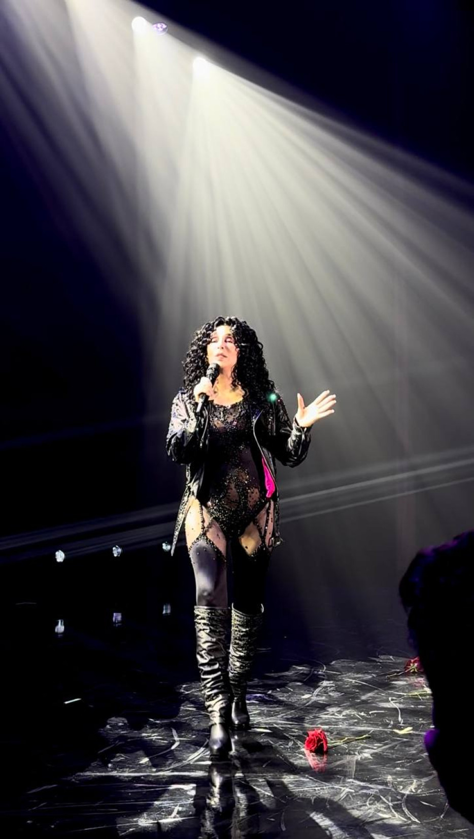 It was just after midnight as Cher appeared on the scene looking dazzling, performing her hits “Believe” and “If I Could Turn Back Time” in a sparkly leopard, knee-high black boots and not much else — pretty much the same outfit as for the legendary 1989 video for that same song, which she filmed on a US Navy battleship, surrounded by dozens of sailors.