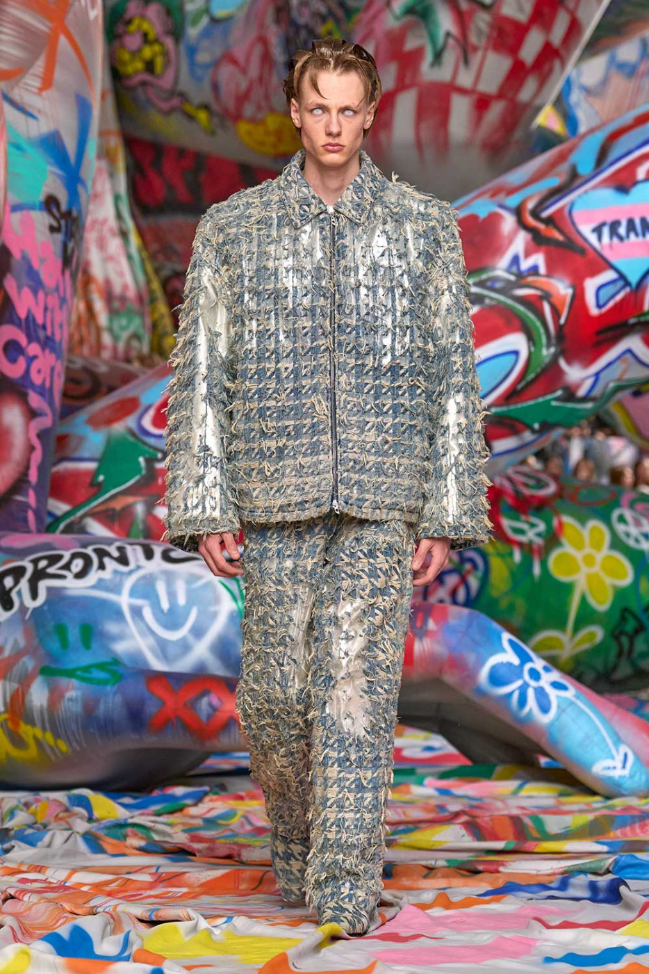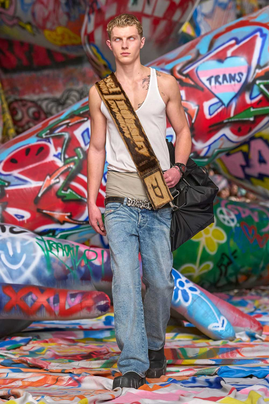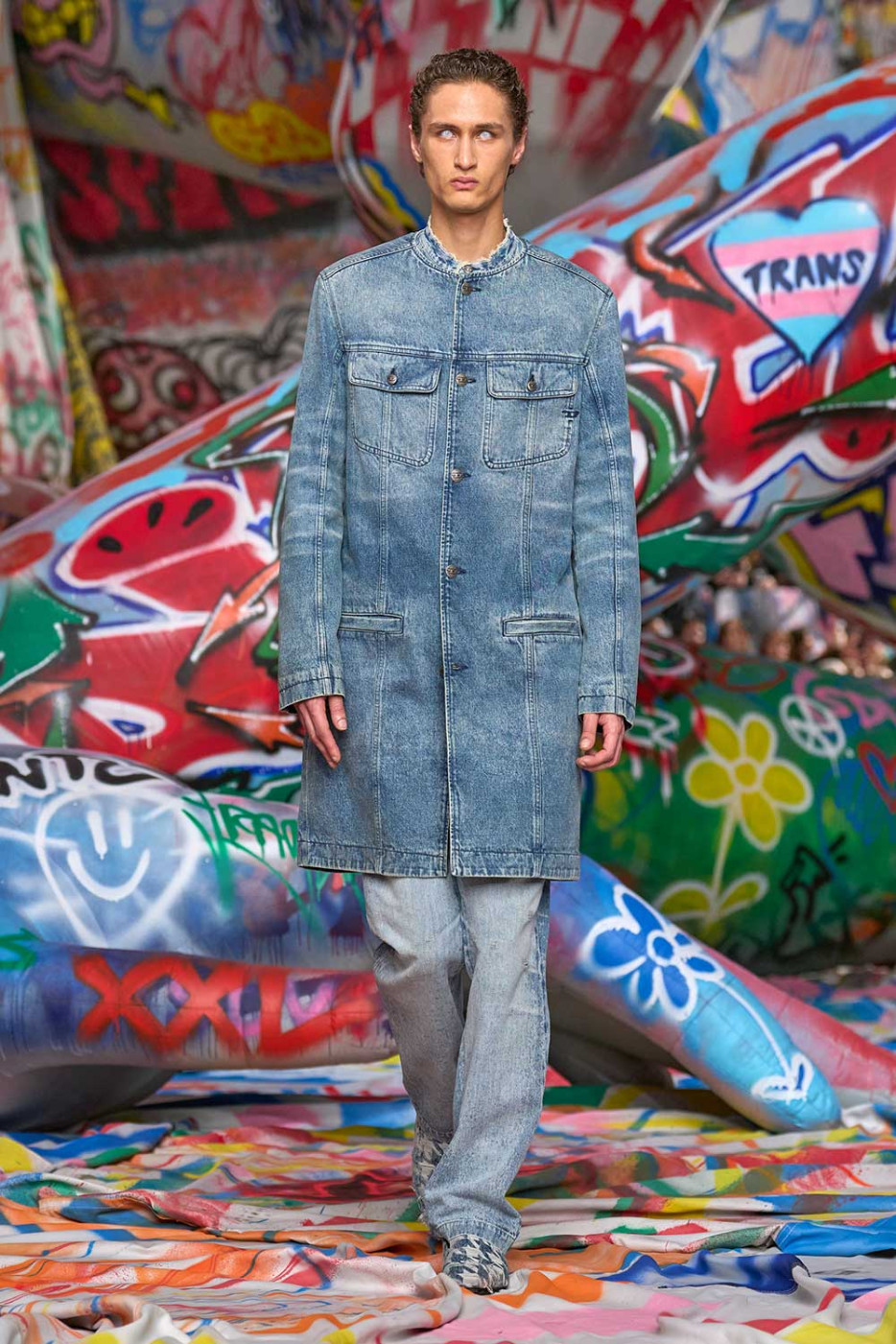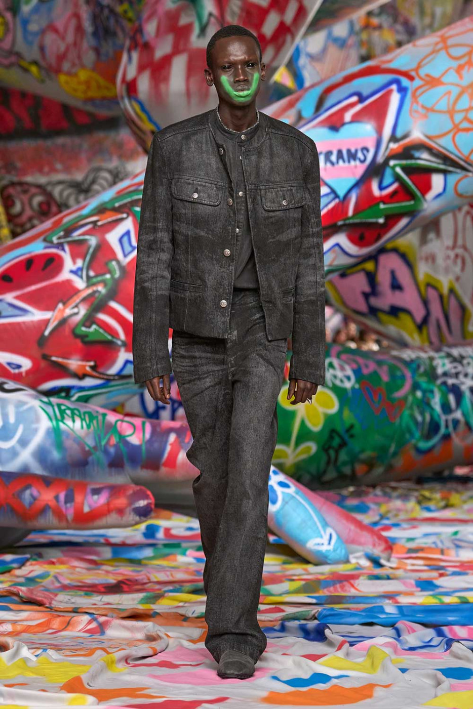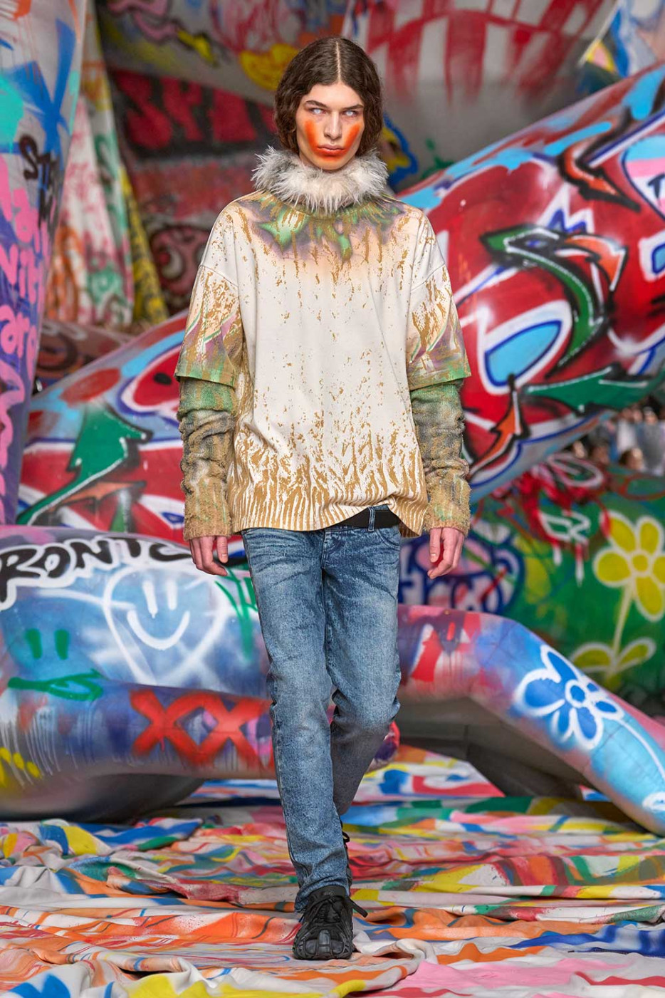 The venue for Diesel’s show felt like an immersive, mesmerizing universe. In the past, the brand has stacked 200,000 boxes of condoms and spread 14,800 kg of denim scraps across the space.This season is held in the biggest ever known graffiti installation, with over three kilometers of graffiti fabric, made by a global street art collective of around 7.000 of amateur and expert graffiti artists.