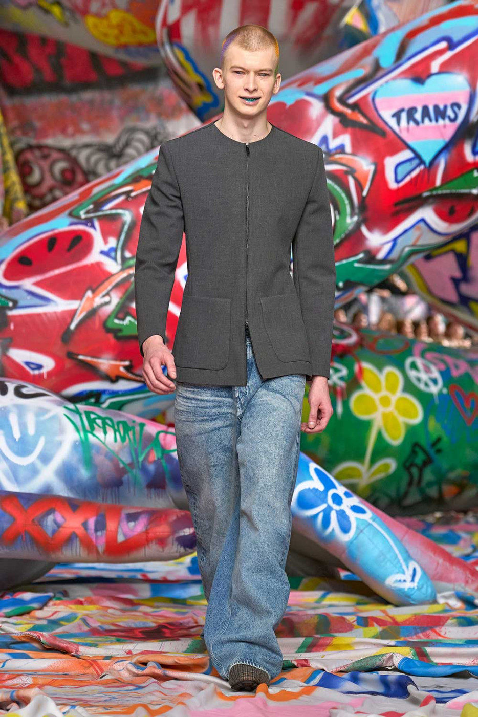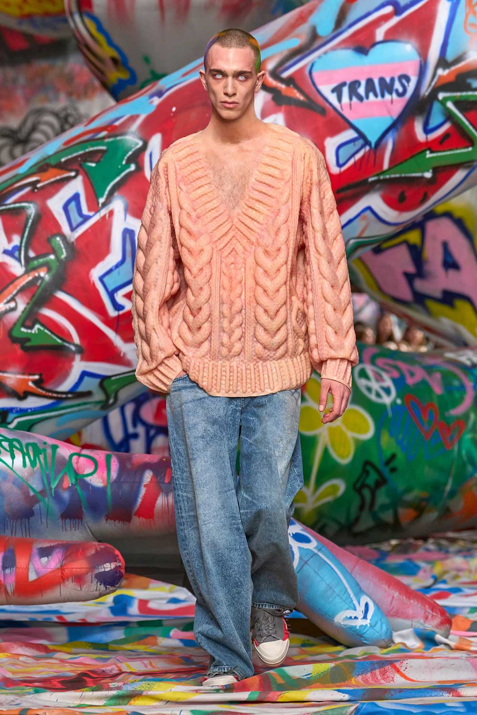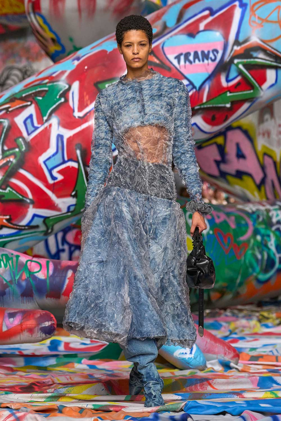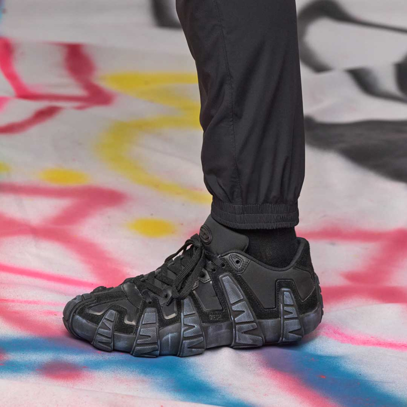 The venue for Diesel’s show felt like an immersive, mesmerizing universe. In the past, the brand has stacked 200,000 boxes of condoms and spread 14,800 kg of denim scraps across the space.This season is held in the biggest ever known graffiti installation, with over three kilometers of graffiti fabric, made by a global street art collective of around 7.000 of amateur and expert graffiti artists.