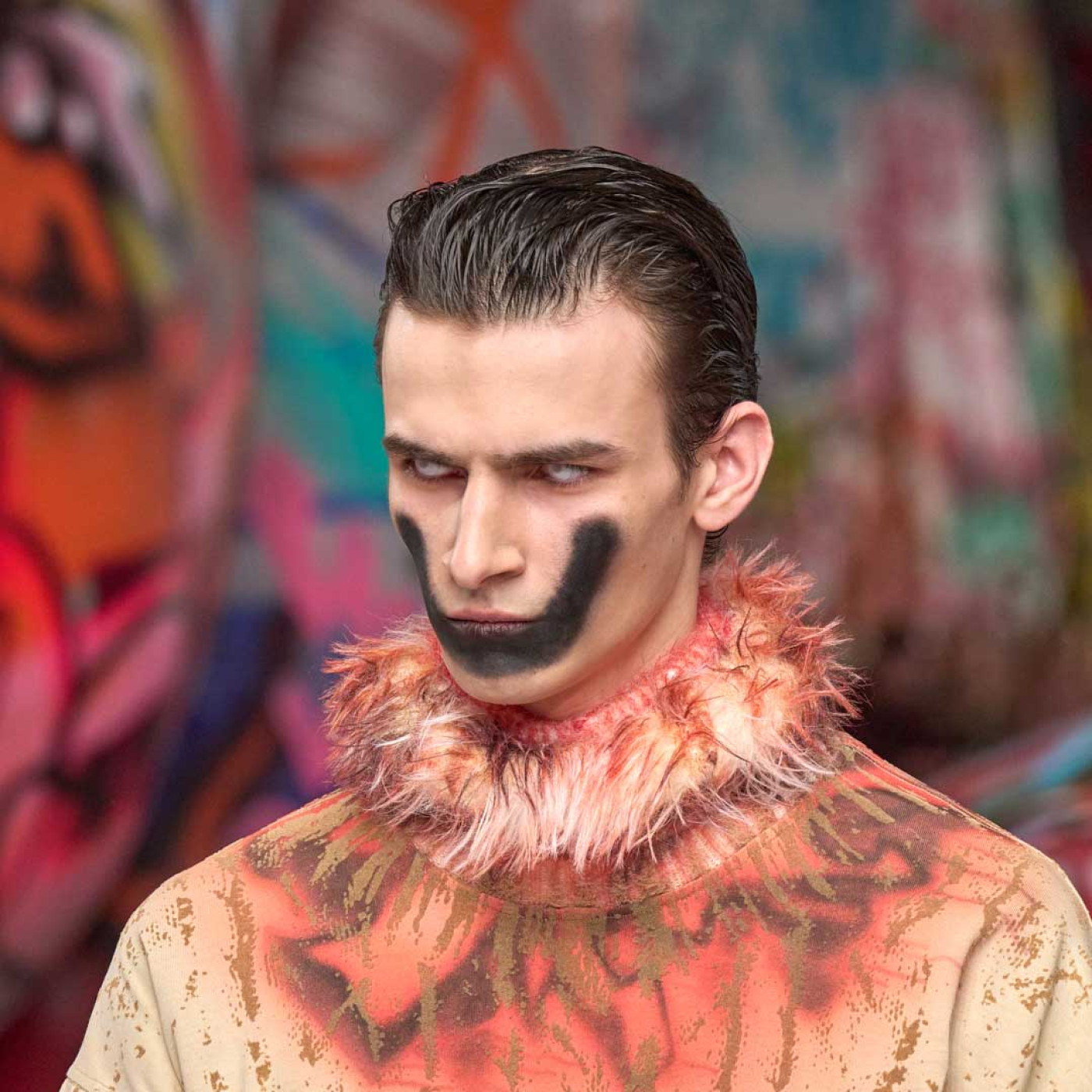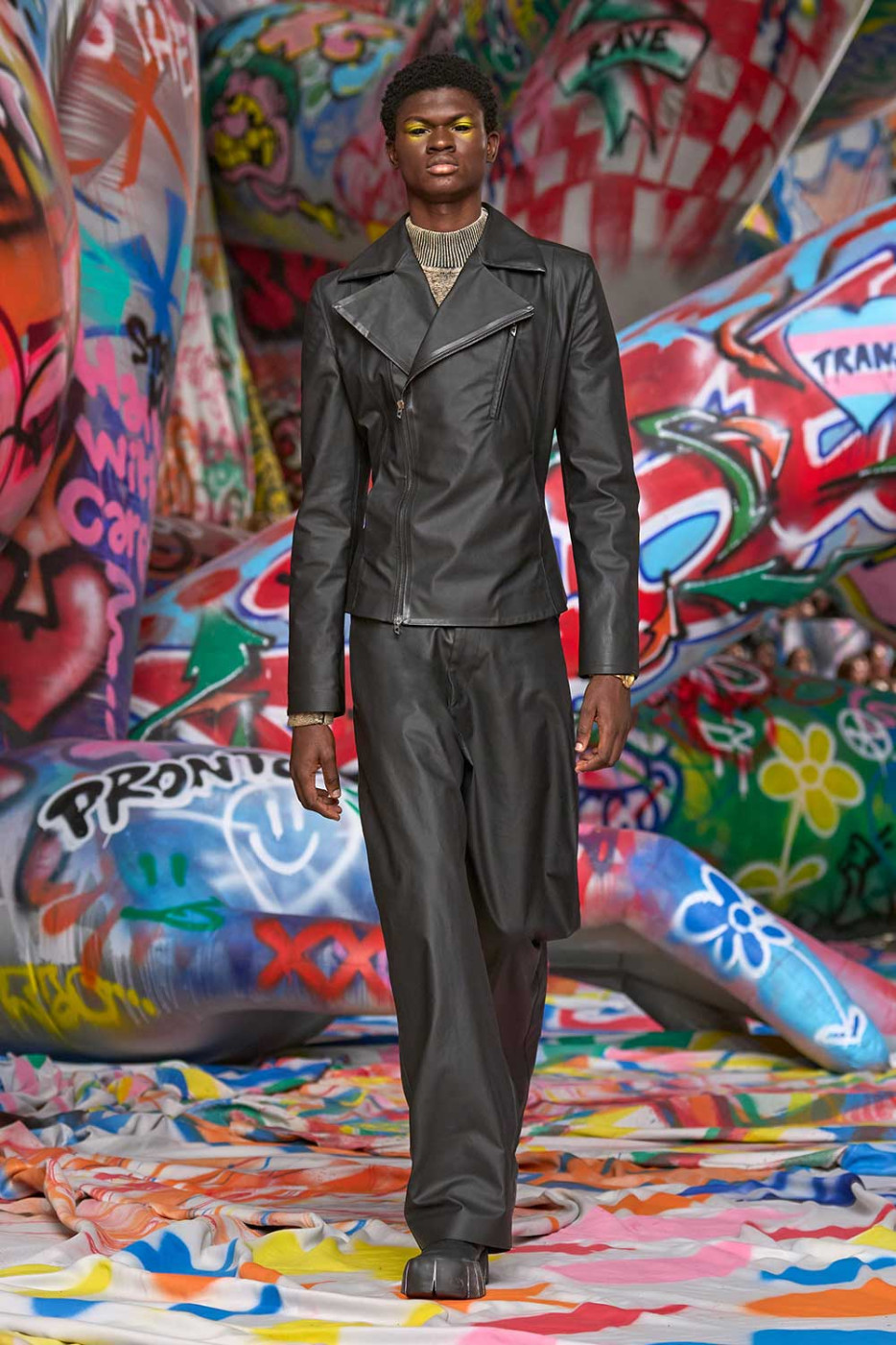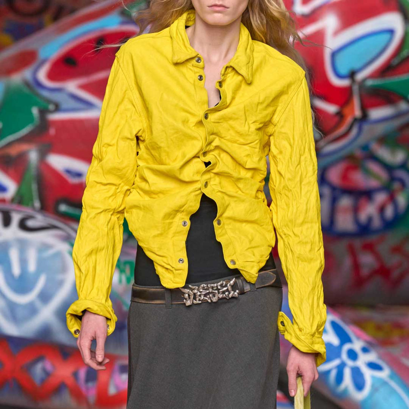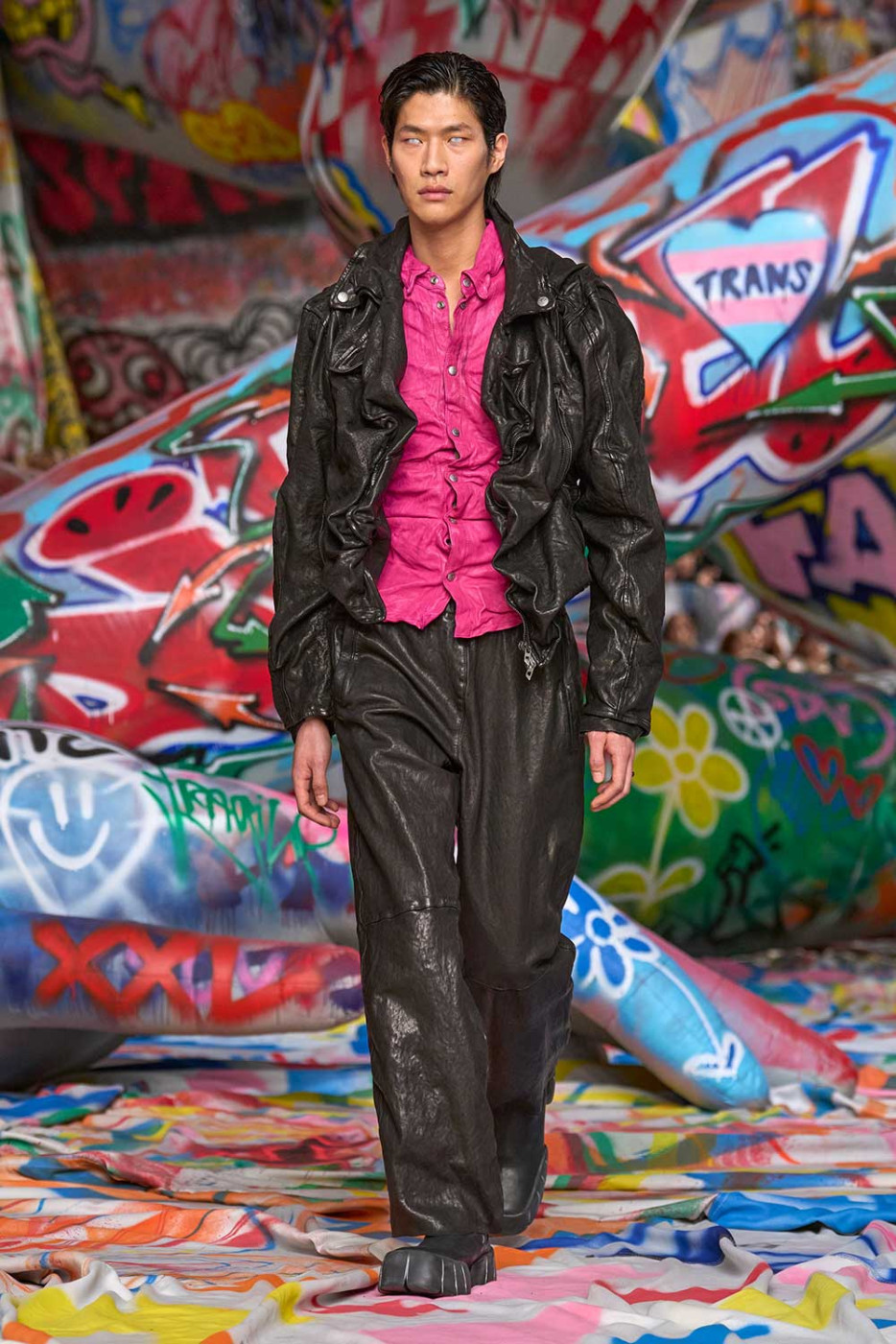 Techniques often reserved for haute couture, such as ruffles, were reimagined in acid-colored bandeaus, wrap dresses, and an orange jacket. The boiled knit and leather jackets, distorted with crinkled and permanently wrinkled embellishments, feature clever tricks achieved through shrink-wrap finishing. Paired with Joker-inspired makeup, they exude an eerie charm that sets them apart from the rest.