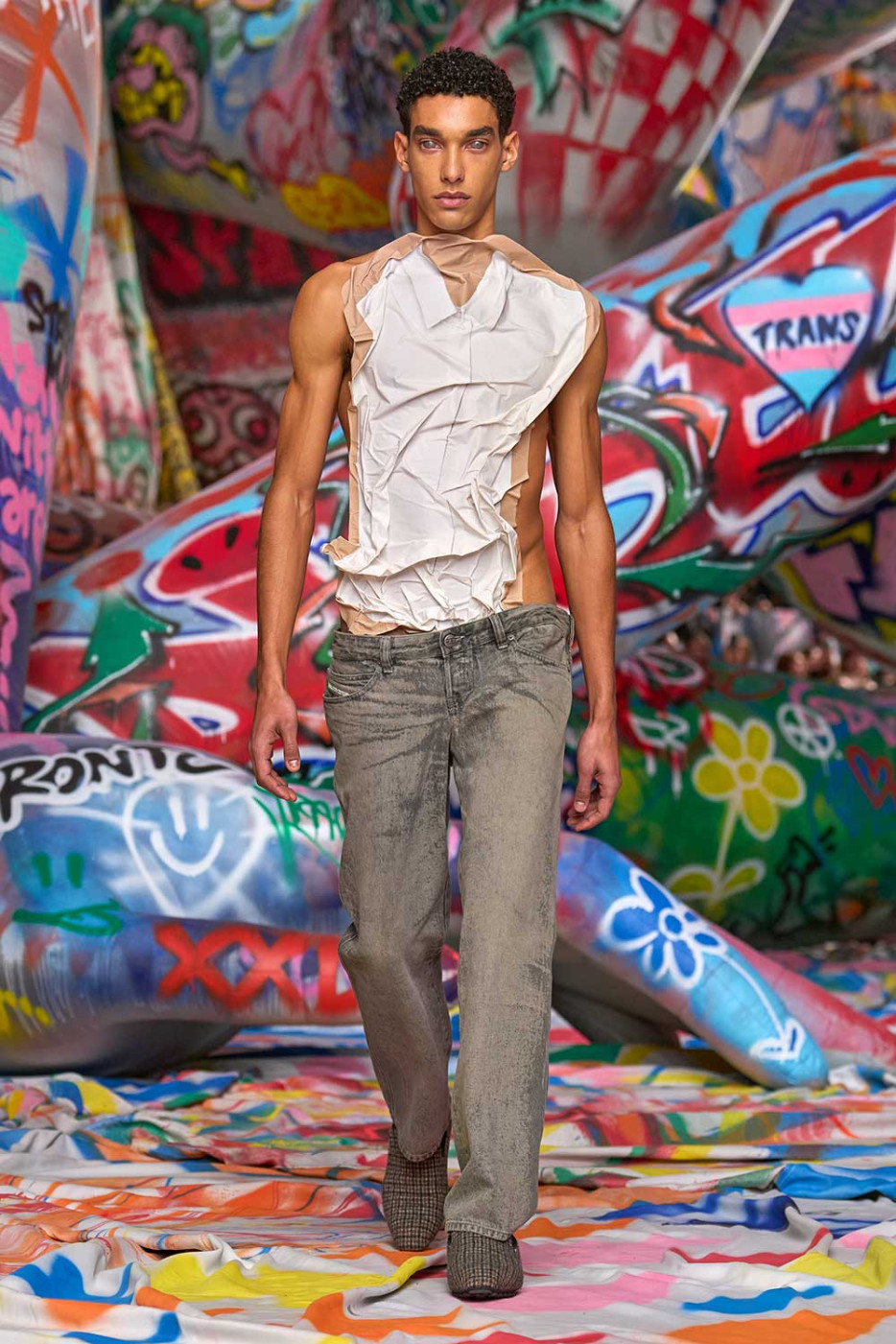 By positioning denim—the ultimate symbol of rebellion—at the forefront, Diesel wiped out all elements of rigid dress codes. By satirizing traditional formal fabrics, the collection shattered the industry's unspoken boundaries, creating a sense of otherness while clearly asserting its vision of "fashion democracy.” With thought-provoking, artistic textiles and an unprecedented sense of freshness, this was undoubtedly Glenn Martens’ most creative and groundbreaking Diesel collection to date.