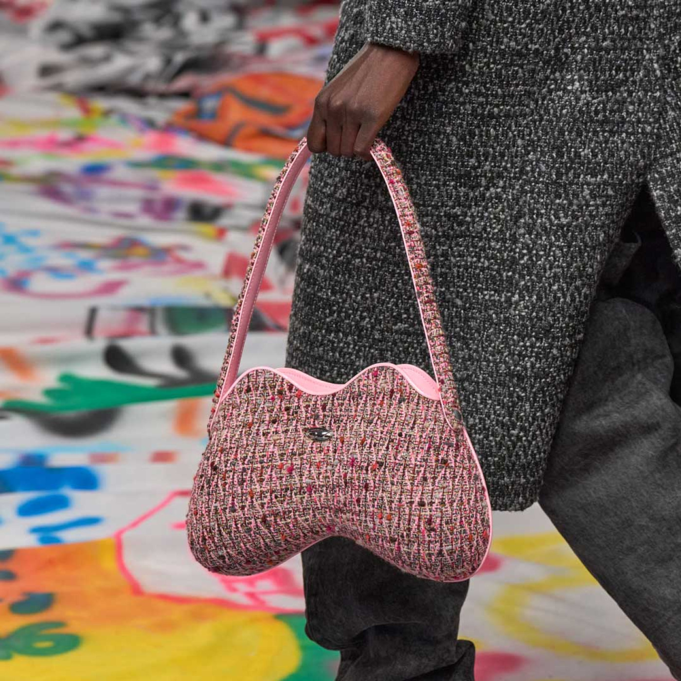 This season, Diesel’s collection, championing the concept of “fashion democracy,” felt like a provocative manifesto against the elite. The first look featured a cropped, collarless bouclé jacket paired with a denim corset and jacquard hot pants. Reminiscent of Coco Chanel’s iconic tweed suit, Diesel reinterpreted it with washed black denim peplums, cummerbunds, and skirts, democratizing the classic silhouette in its own way. The tweed skirts, at times worn so low they seemed to slip off. Traditional couture-inspired formalwear, a staple of high society, was reconstructed in grunge-infused denim jacquard, creating an extreme high-low remix—an audacious statement that seemed to raise a middle finger to hierarchies.