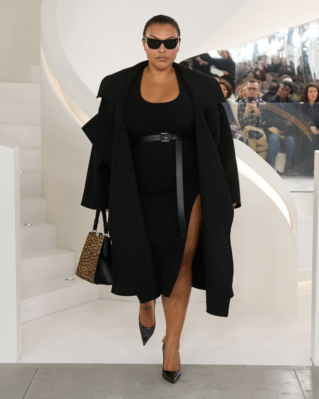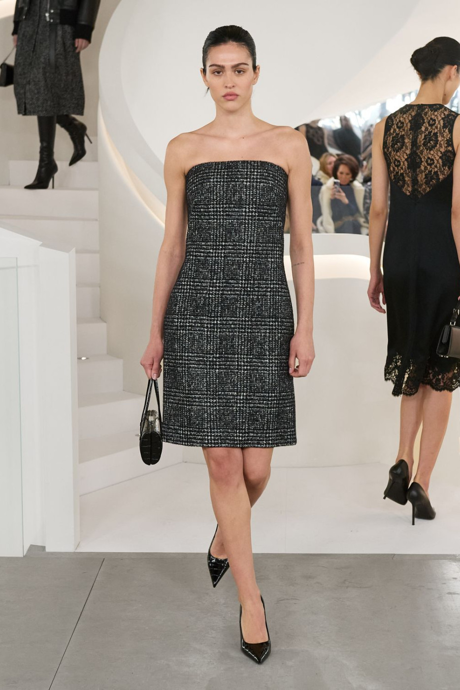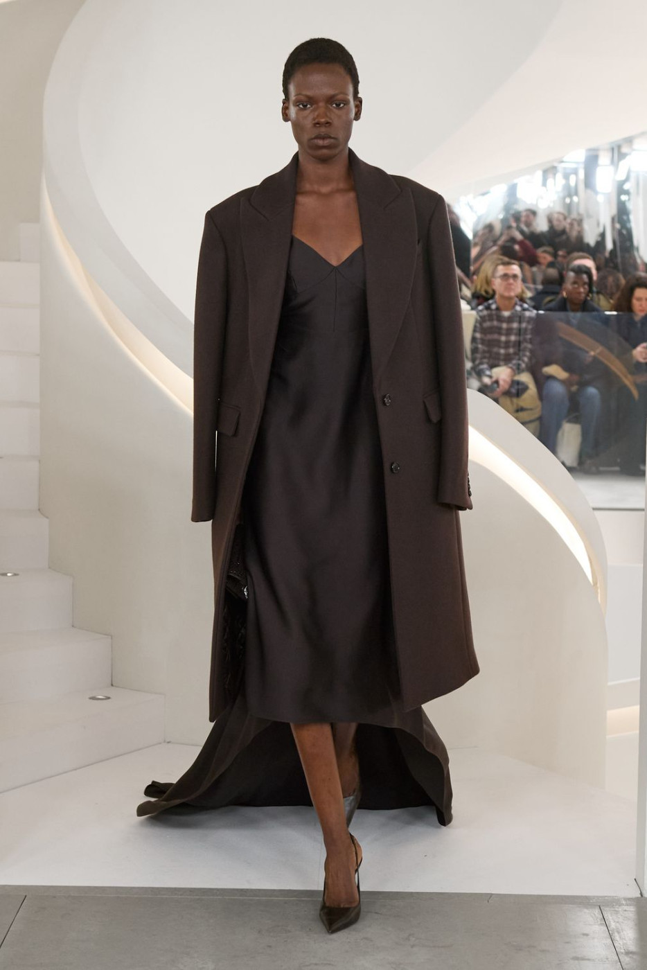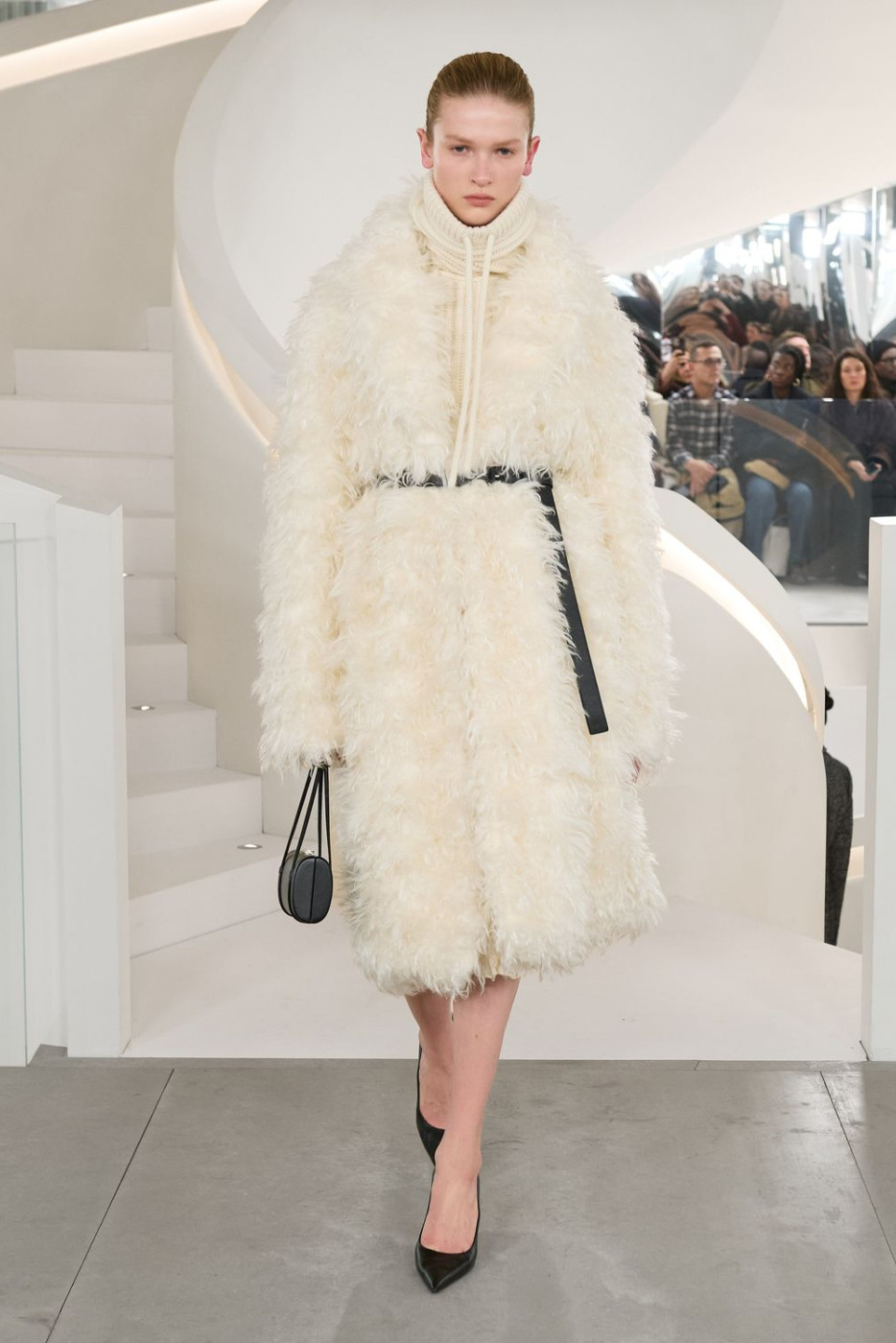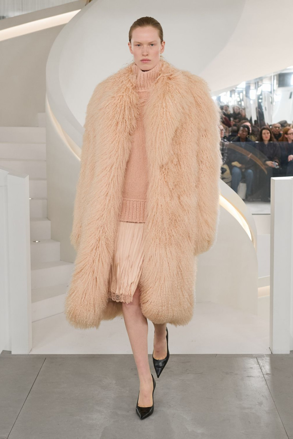 The collection was rich in curvy tailoring, white and blue shirts and pencil skirts - aspirational-but-grounded perfect ensembles for a day in between the meetings with business partners. But there were also amazing silhouettes for a night out in the City with friends, like little black dresses with lace details, silk slip dresses in gray and sequined turtleneck gowns. In need of chic frocks for a family brunch uptown? Enjoy casual chunky oversized sweaters styled with guipure skirts and flat sleek pumps. Or denim bias-cut skirts styled with knitted hoodies. And then there were also all types of dramatic outerwear. Highlights included tailored tweed coats, leather jackets adorned with hints of shearling details, lousy black and camel trenches, signature leopard coats and XXL cozy hooded fur coats.