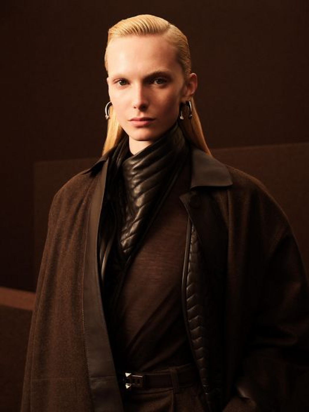 Titiz ve koruyucu olmak, tüm Hermès estetiğinin tanımlayıcı özellikleri olarak görülebilir: bu nitelikler, seyahat ve binicilik tutkusuyla birlikte evin temelini oluşturur. Muhtemelen bu temalara bir şekilde atıfta bulunmayan tek bir koleksiyon yoktur. Örneğin, bu sefer yün astarlı bol deri ceketler yanlardan düğmelerle tutturulmuştu — atlılardan esinlenen bir ayrıntı, çünkü bu tutturucular bir bacağın atın krupunun üzerinden sallanmasını kolaylaştırıyor.