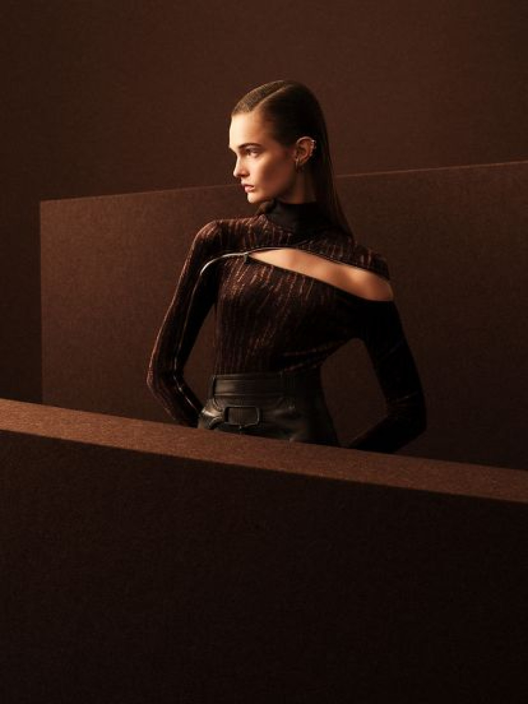 Hermès FW2025 koleksiyonu, vücuda yakın bir iç katman ve gevşek bir dış katman içeren katmanlı silüetiyle korumayı vurgular. Çoğu kıyafetin temelini oluşturan örgüler özellikle dikkat çekicidir. İpek ve kaşmir karışımından yapılmış ince taytlar, yuvarlak yakalı ve balıkçı yakalı kazaklar sadece giyilmekle kalmaz, aynı zamanda bele bağlanarak veya omuzlara çok sayıda katman halinde atılarak yaratıcı bir şekilde şekillendirilir. Deri ve koyun derisi paltolarla eşleştirilen bu takım, şık bir görünümü koruyan koruyucu konforun özünü yakalar. Klasik Hermès binicilik botlarından esinlenen ancak üstte kayış olmadan yeniden tasarlanan ve özellikle canlı kırmızı renkte daha keskin bir buruna sahip olan yüksek çizmeler, podyum görünümlerine ekstra bir hava katar.