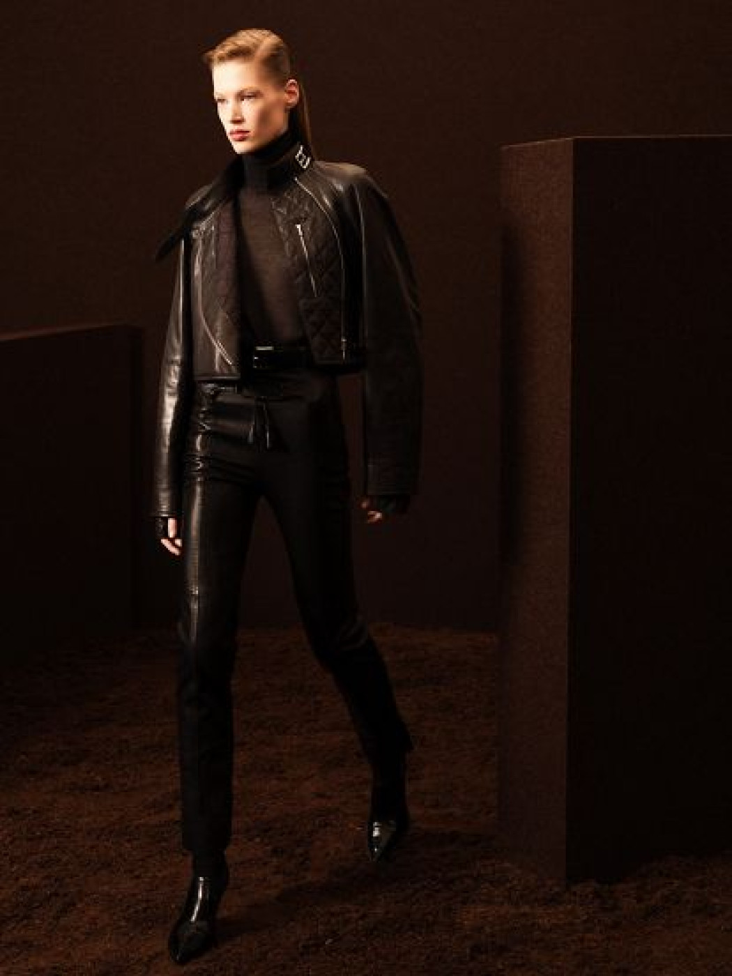 2025 kış koleksiyonunda paltolar, ceketler ve tabii ki pantolonlar dahil olmak üzere önemli miktarda deri yer alıyor. Ancak, kapitone olanlar da dahil olmak üzere çeşitli versiyonlarda sergilenen deri mini şortların yanı sıra dar ve kolsuz olan kapitone deri elbiseleri de vurgulamak istiyoruz. Bu elbiseler, dirseklerde deri yamalar bulunan ayrı kaşmir kollarla eşleştirildi. Malzemeler ve işçilik açısından en etkileyici parça, hafif Brisa koyun postu üzerine monte edilmiş volkanik gri ipek gabardinden çift taraflı bir pelisse idi. İlk bakışta, ipek gabardin, dışa çevrildiğinde özellikle lüks görünen koyun postuyla tezat oluşturan yüksek teknolojili su geçirmez bir kumaştan yapılmış gibi görünüyor.